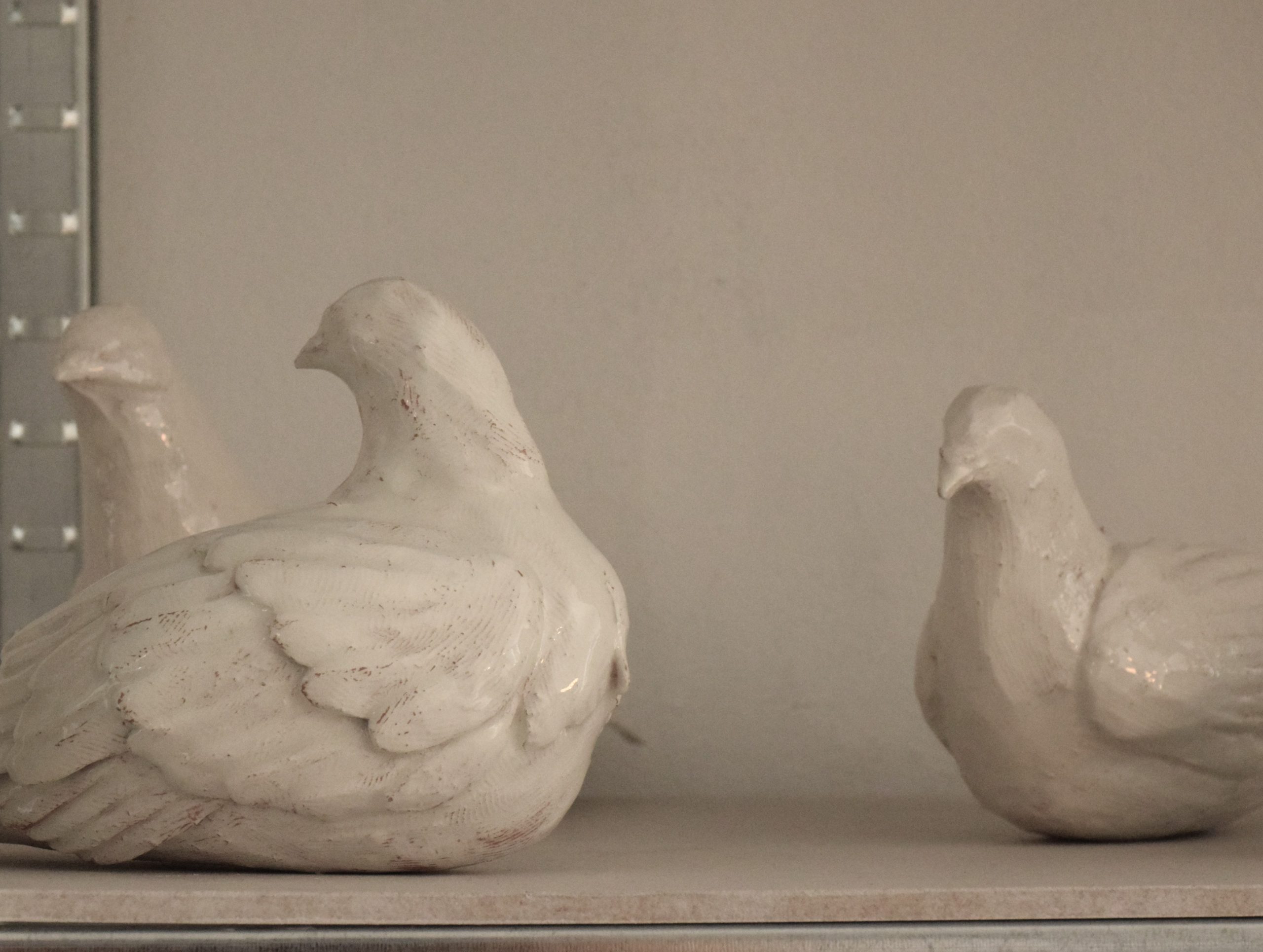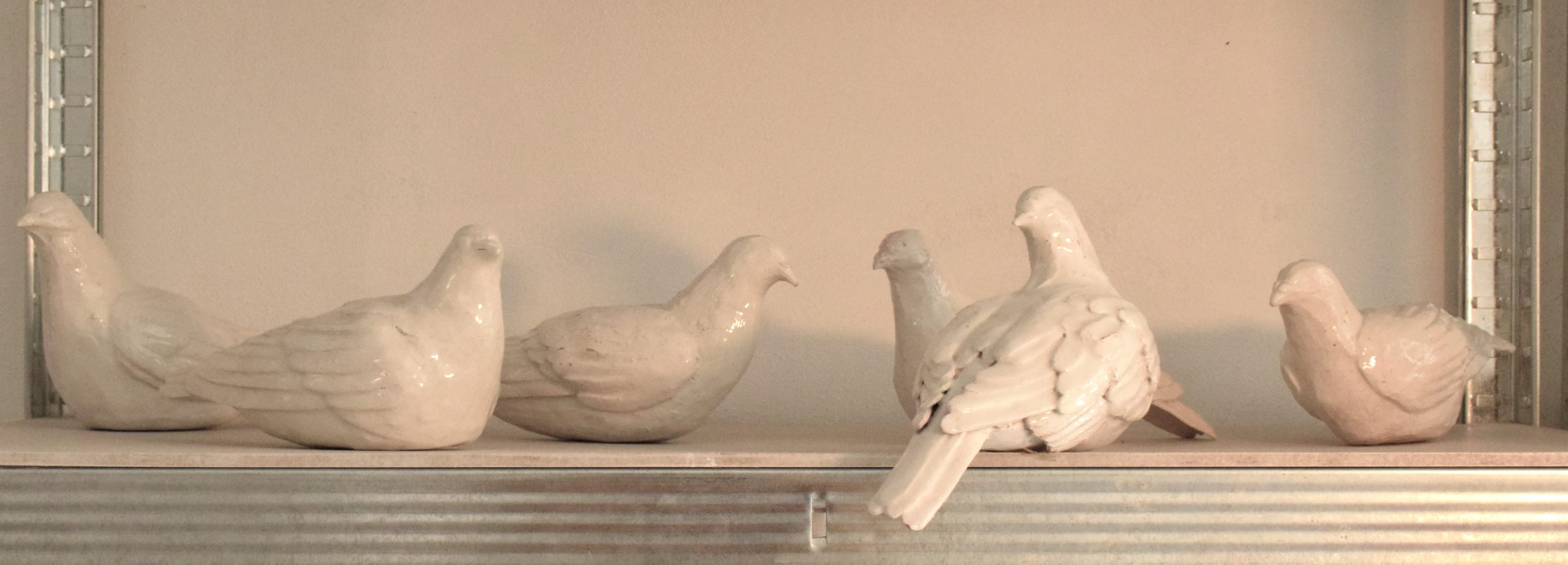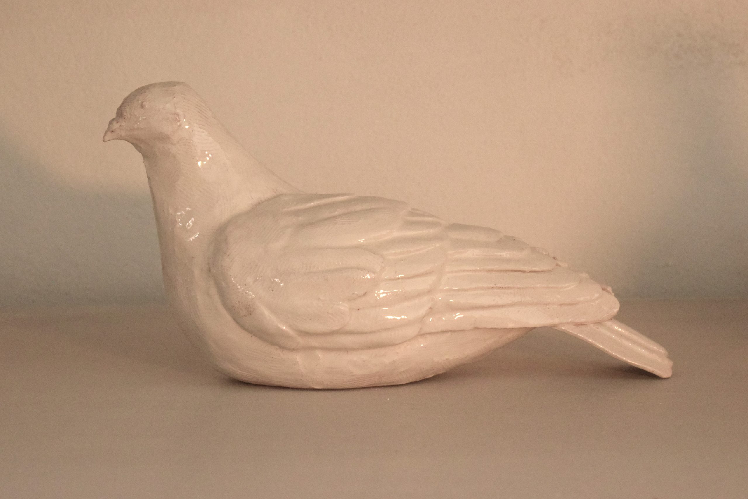 Questo piccione appartiene ad una serie di sculture realizzate per un’installazione. Sono invadenti, fastidiosi, entrano nei locali, salgono sulle statue, gli edifici, i davanzali, ovunque sentano un po' di tepore o dove ci sia un po' di cibo. Siamo abituati a vedere il piccione come qualcosa di sporco, di polveroso, da cacciare e tenere lontano dalle case. In questa scultura l’immagine del piccione è ribaltata, non siamo noi vittime degli sfacciati piccioni ma sono loro le vittime del cambiamento che ha prodotto l’uomo sull’ambiente. Allontanati dalla terra sono ora bianchi simbolo di un equilibrio che è stato modificato e che resta indelebile. Il piccione è stato realizzato in argilla rossa, argilla bianca e cristallina trasparente, occupa una superficie di ventitré centimetri di lunghezza per nove di larghezza e dodici di altezza. Il “Piccione” è un pezzo unico, non esiste una copia identica per forma, dimensione e colore all’originale.