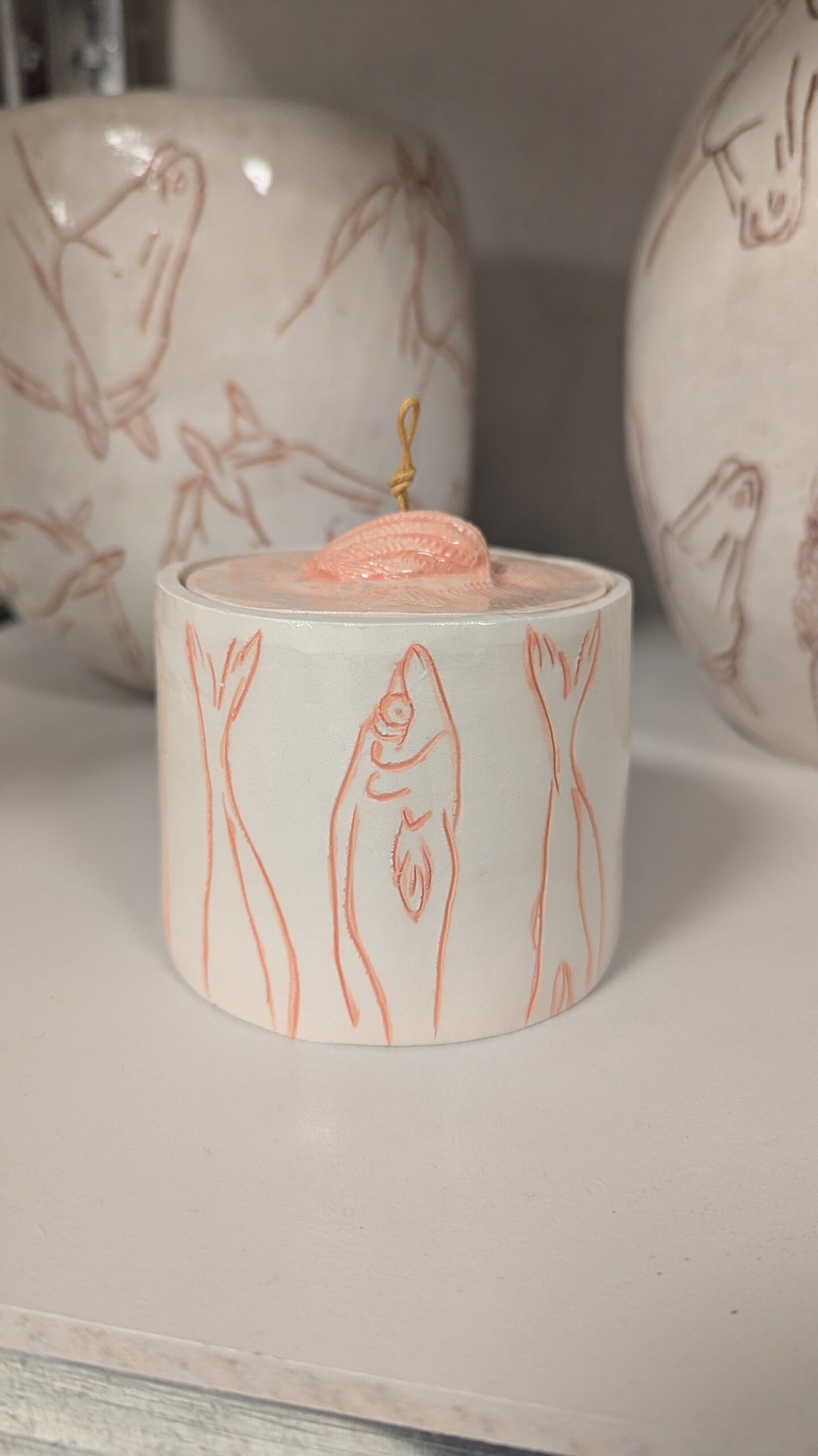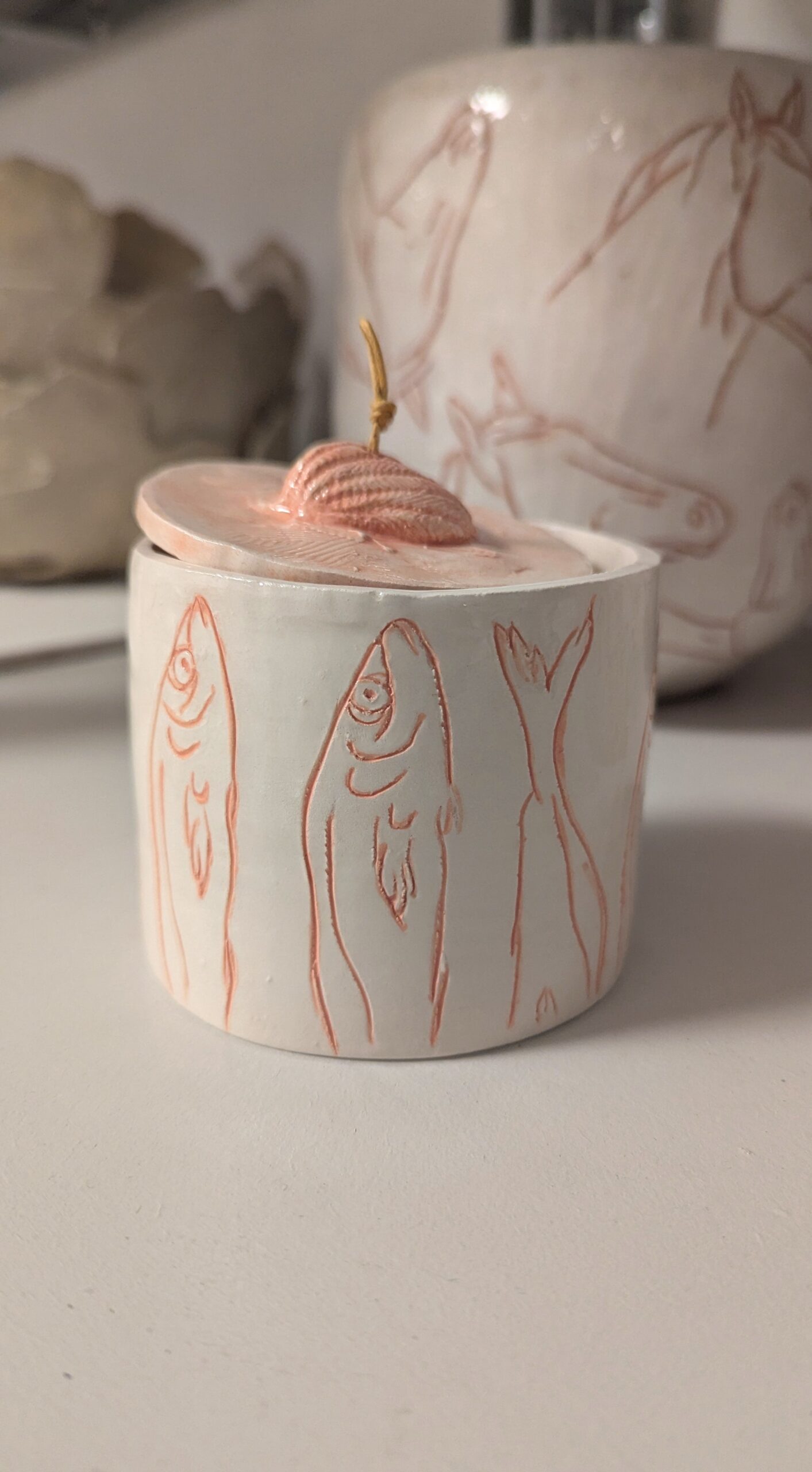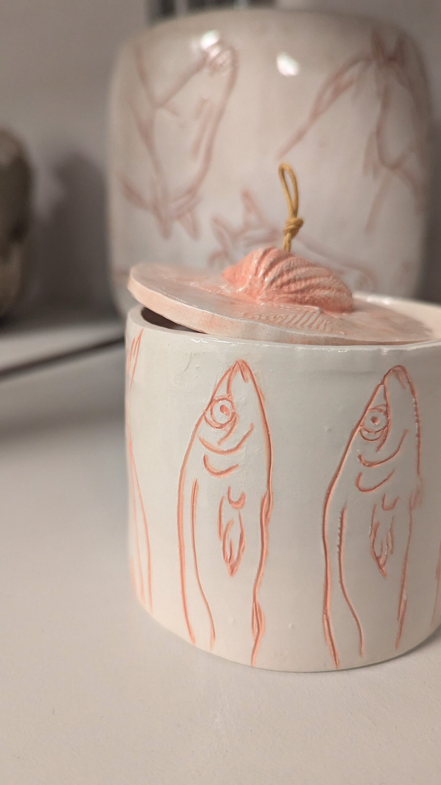 La scatoletta è stata realizzata incidendo la terra e nel solco creato è stato messo in un secondo momento il colore. Sono frammenti, la stessa immagine ripetuta, un attimo che resta indelebile. È un’idea nata dal desiderio di liberare i pesci, in questo caso delle acciughe, dall’interno della scatola e spostarle all’esterno, dando loro una nuova vita. Da cibo contenuto all’interno di un contenitore, diventano loro stesse scatolette. Si ribalta la sorte delle acciughe che, una volta aperto il coperchio, non sarà una fine ma un inizio. Ogni disegno è stato inciso a mano, sono cinque acciughe divise a metà che ricoprono un diametro di nove centimetri e un’altezza di sette centimetri. La “Scatoletta con pesci” è un pezzo unico, non esiste una copia identica per forma, dimensione e colore all’originale.