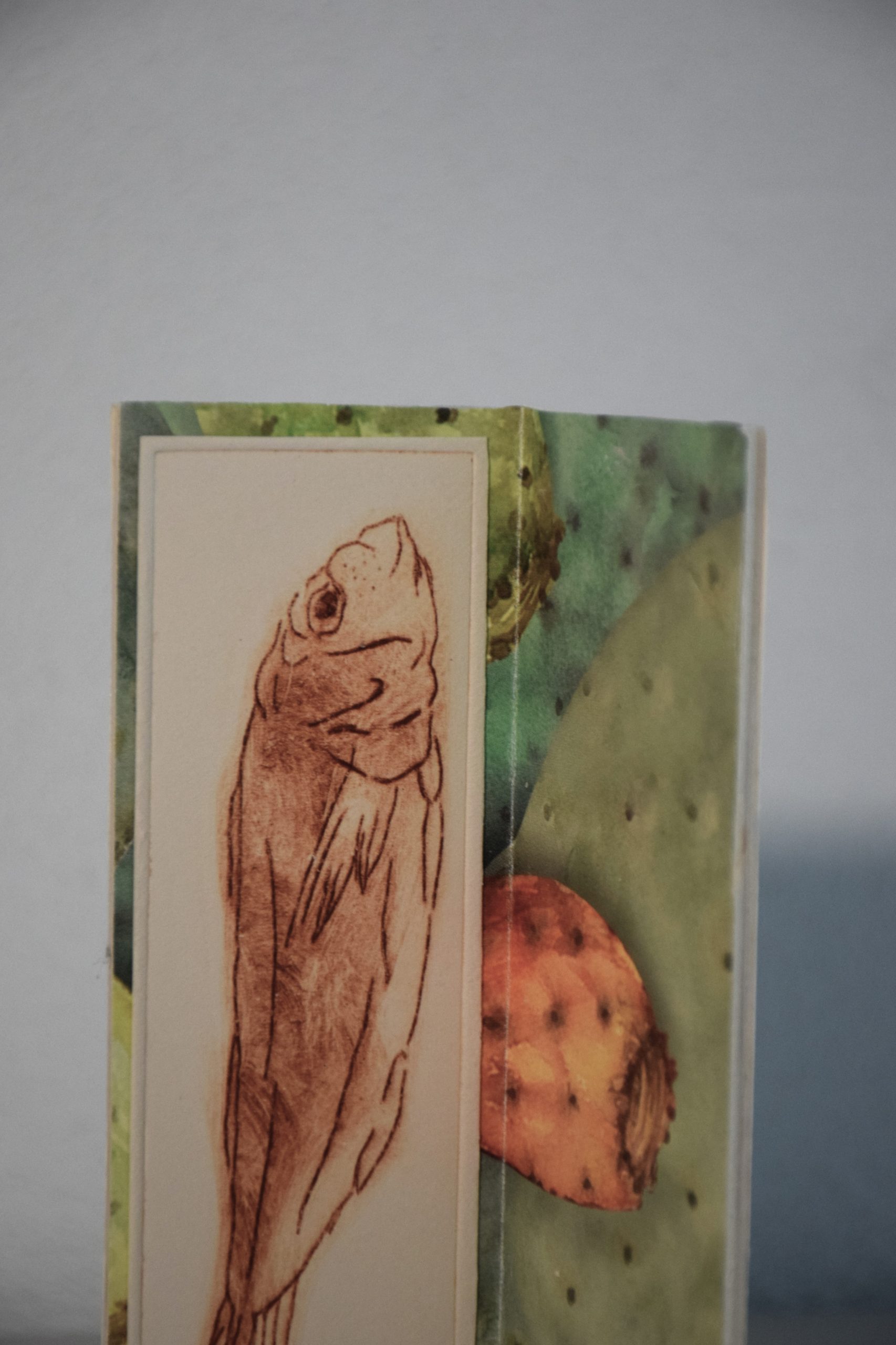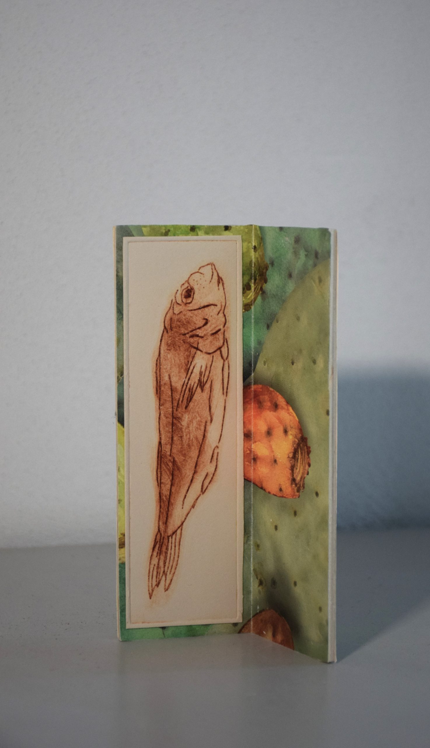 Sono opere libere di potersi muovere nell’ambiente, di essere manipolate, possono restare chiuse, aperte, possono essere spostate in diversi luoghi, viaggiare nelle tasche. L’idea del quadro da tasca è nata per liberare il quadro dal vincolo della parete e avvicinarlo alle persone, creando qualcosa di piccolo che può essere tenuto in mano. È stato realizzato con carta decorata, legno e come protagonista un’incisione a puntasecca che raffigura una triglia. È un pezzo unico, non esiste una copia identica per forma, dimensione e colore all’originale.