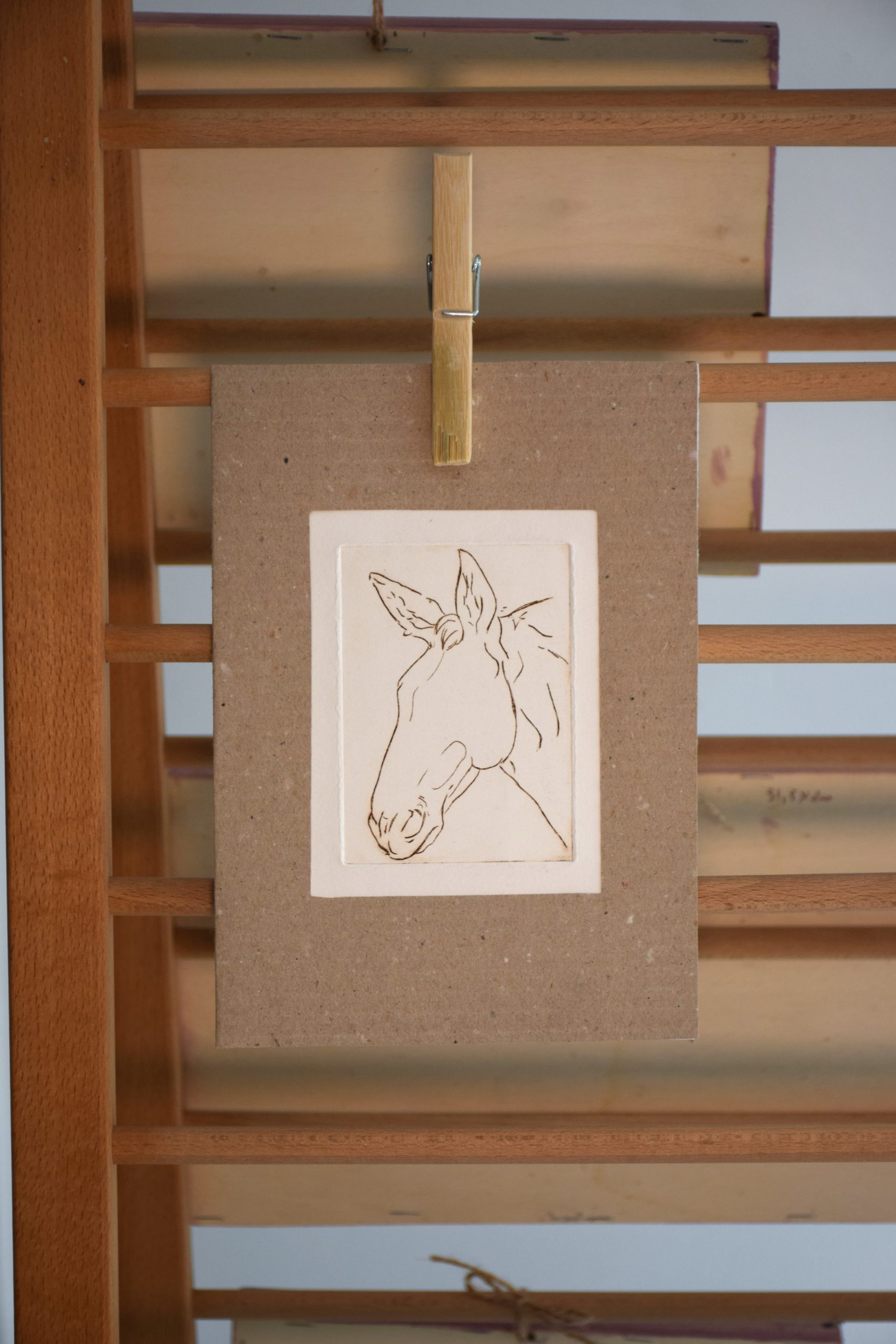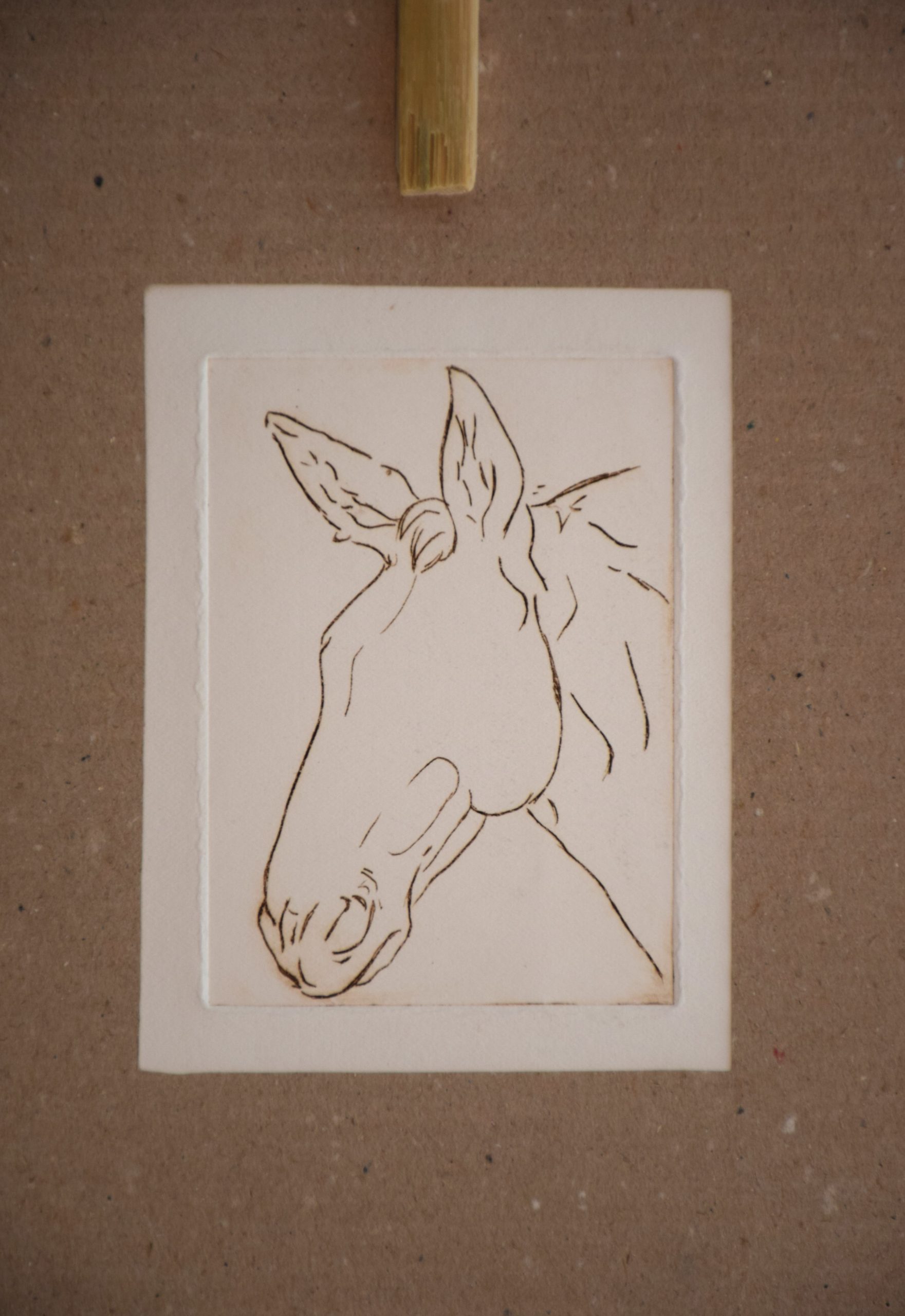 L’incisione a puntasecca è una tecnica grafica che consiste nel graffiare con una punta affilata un supporto morbido come ad esempio il rame, il plexiglas o lo zinco. Una volta disegnata o meglio graffiata la tavoletta può essere inchiostrata e stampata sulla carta con l’aiuto di un torchio. Questa tecnica permette di riprodurre la stessa immagine incisa un certo numero di volte che vengono riportate dall’artista in fondo alla stampa ad esempio 1/50 ovvero stampa prima su cinquanta copie. Queste stampe non hanno un numero di tiratura perché ogni esemplare è unico in quanto si interviene sulla matrice, prima della stampa, lasciando dei residui d’inchiostro in alcuni punti realizzando delle stampe che non si possono riprodurre.