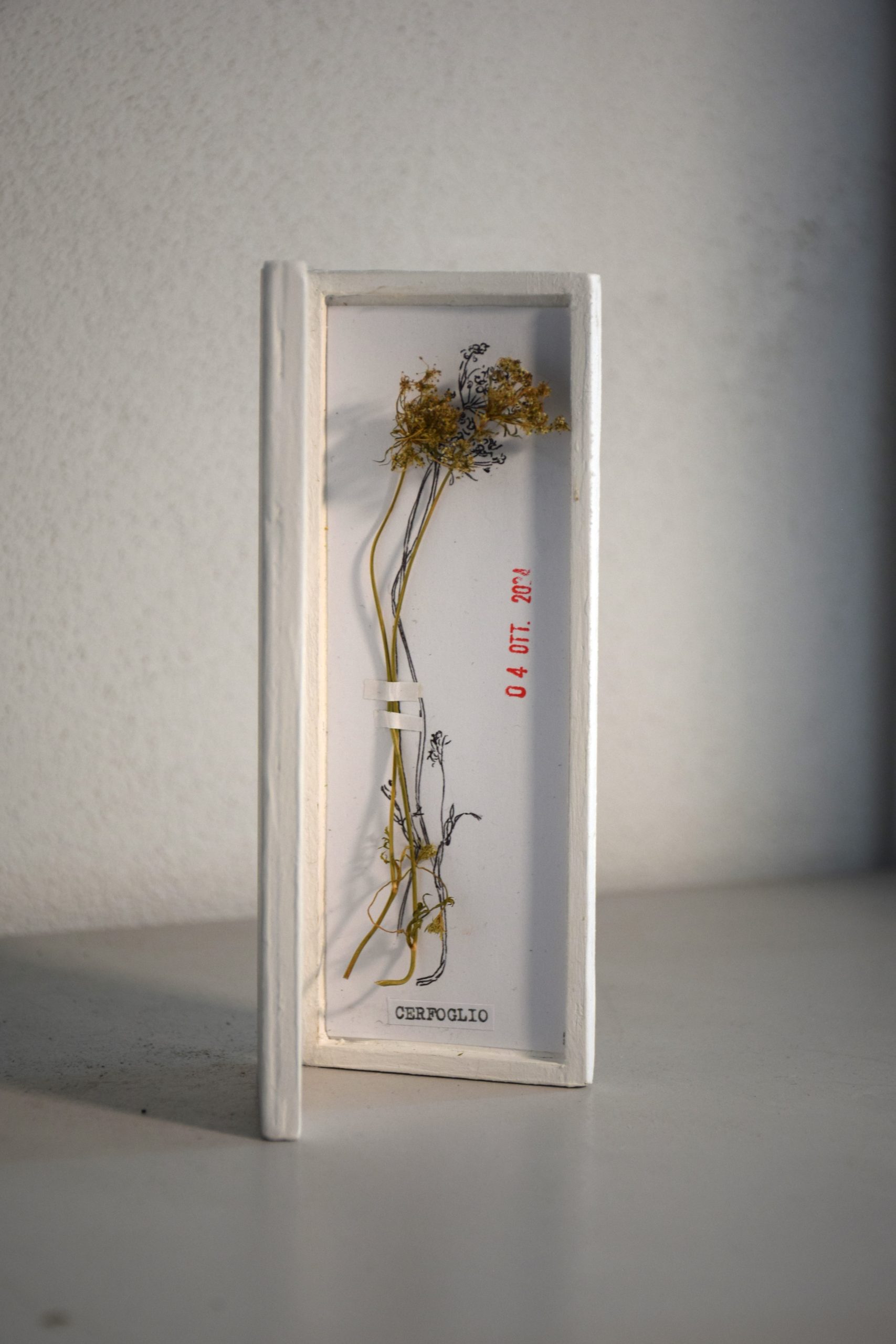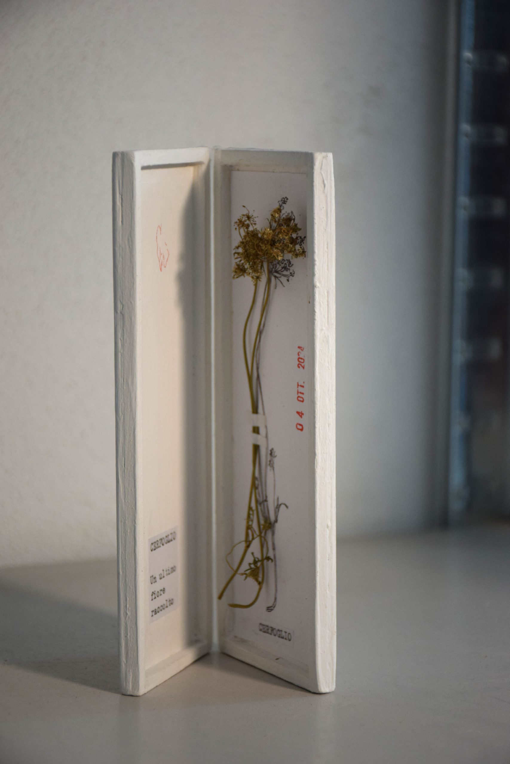 Sono opere libere di potersi muovere nell’ambiente, di essere manipolate, possono restare chiuse, aperte, possono essere spostate in diversi luoghi, viaggiare nelle tasche. L’idea del quadro da tasca è nata per liberare il quadro dal vincolo della parete e avvicinarlo alle persone, creando qualcosa di piccolo che può essere tenuto in mano. Questo quadro racchiude al suo interno un erbario. Il fiore o le erbe raccolte, prima di essere fermate sul supporto, vengono ritratte con la penna sulla carta. L’ombra, ovvero il disegno, non subirà le modifiche del fiore, che con il tempo inizierà a piegarsi o a perdere i petali e rimarrà sulla carta come simbolo dello scorrere del tempo