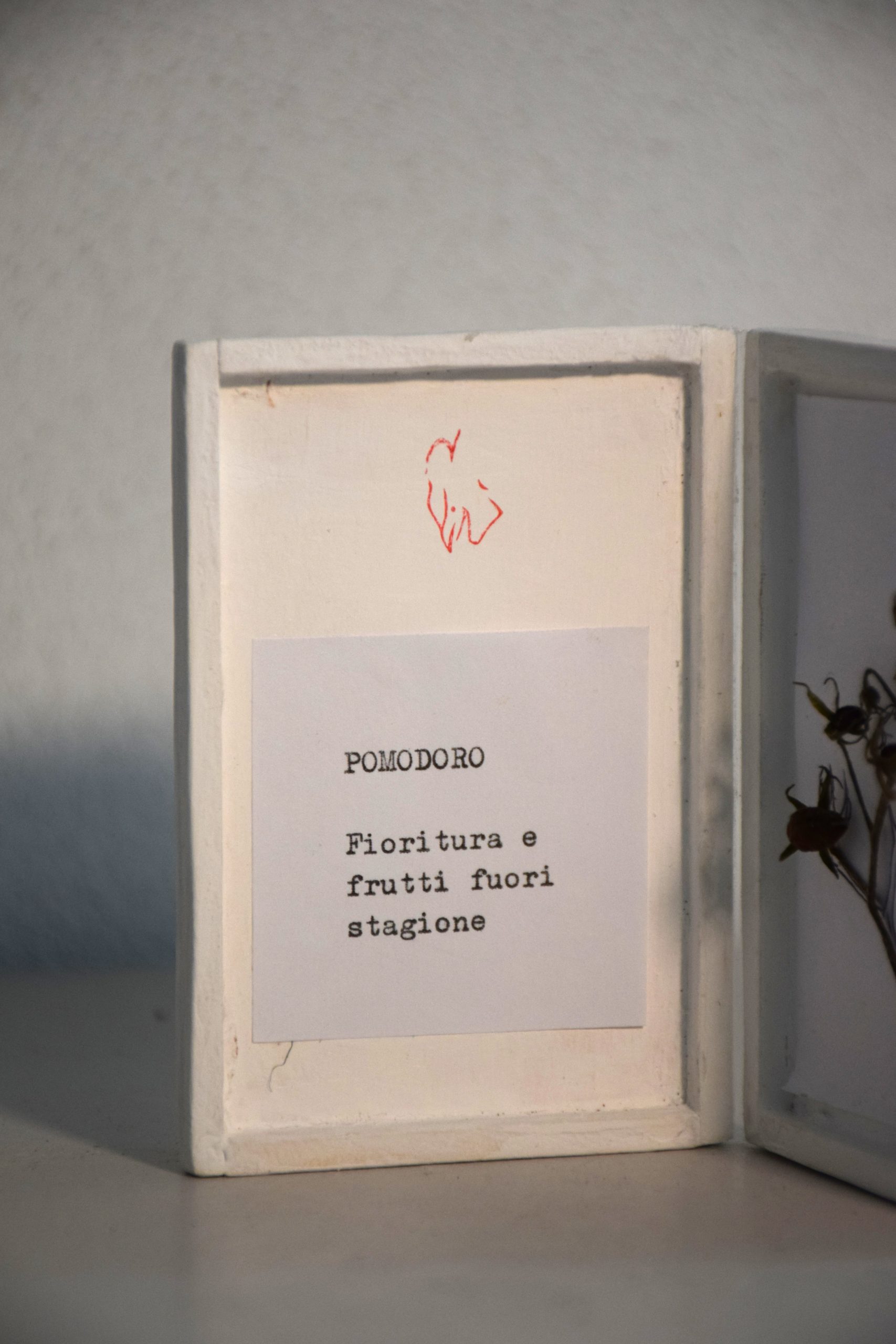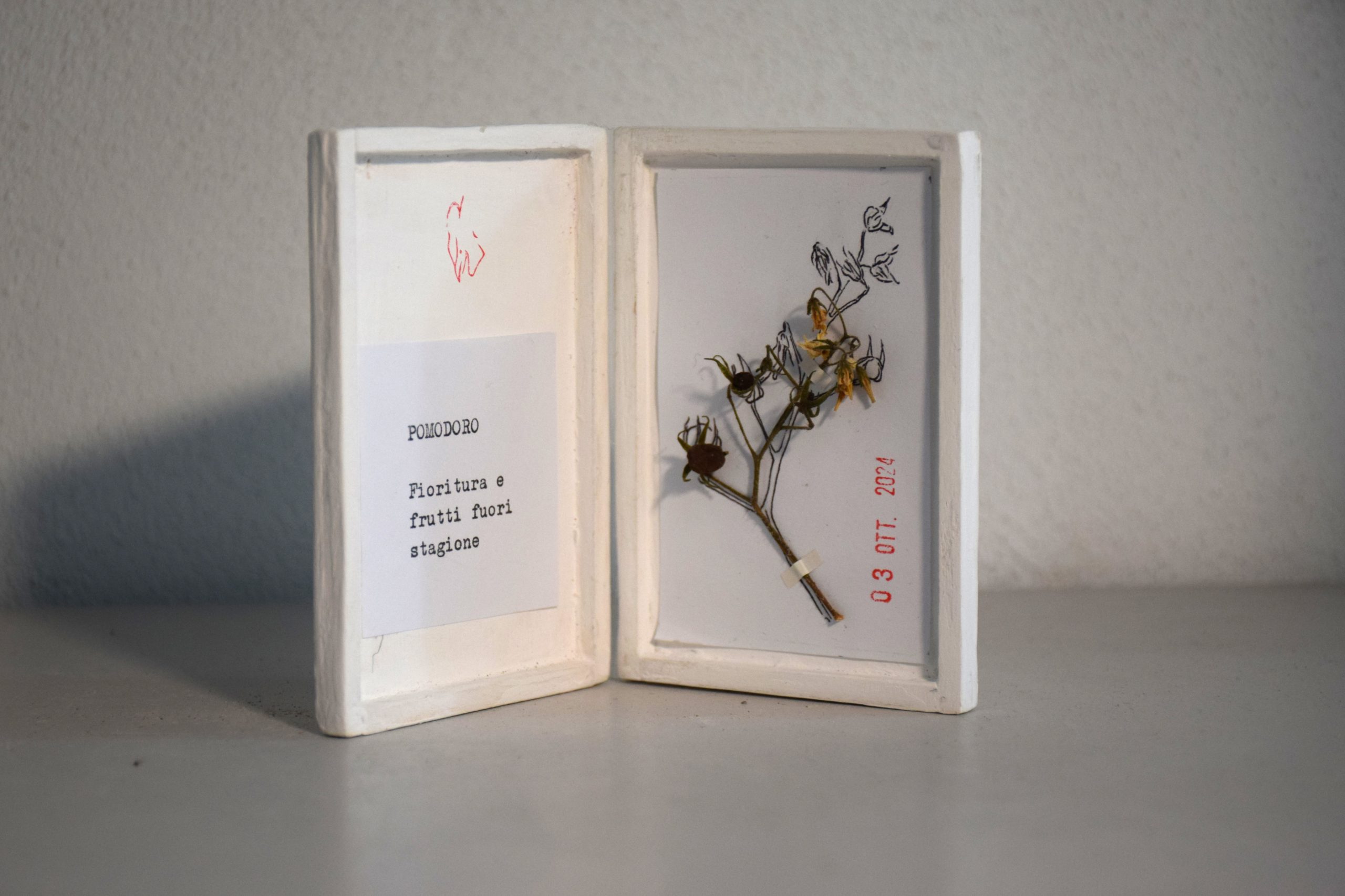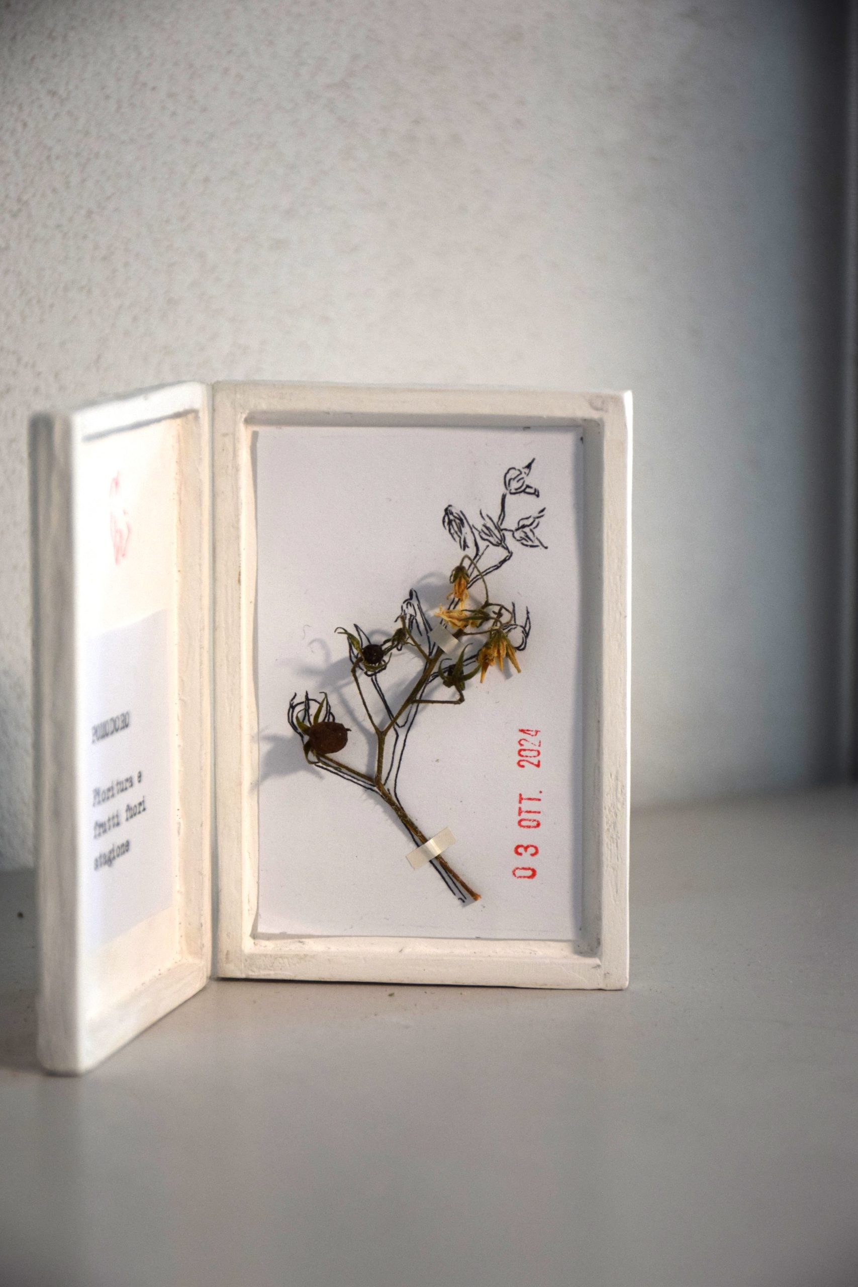 Sono opere libere di potersi muovere nell’ambiente, di essere manipolate, possono restare chiuse, aperte, possono essere spostate in diversi luoghi, viaggiare nelle tasche. L’idea del quadro da tasca è nata per liberare il quadro dal vincolo della parete e avvicinarlo alle persone, creando qualcosa di piccolo che può essere tenuto in mano. Questo quadro racchiude al suo interno un erbario. Il fiore o le erbe raccolte, prima di essere fermate sul supporto, vengono ritratte con la penna sulla carta. L’ombra, ovvero il disegno, non subirà le modifiche del fiore, che con il tempo inizierà a piegarsi o a perdere i petali e rimarrà sulla carta come simbolo dello scorrere del tempo