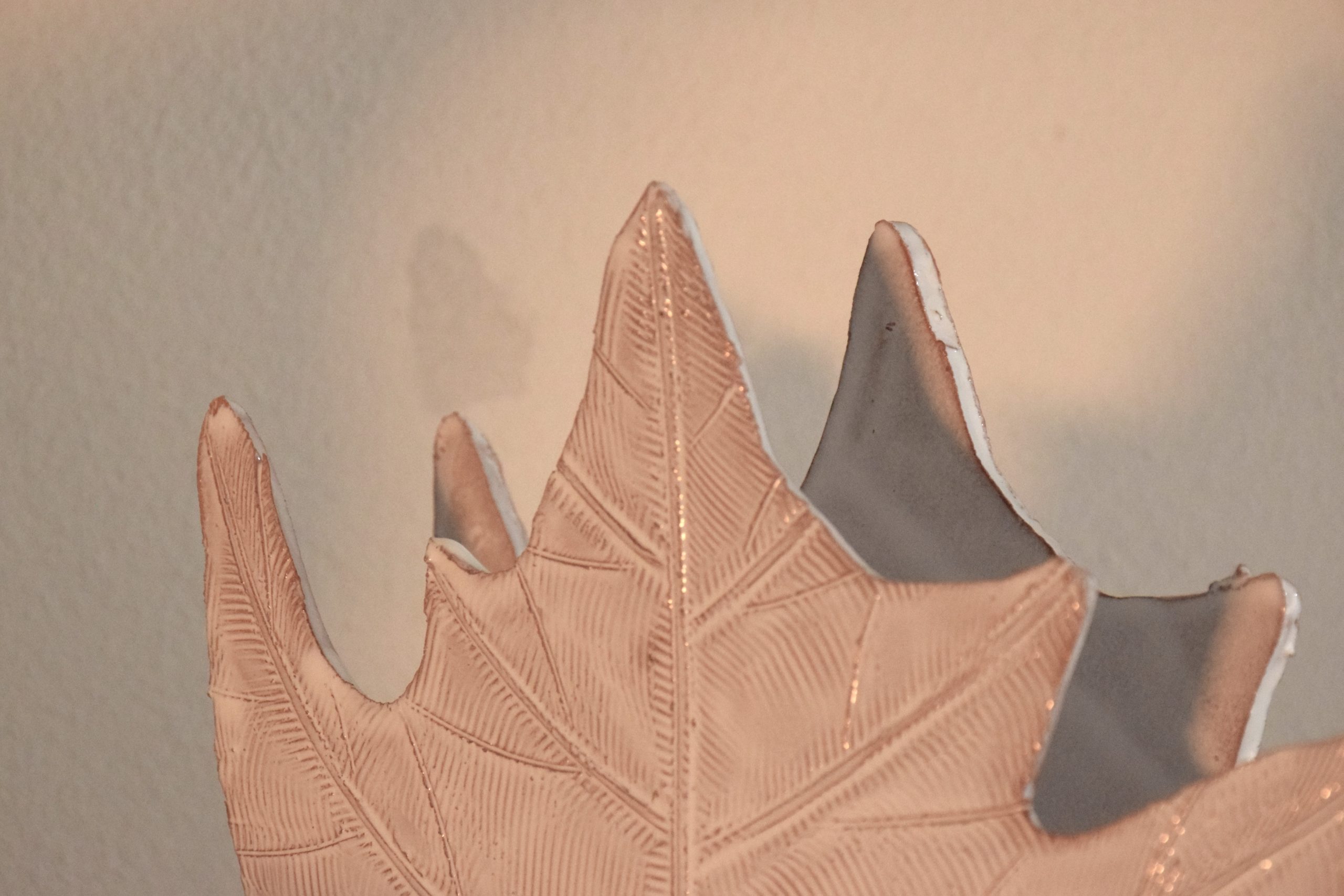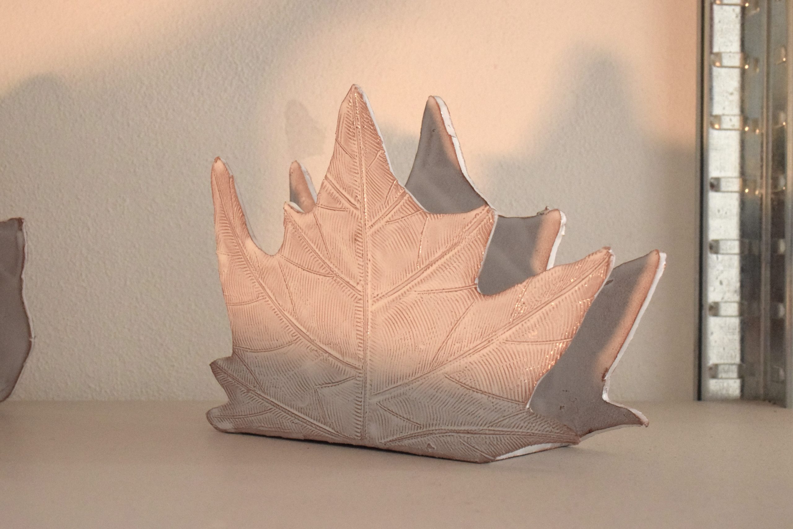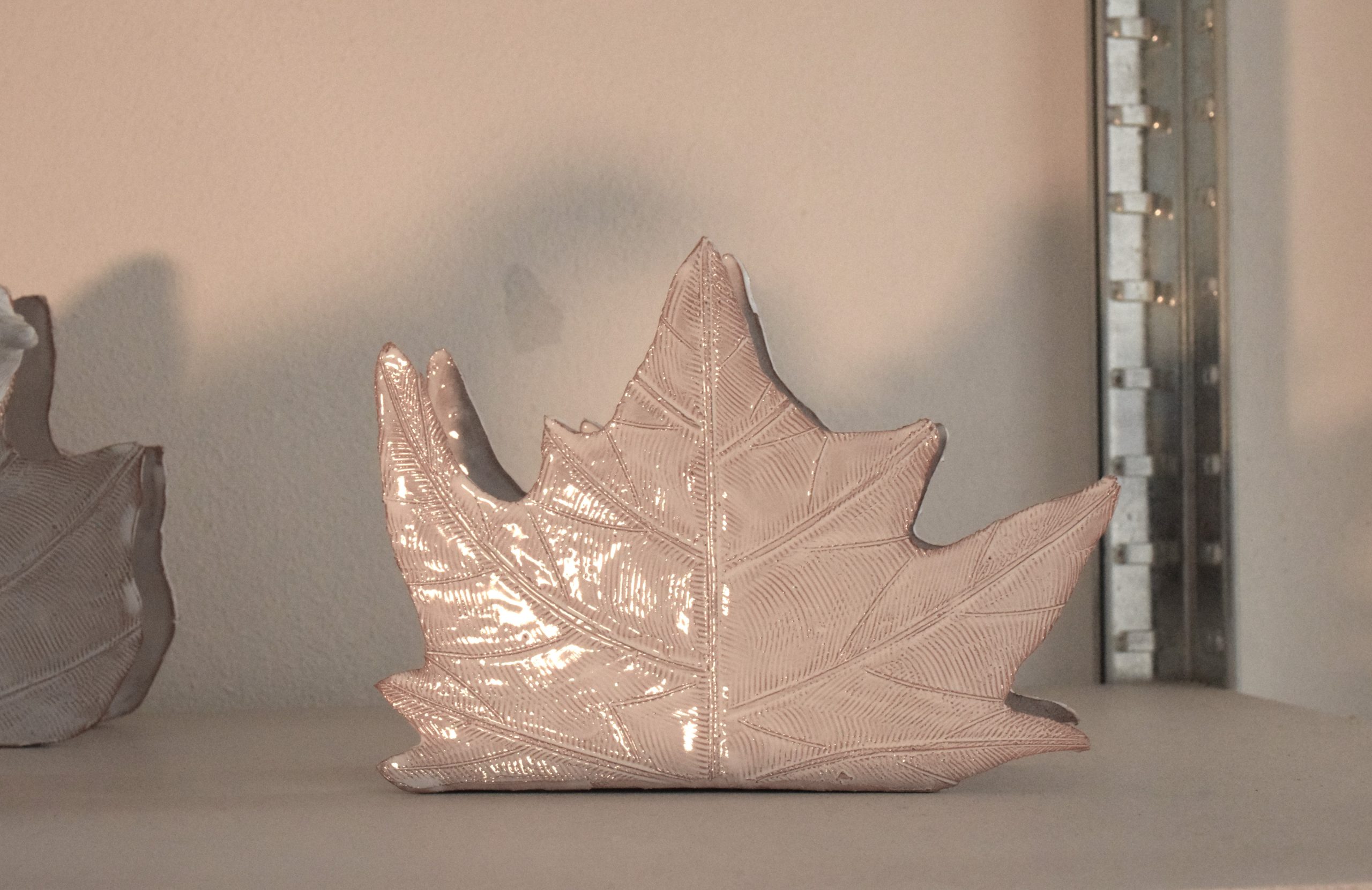 Si vole ricreare un gioco, delle foglie che possono contenere dei fogli o magri altre foglie. Con le loro forme sempre diverse, con il loro modo di cadere dalle piante e ricoprire le strade costituiscono in autunno sempre un nuovo divertimento, qualcosa che affascina e mette allegria. Sono state realizzate interamente a mano con argilla rossa e smalto per una larghezza di diciotto per sei centimetri e un’altezza di quattordici centimetri. La “Foglia di castagno” è un pezzo unico, non esiste una copia identica per forma, dimensione e colore all’originale.