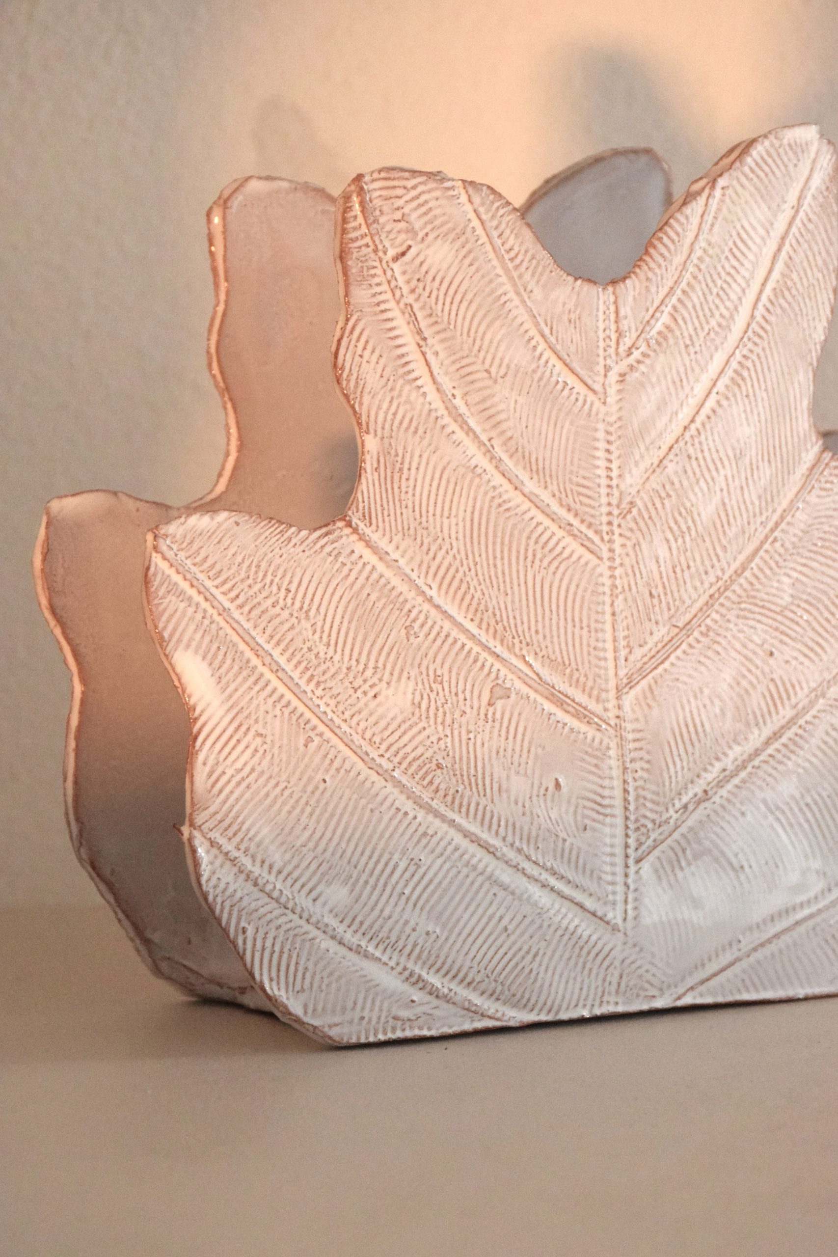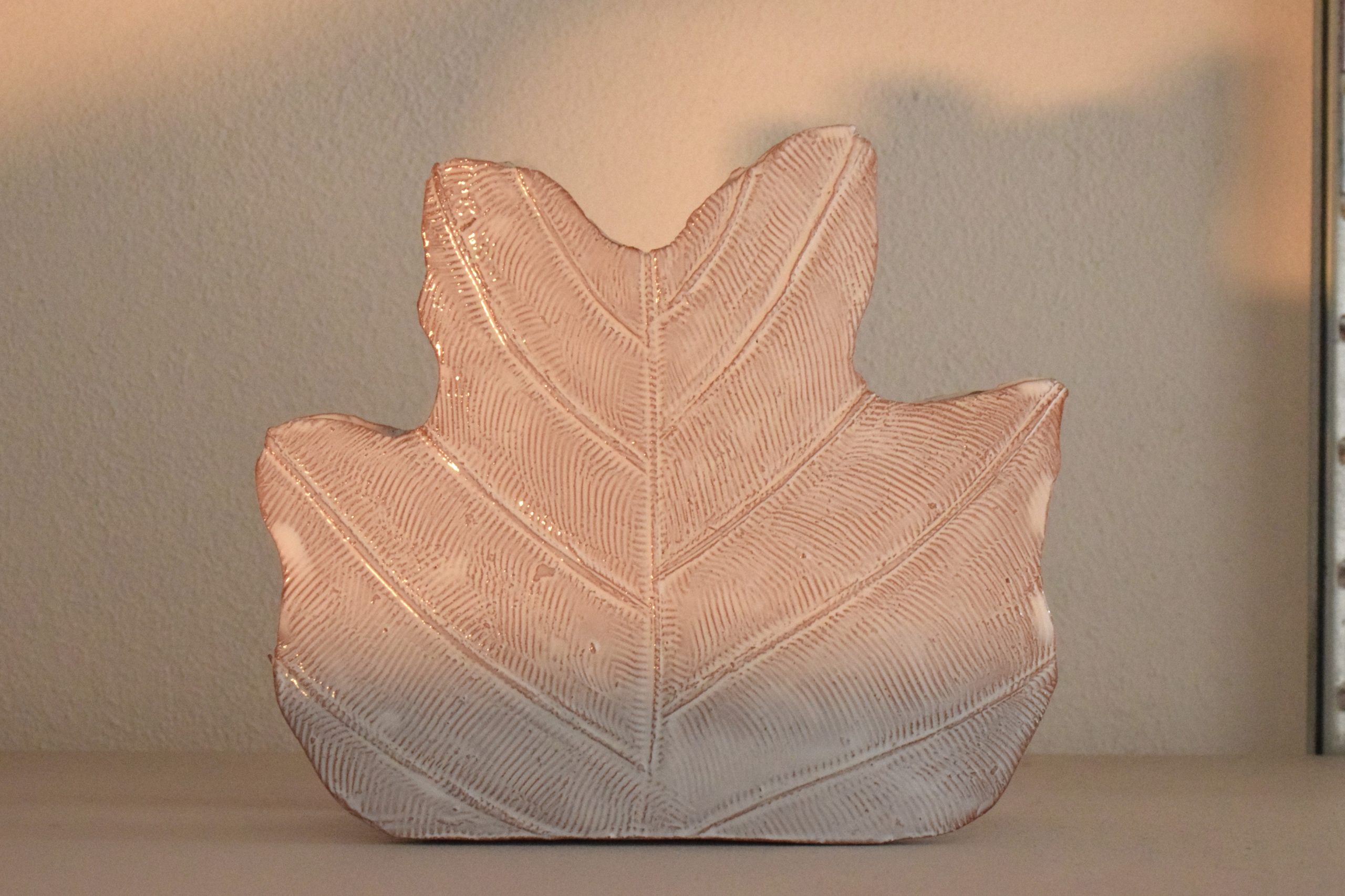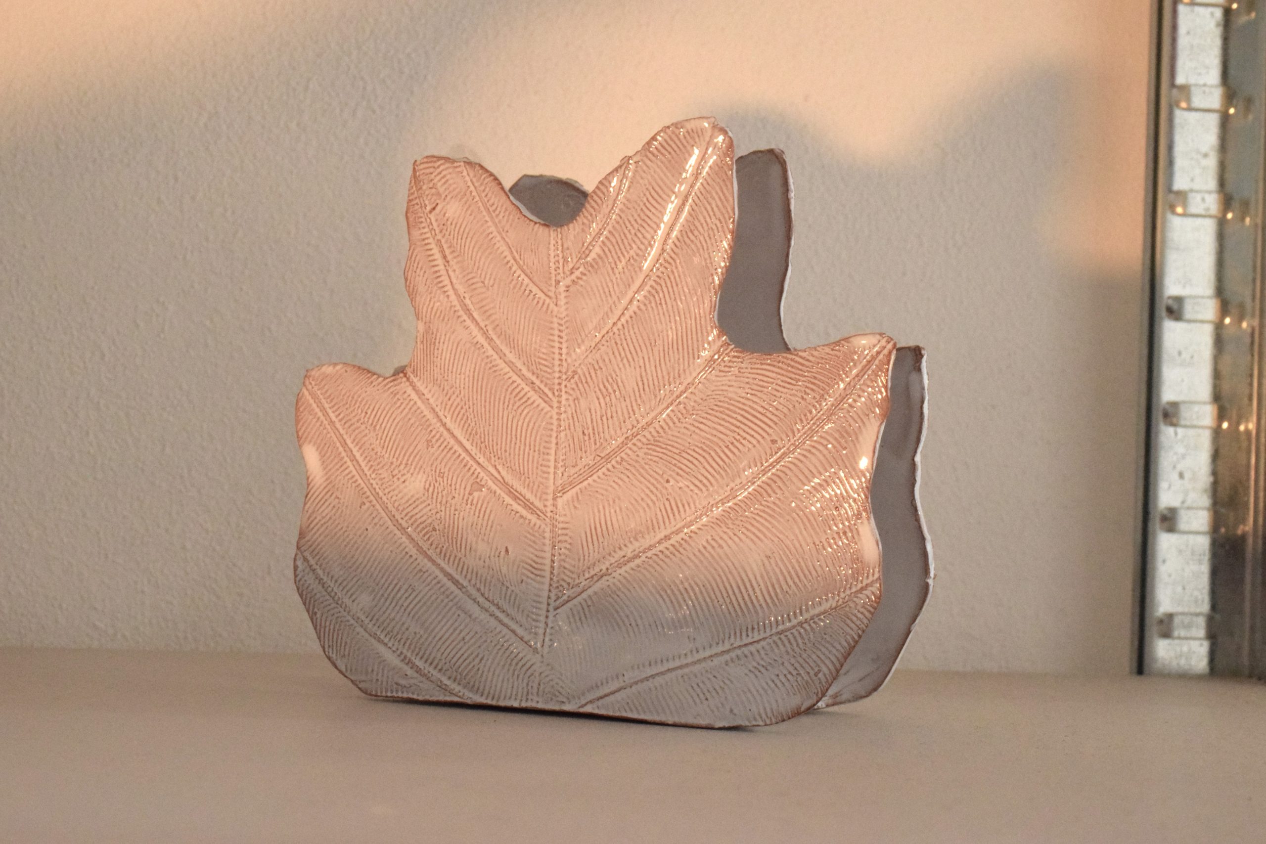 Si vole ricreare un gioco, delle foglie che possono contenere dei fogli o magri altre foglie. Con le loro forme sempre diverse, con il loro modo di cadere dalle piante e ricoprire le strade costituiscono in autunno sempre un nuovo divertimento, qualcosa che affascina e mette allegria. Sono state realizzate interamente a mano con argilla rossa e smalto per una larghezza di tredici per cinque centimetri e un’altezza di quindici centimetri. La “Foglia di liriodendro” è un pezzo unico, non esiste una copia identica per forma, dimensione e colore all’originale.