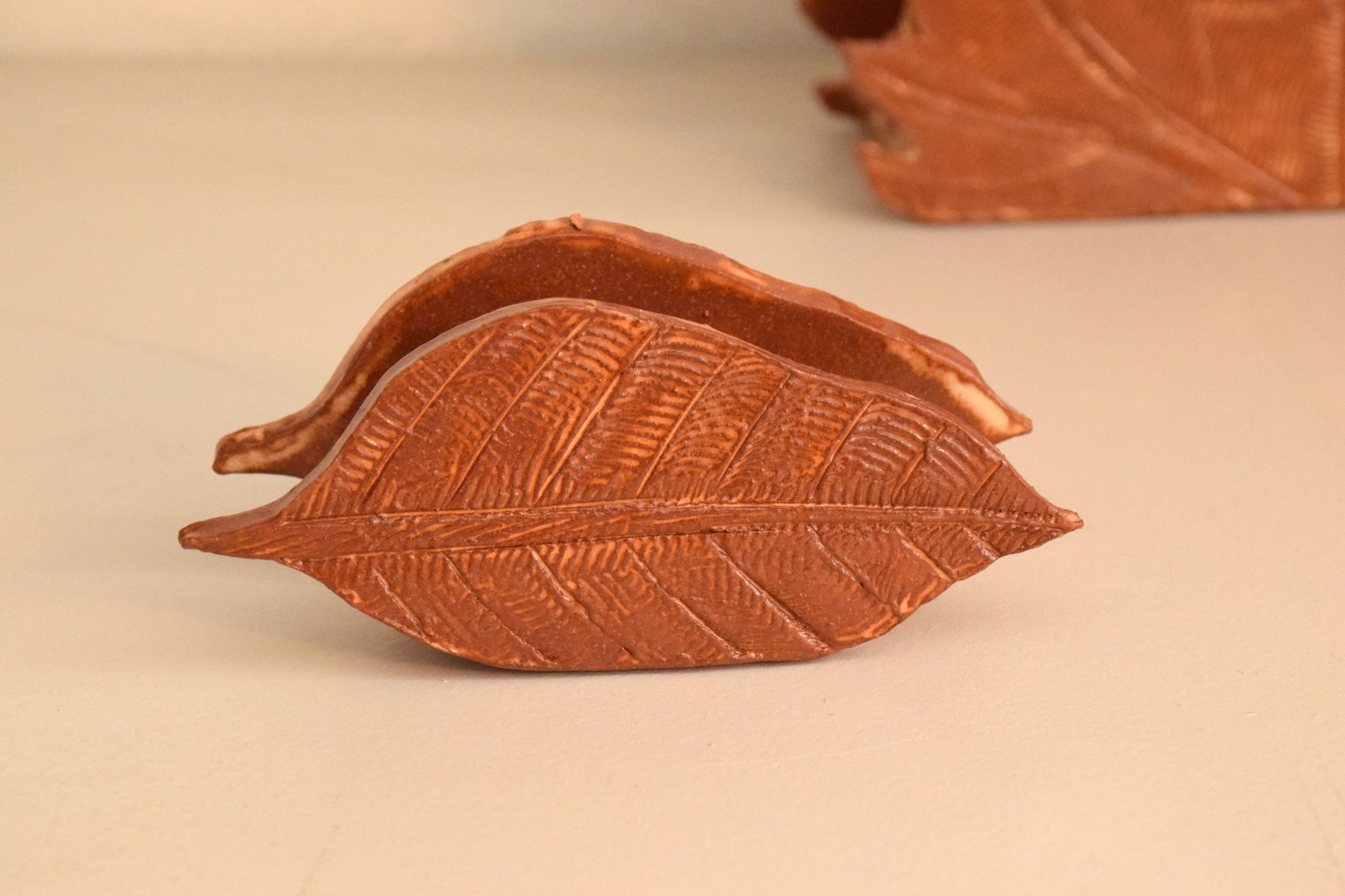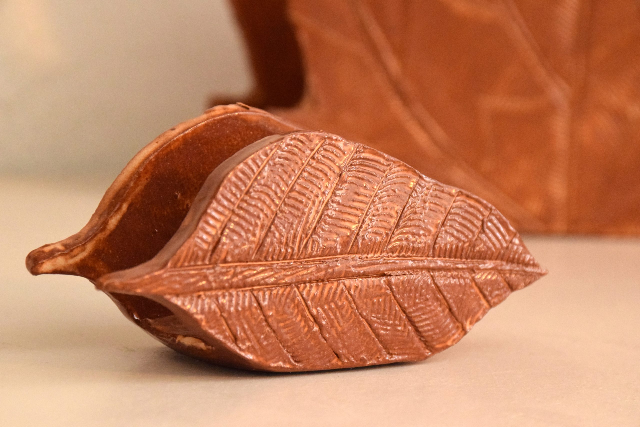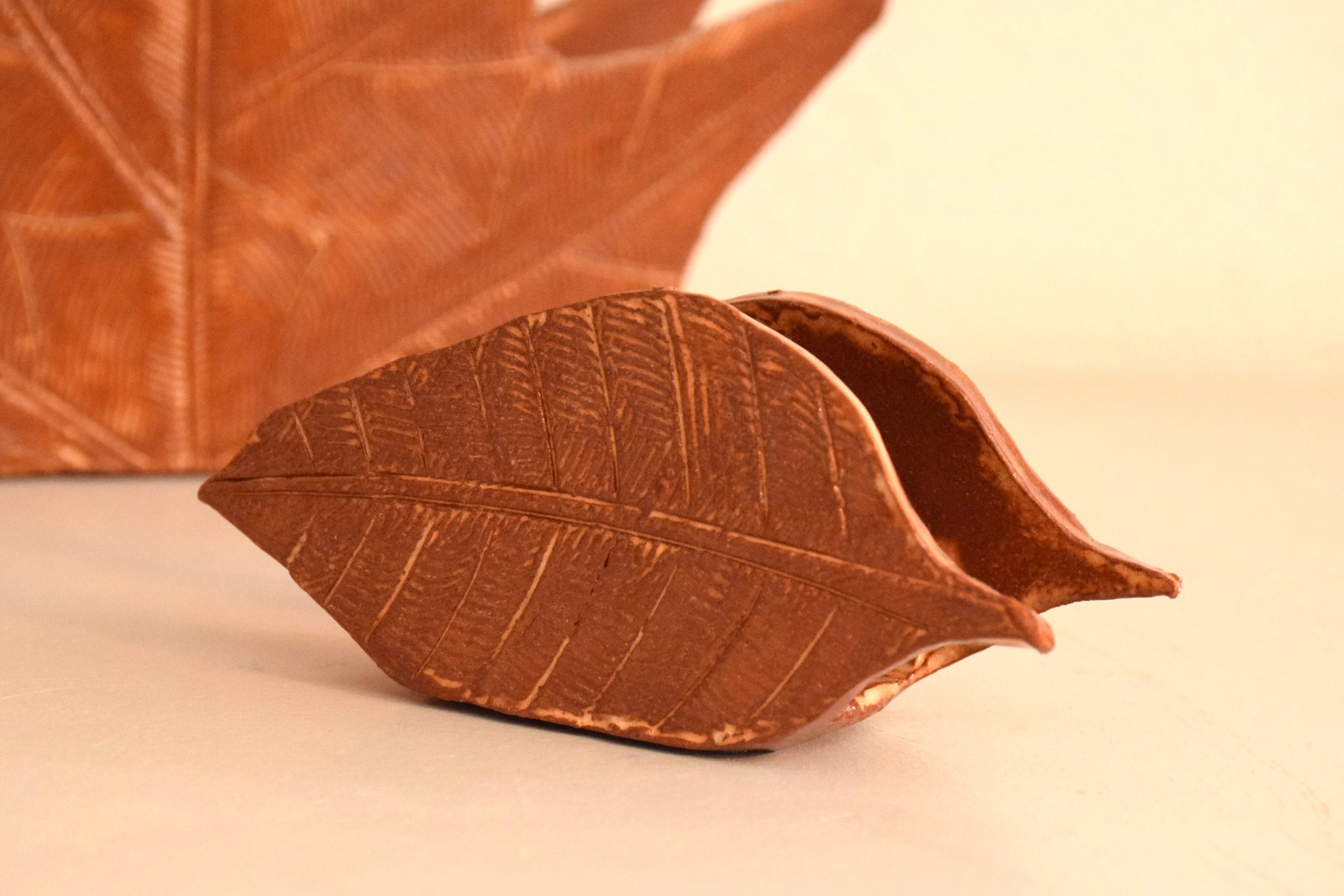 Si vole ricreare un gioco, delle foglie che possono contenere dei fogli o magri altre foglie. Con le loro forme sempre diverse, con il loro modo di cadere dalle piante e ricoprire le strade costituiscono in autunno sempre un nuovo divertimento, qualcosa che affascina e mette allegria. Sono state realizzate interamente a mano con argilla rossa e smalto per una larghezza di dieci per tre centimetri e un’altezza di cinque centimetri. La “Foglia” è un pezzo unico, non esiste una copia identica per forma, dimensione e colore all’originale.