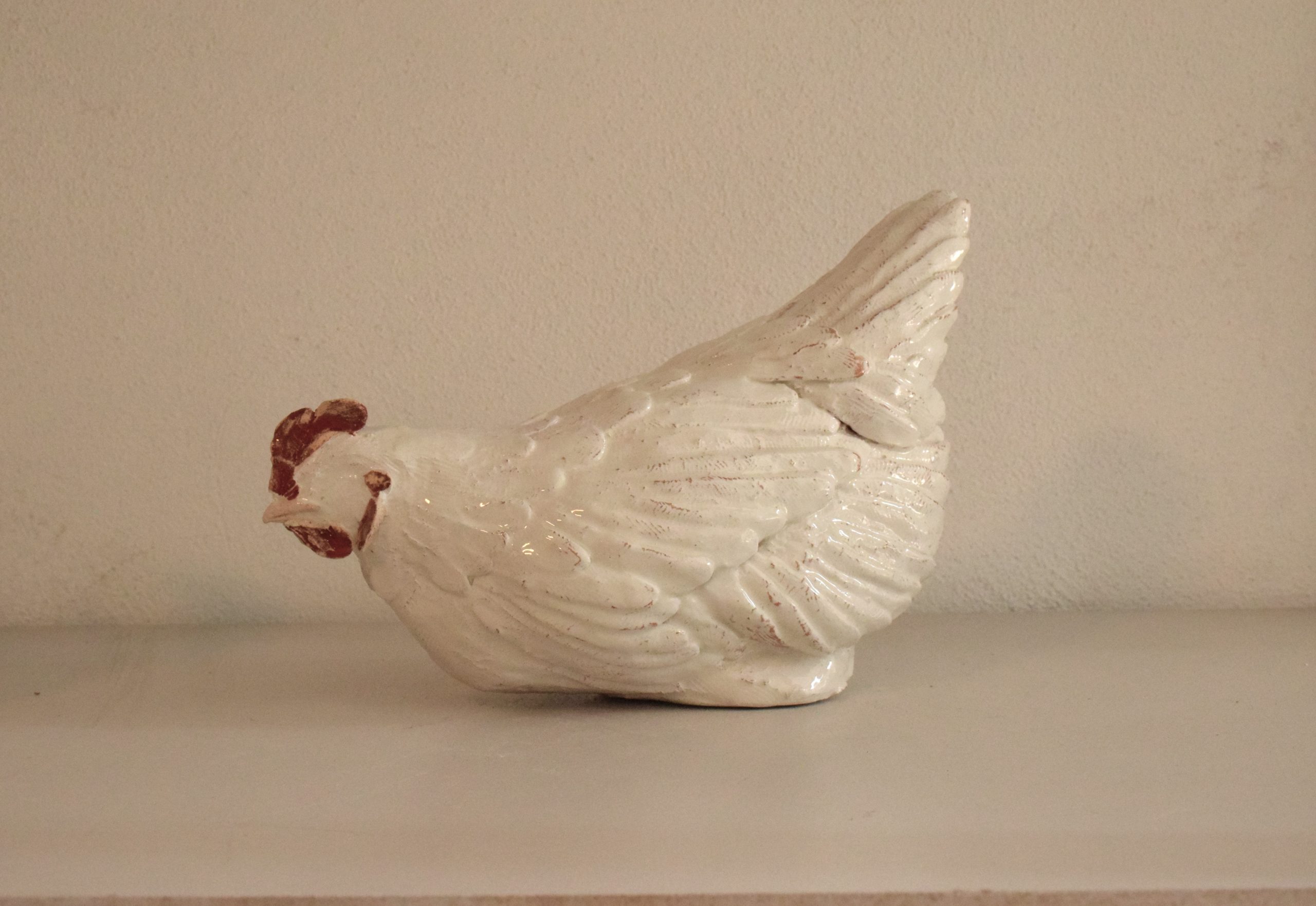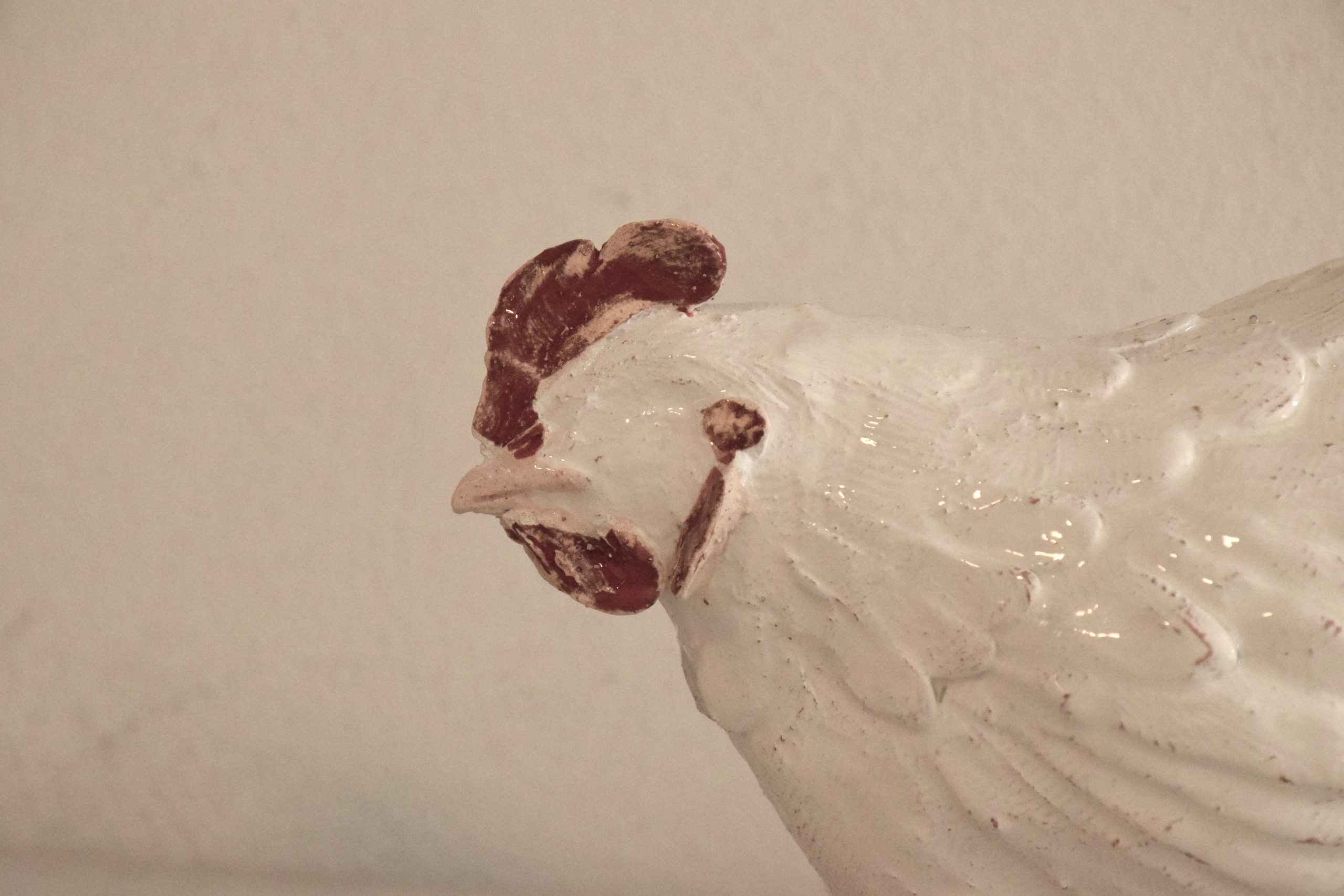 Un animale che appartiene alla campagna, da tenere lontano dalla città, che sporca e puzza, eppure entra spesso nelle nostre case. Le galline sono animali da sempre vicini all’uomo fedeli compagne allo stesso livello del cane anche se spesso non trattate allo stesso modo. Con queste sculture si vuole restituire alle galline il proprio spazio all’interno delle case accanto a noi in uno spazio speciale. Le galline appartengono ad un ciclo di sculture, sono frammenti di un progetto più grande che vede le galline come protagoniste di un’installazione di pittura e scultura. Questa gallina è stata realizzata a mano, piuma dopo piuma con argilla rossa, argilla bianca e cristallina, occupa uno spazio di venticinque centimetri di lunghezza, nove di larghezza e diciassette di altezza. La “Gallina” è un pezzo unico, non esiste una copia identica per forma, dimensione e colore all’originale