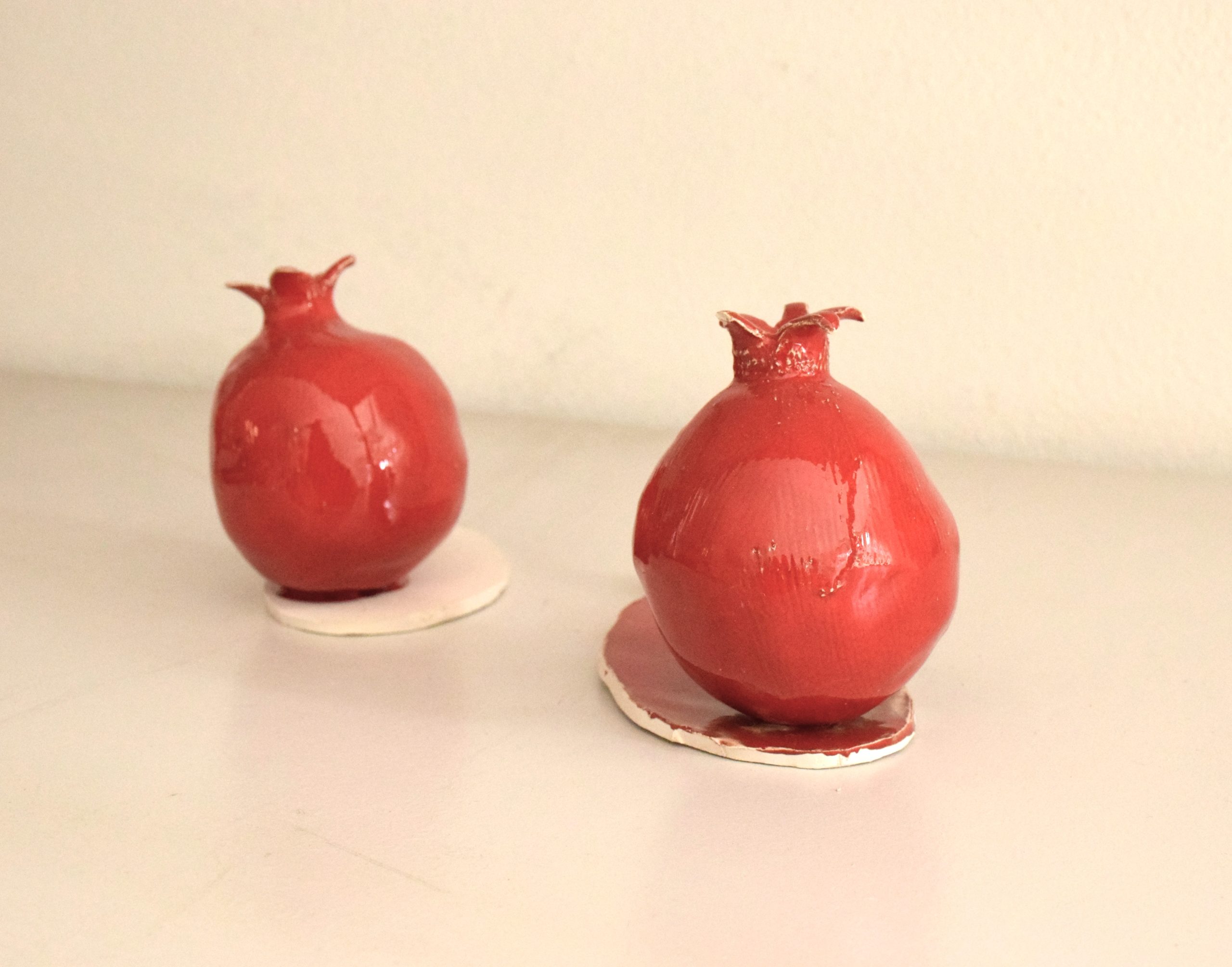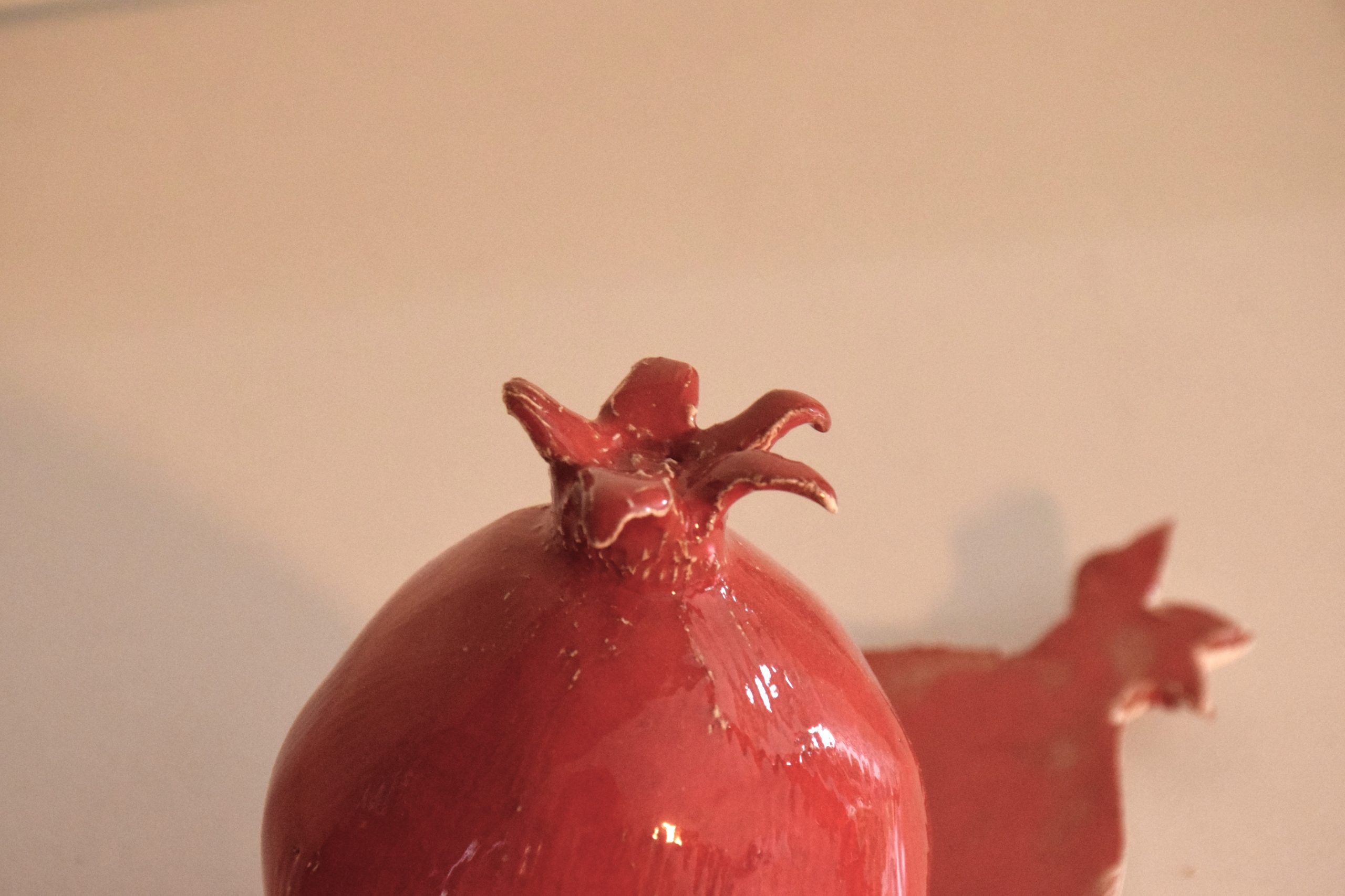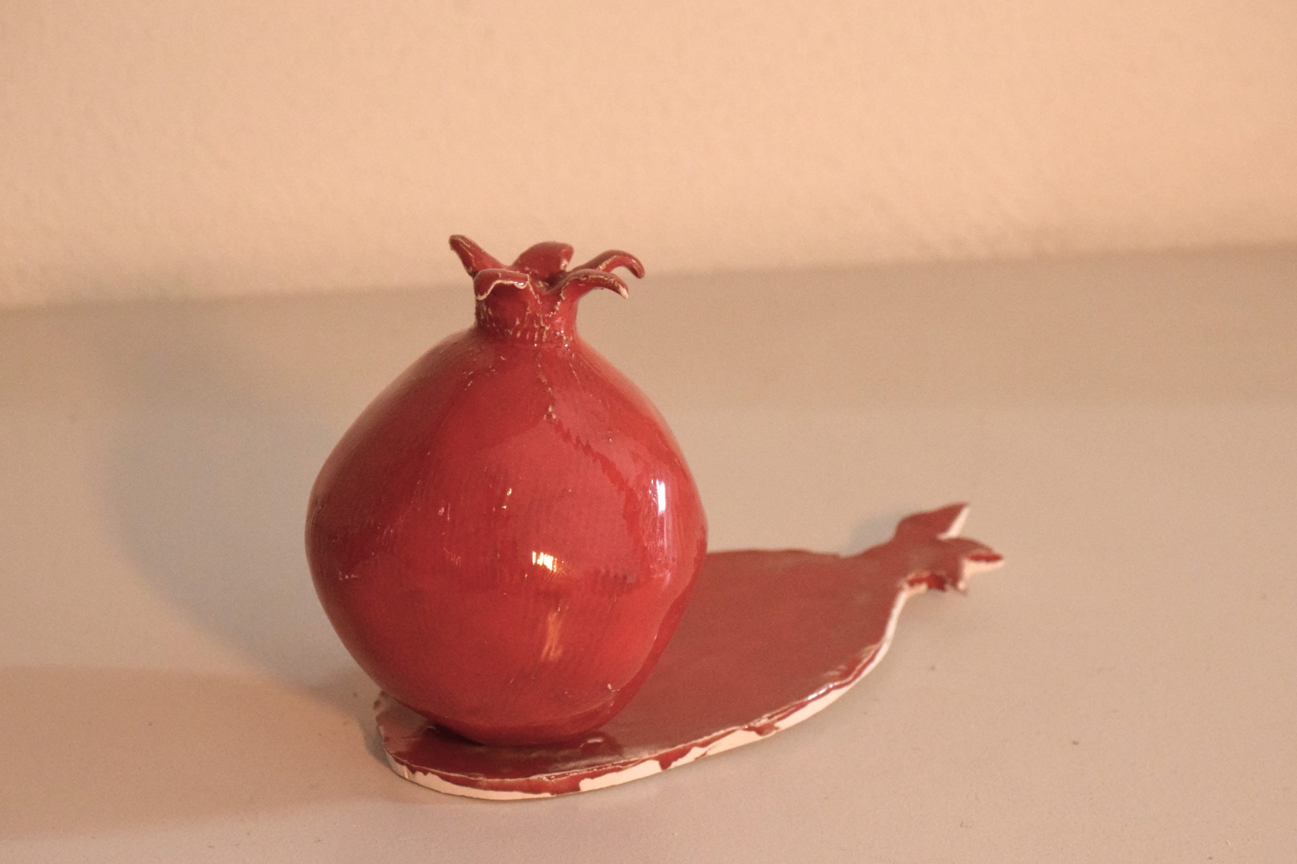 Il melograno è stato realizzato in argilla bianca e smalto. Si vuole ricreare effetto dell’ombra che quando è molto forte prende corpo e sembra sorreggere il frutto. Il melograno e la sua ombra sono stati realizzati interamente a mano per una larghezza di quattordici per sette centimetri e un’altezza di otto. Il “Melograno” è un pezzo unico, non esiste una copia identica per forma, dimensione e colore all’originale.