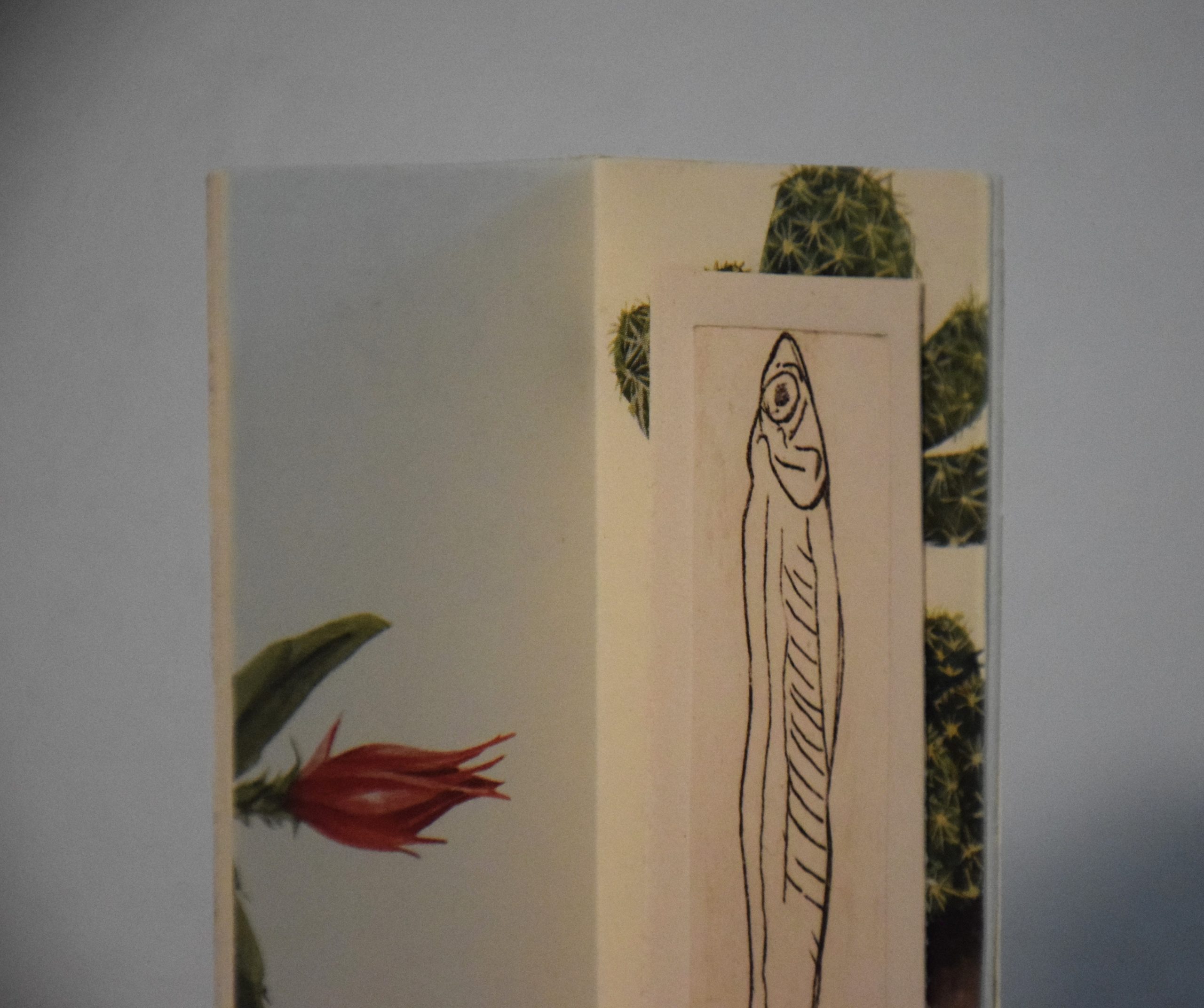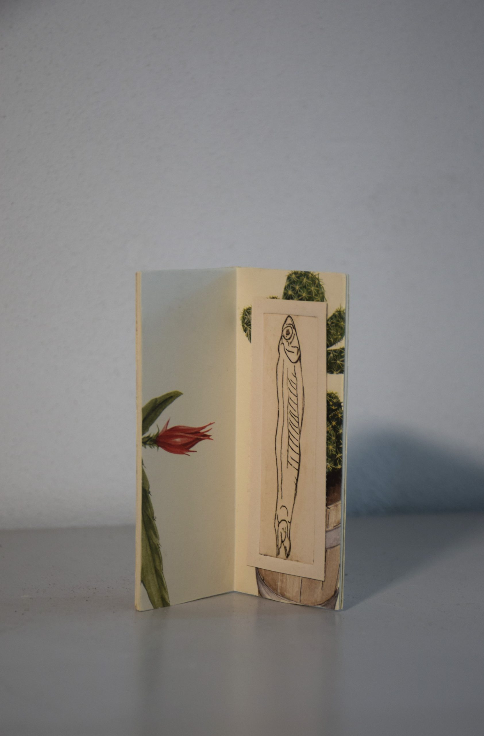 Sono opere libere di potersi muovere nell’ambiente, di essere manipolate, possono restare chiuse, aperte, possono essere spostate in diversi luoghi, viaggiare nelle tasche. L’idea del quadro da tasca è nata per liberare il quadro dal vincolo della parete e avvicinarlo alle persone, creando qualcosa di piccolo che può essere tenuto in mano. È stato realizzato con carta decorata, legno e come protagonista un’incisione a puntasecca che raffigura un'acciuga. È un pezzo unico, non esiste una copia identica per forma, dimensione e colore all’originale.