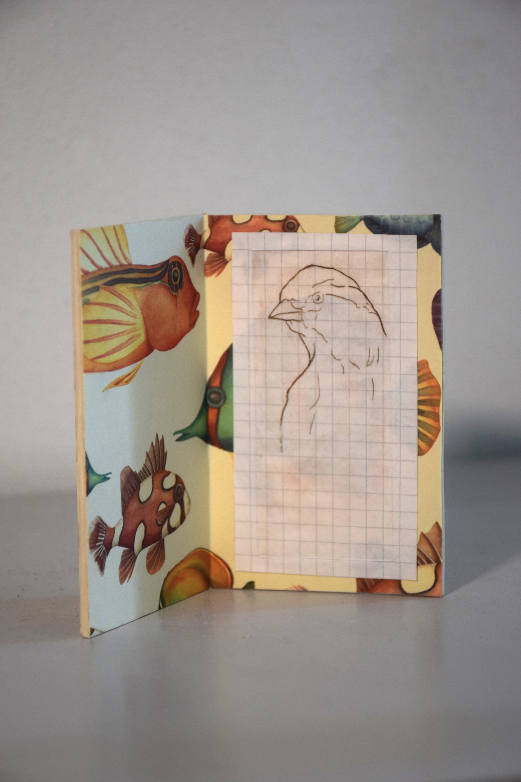 Sono opere libere di potersi muovere nell’ambiente, di essere manipolate, possono restare chiuse, aperte, possono essere spostate in diversi luoghi, viaggiare nelle tasche. L’idea del quadro da tasca è nata per liberare il quadro dal vincolo della parete e avvicinarlo alle persone, creando qualcosa di piccolo che può essere tenuto in mano. È stato realizzato con carta decorata, legno e come protagonista un’incisione a puntasecca che raffigura un passero. È un pezzo unico, non esiste una copia identica per forma, dimensione e colore all’originale.