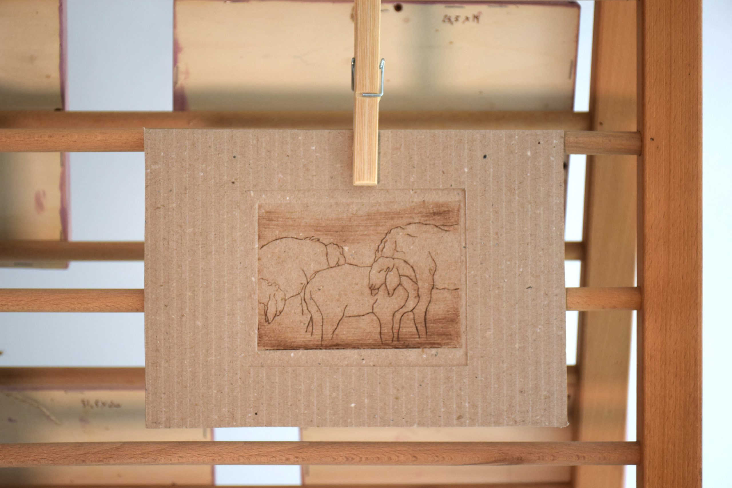 L’incisione a puntasecca è una tecnica grafica che consiste nel graffiare con una punta affilata un supporto morbido come ad esempio il rame, il plexiglas o lo zinco. Una volta disegnata o meglio graffiata la tavoletta può essere inchiostrata e stampata sulla carta con l’aiuto di un torchio. Questa tecnica permette di riprodurre la stessa immagine incisa un certo numero di volte che vengono riportate dall’artista in fondo alla stampa ad esempio 1/50 ovvero stampa prima su cinquanta copie. Queste stampe non hanno un numero di tiratura perché ogni esemplare è unico in quanto si interviene sulla matrice, prima della stampa, lasciando dei residui d’inchiostro in alcuni punti realizzando delle stampe che non si possono riprodurre.