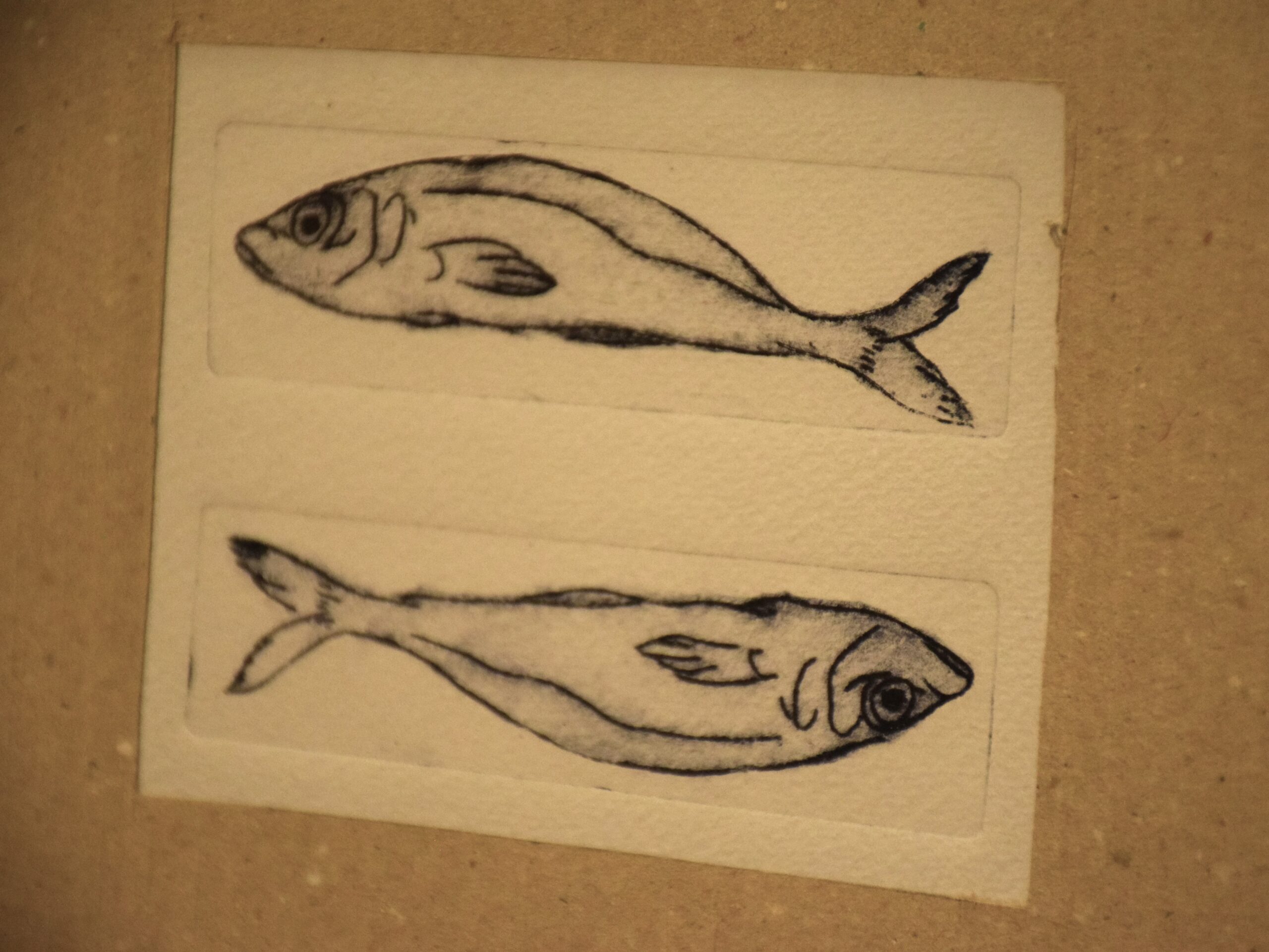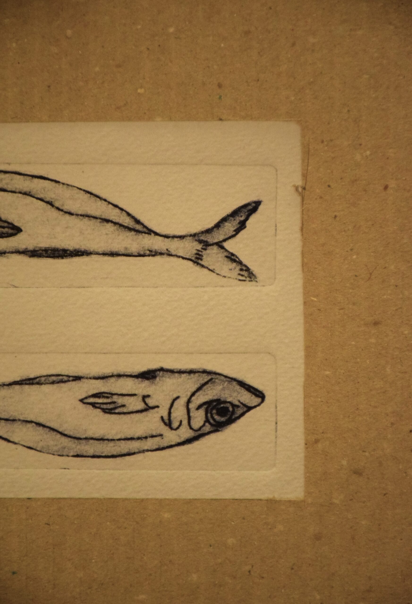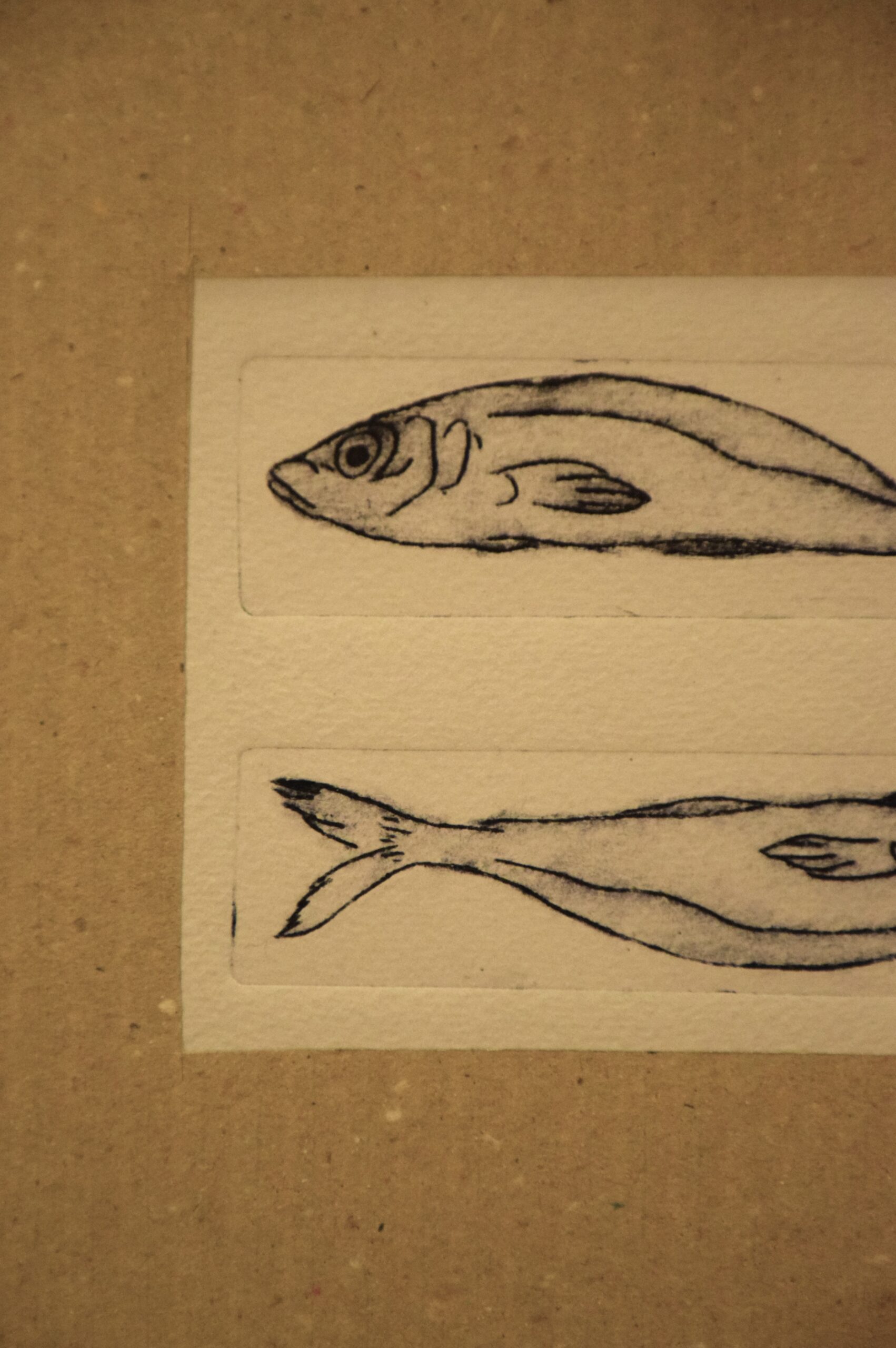 L’incisione a puntasecca è una tecnica grafica che consiste nel graffiare con una punta affilata un supporto morbido come ad esempio il rame, il plexiglas o lo zinco. Una volta disegnata, o meglio graffiata, la tavoletta può essere inchiostrata e stampata sulla carta con l’aiuto di un torchio. Questa tecnica permette di riprodurre la stessa immagine incisa un certo numero di volte che vengono riportate dall’artista in fondo alla stampa ad esempio 1/50 ovvero stampa prima su cinquanta copie. “Paesaggio, pesci” non ha un numero di tiratura perché ogni esemplare è unico in quanto si è intervenuti sulla matrice, prima della stampa, lasciando in alcuni punti dei residui d’inchiostro creando delle stampe simili alla pittura, che non si possono riprodurre.