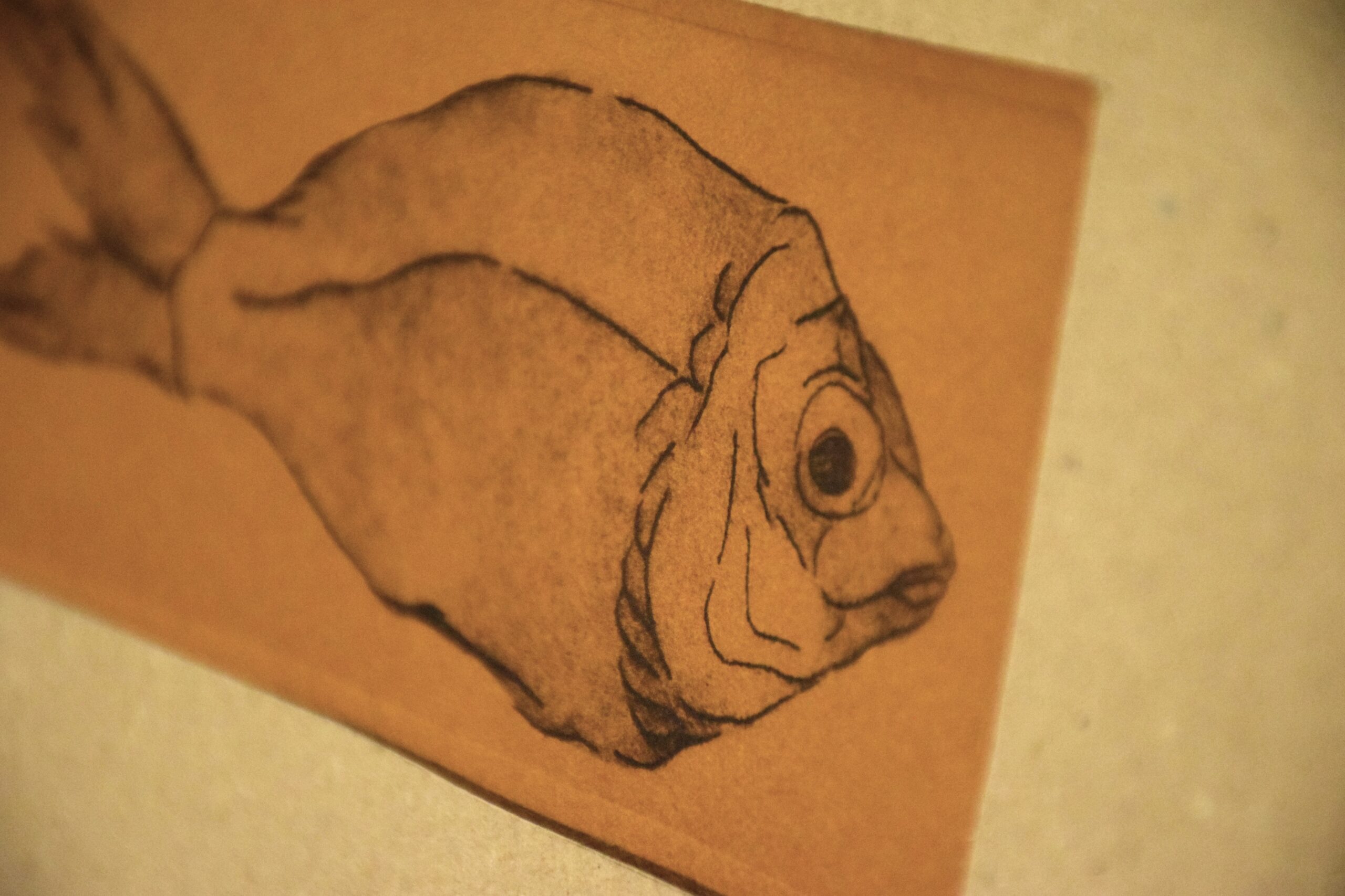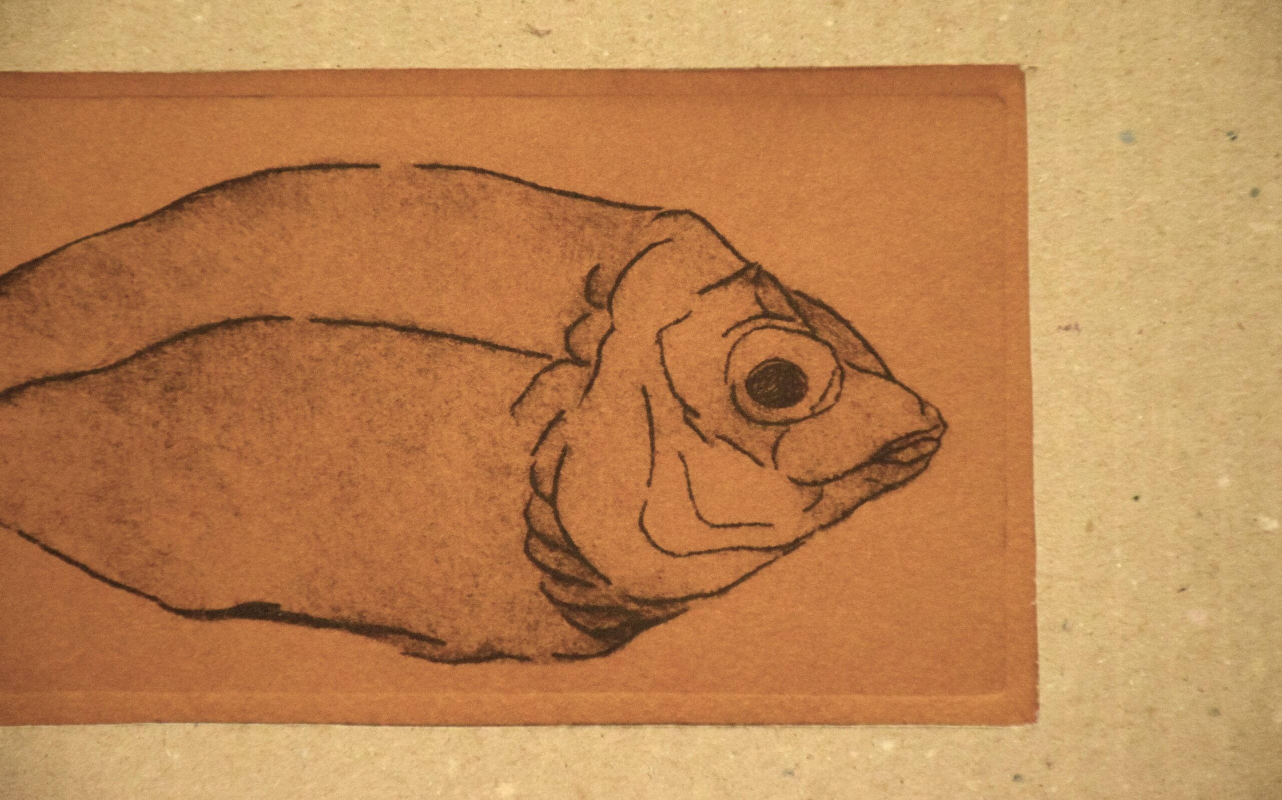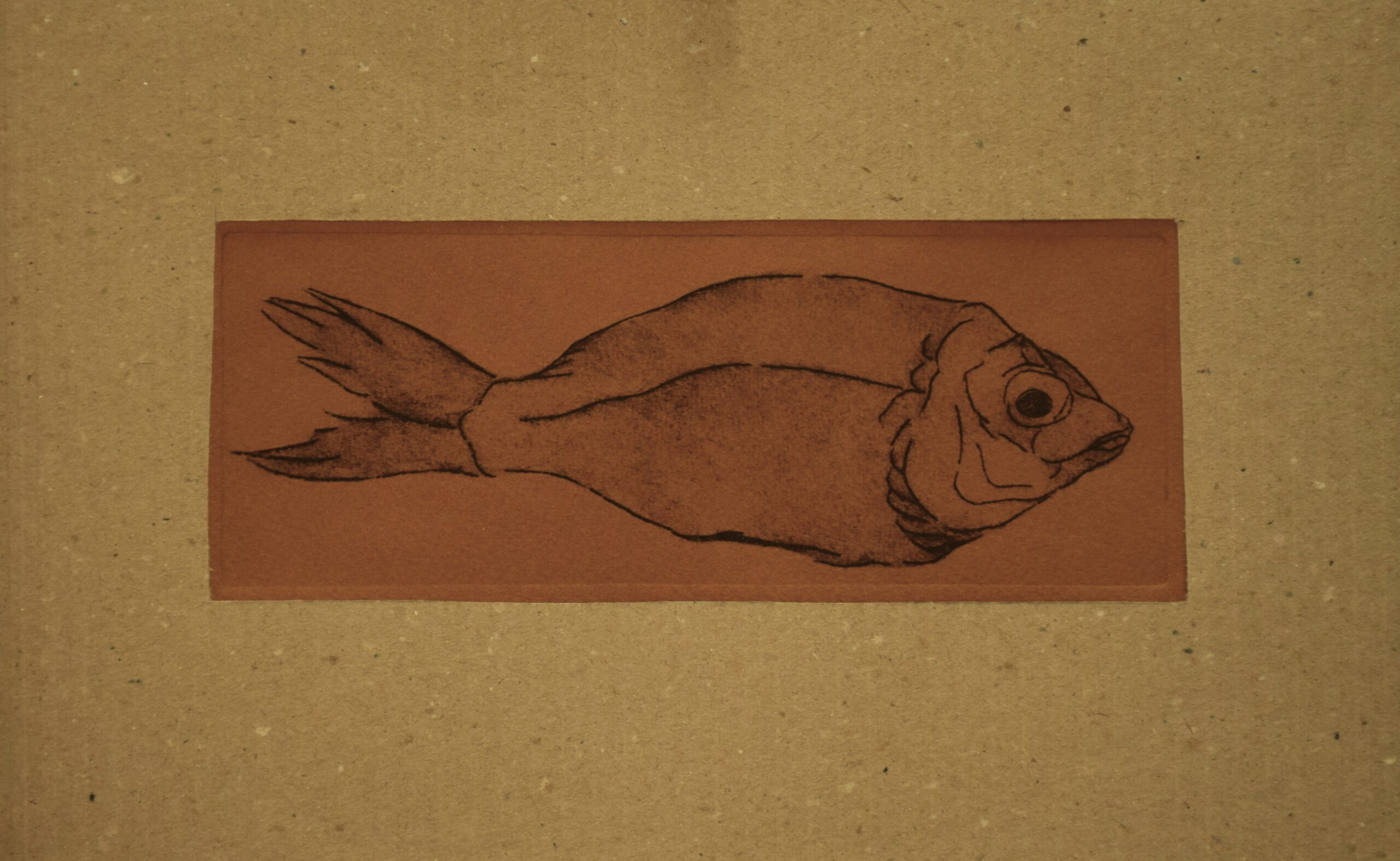 L’incisione a puntasecca è una tecnica grafica che consiste nel graffiare con una punta affilata un supporto morbido come ad esempio il rame, il plexiglas o lo zinco. Una volta disegnata, o meglio graffiata, la tavoletta può essere inchiostrata e stampata sulla carta con l’aiuto di un torchio. Questa tecnica permette di riprodurre la stessa immagine incisa un certo numero di volte che vengono riportate dall’artista in fondo alla stampa ad esempio 1/50 ovvero stampa prima su cinquanta copie. “Paesaggio, pesci” non ha un numero di tiratura perché ogni esemplare è unico in quanto si è intervenuti sulla matrice, prima della stampa, lasciando in alcuni punti dei residui d’inchiostro creando delle stampe simili alla pittura, che non si possono riprodurre.