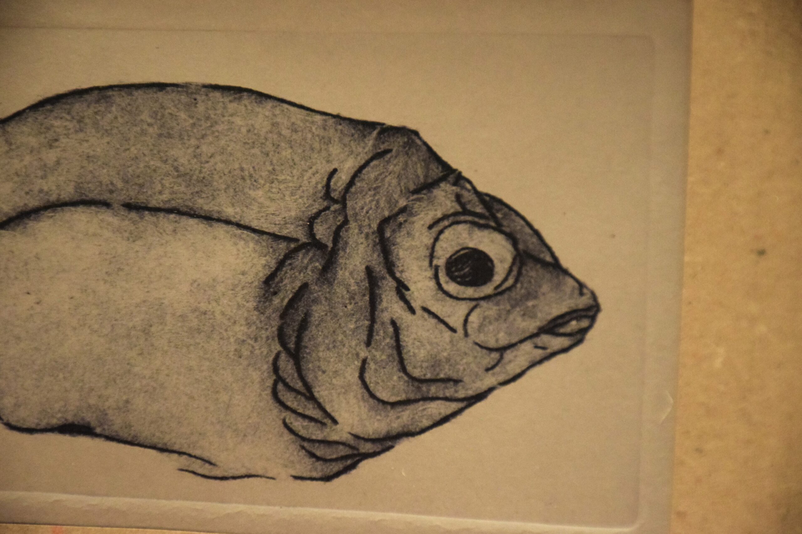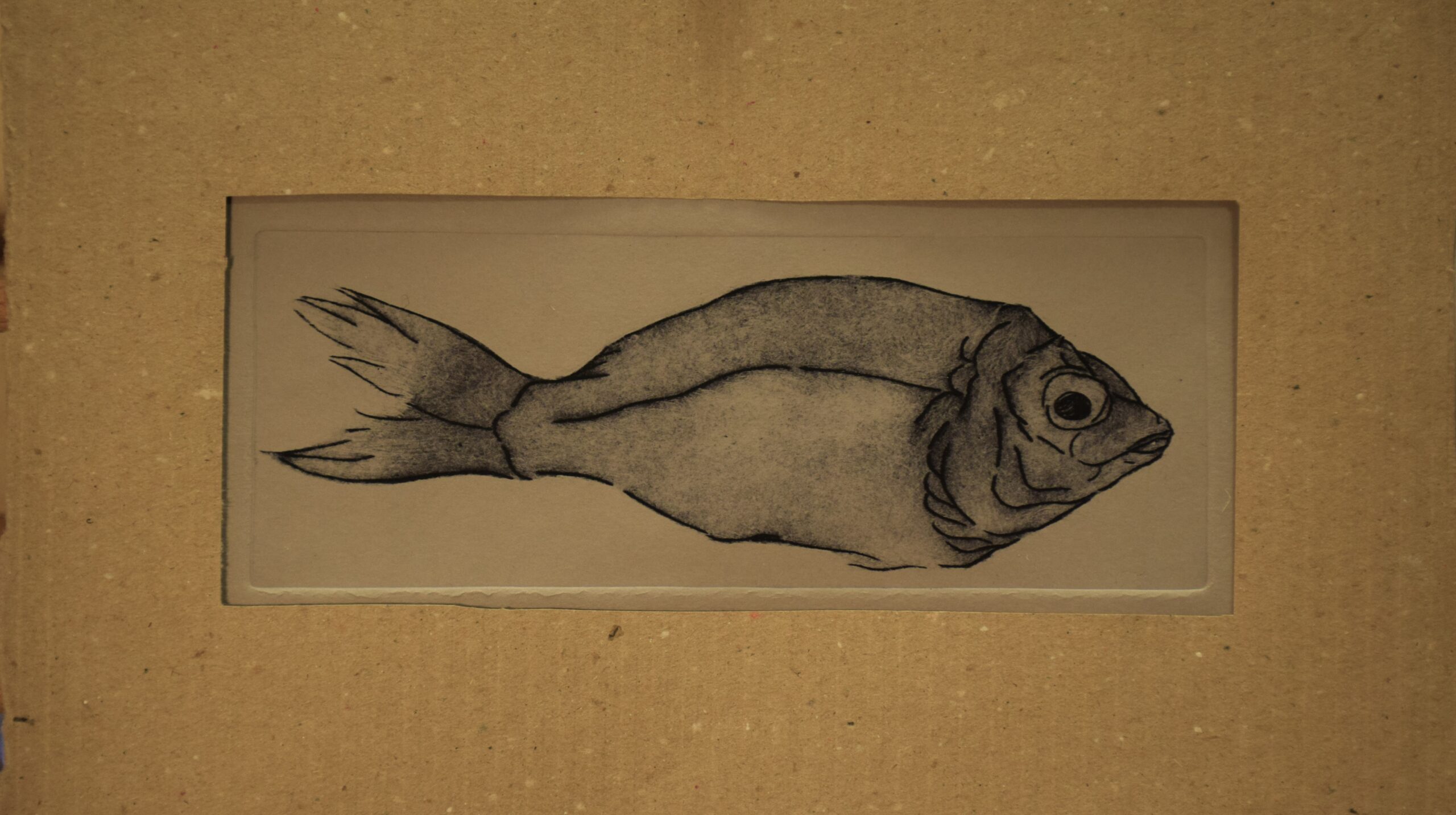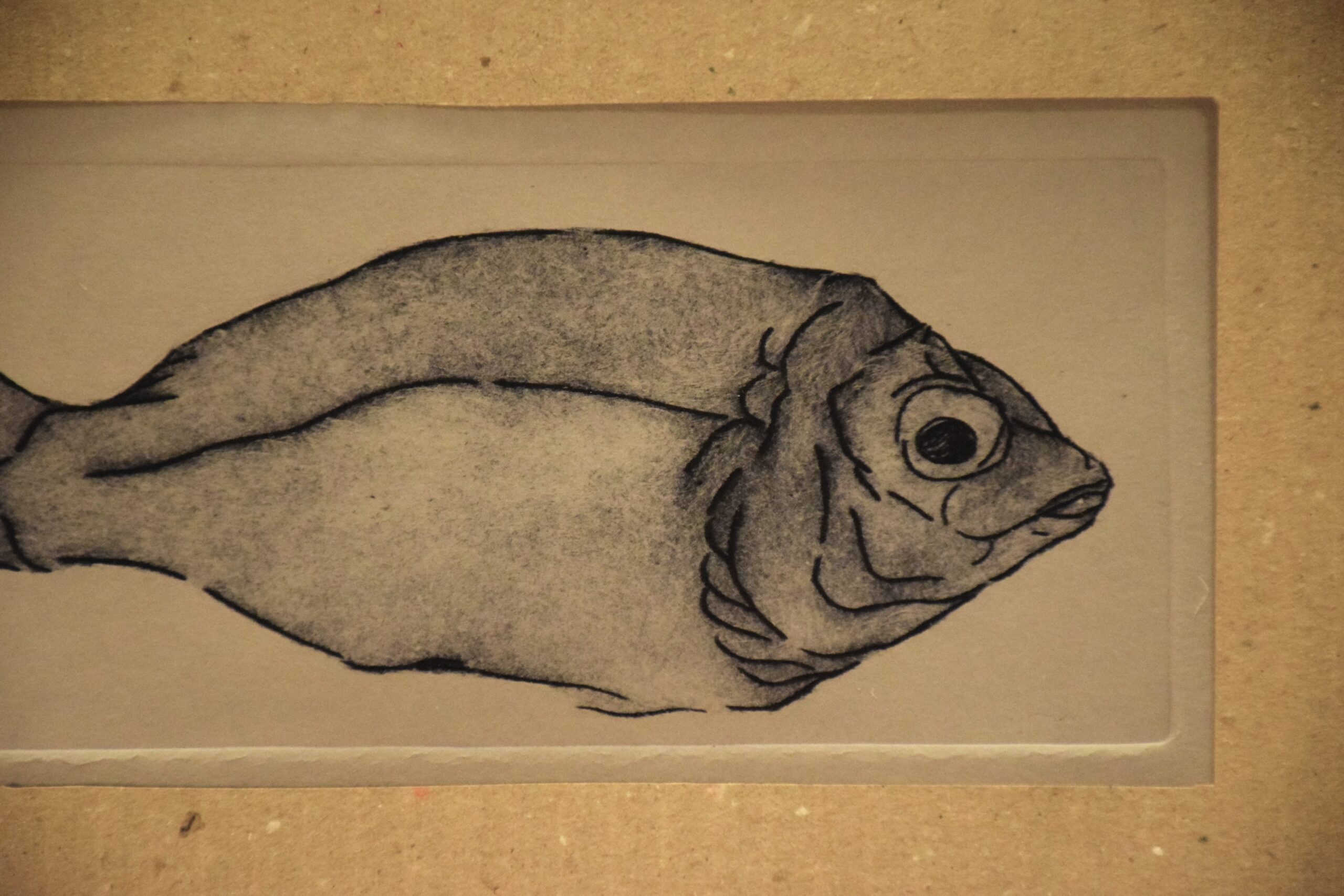 L’incisione a puntasecca è una tecnica grafica che consiste nel graffiare con una punta affilata un supporto morbido come ad esempio il rame, il plexiglas o lo zinco. Una volta disegnata, o meglio graffiata, la tavoletta può essere inchiostrata e stampata sulla carta con l’aiuto di un torchio. Questa tecnica permette di riprodurre la stessa immagine incisa un certo numero di volte che vengono riportate dall’artista in fondo alla stampa ad esempio 1/50 ovvero stampa prima su cinquanta copie. “Paesaggio, pesci” non ha un numero di tiratura perché ogni esemplare è unico in quanto si è intervenuti sulla matrice, prima della stampa, lasciando in alcuni punti dei residui d’inchiostro creando delle stampe simili alla pittura, che non si possono riprodurre.