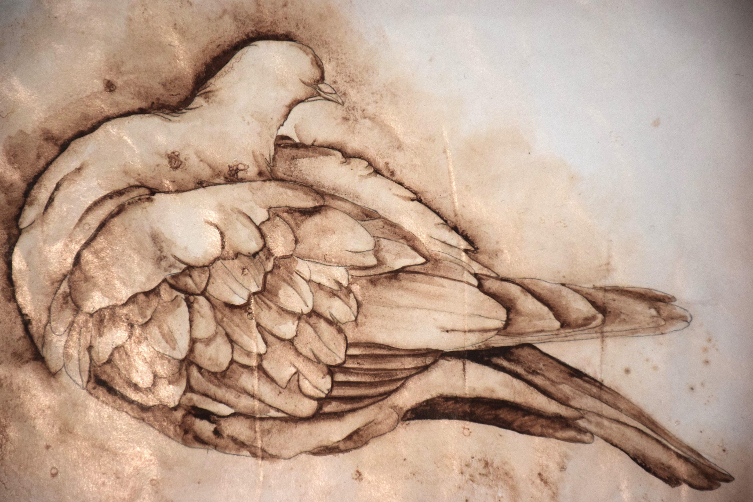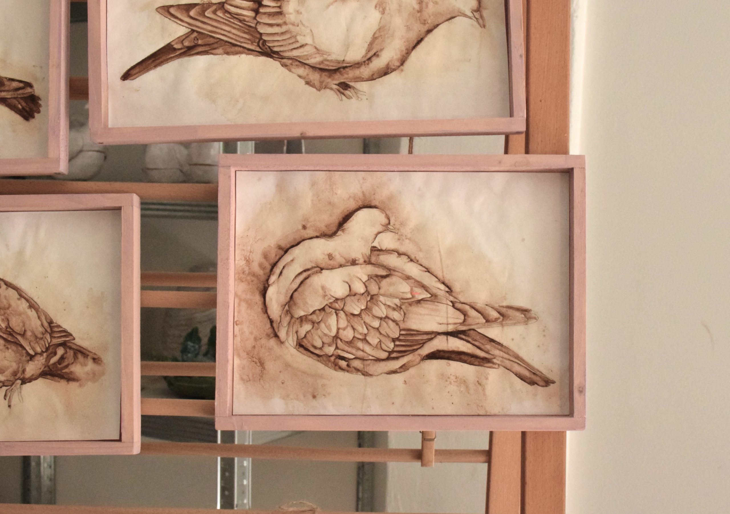 Questi quadri sono stati realizzati con pittura a olio su carta e rappresentano dei piccioni. La serie fa parte di un ciclo di dipinti dal titolo “Quello che resta”, una riflessione sul paesaggio dopo l’intervento dell’essere umano. La natura che siamo abituati a vedere, le piante da frutto, le verdure, gli animali, sono frutto dell’intervento dell’uomo che è stato in grado, nei secoli, di manipolare il paesaggio. Anche i piccioni che sembrano entrare, invadendoci, nelle città sono un prodotto dell’essere umano, una nostra causa, fanno parte, anche se non graditi, di questo nuovo paesaggio.
