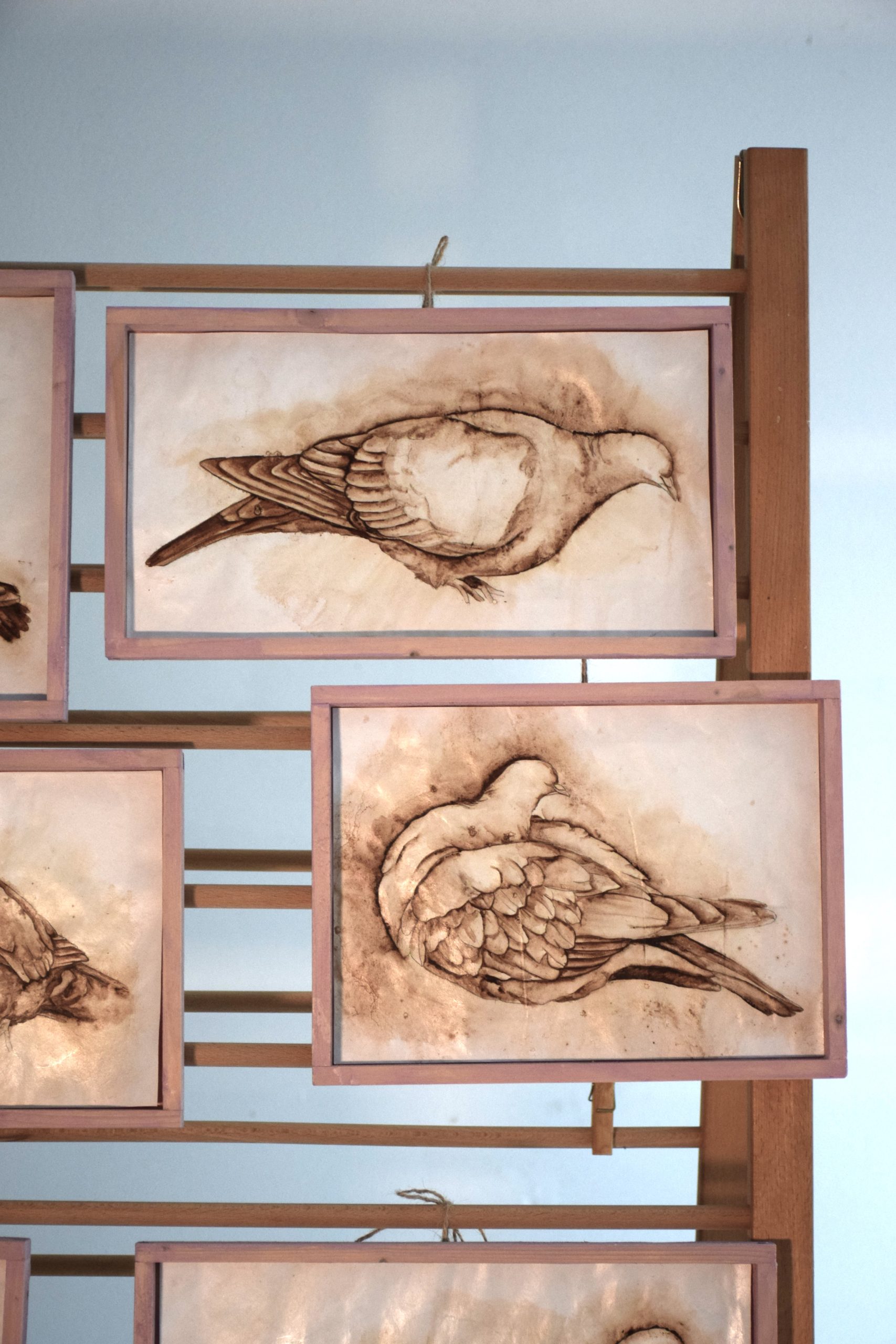 Questi quadri sono stati realizzati con pittura a olio su carta e rappresentano dei piccioni. La serie fa parte di un ciclo di dipinti dal titolo “Quello che resta”, una riflessione sul paesaggio dopo l’intervento dell’essere umano. La natura che siamo abituati a vedere, le piante da frutto, le verdure, gli animali, sono frutto dell’intervento dell’uomo che è stato in grado, nei secoli, di manipolare il paesaggio. Anche i piccioni che sembrano entrare, invadendoci, nelle città sono un prodotto dell’essere umano, una nostra causa, fanno parte, anche se non graditi, di questo nuovo paesaggio.