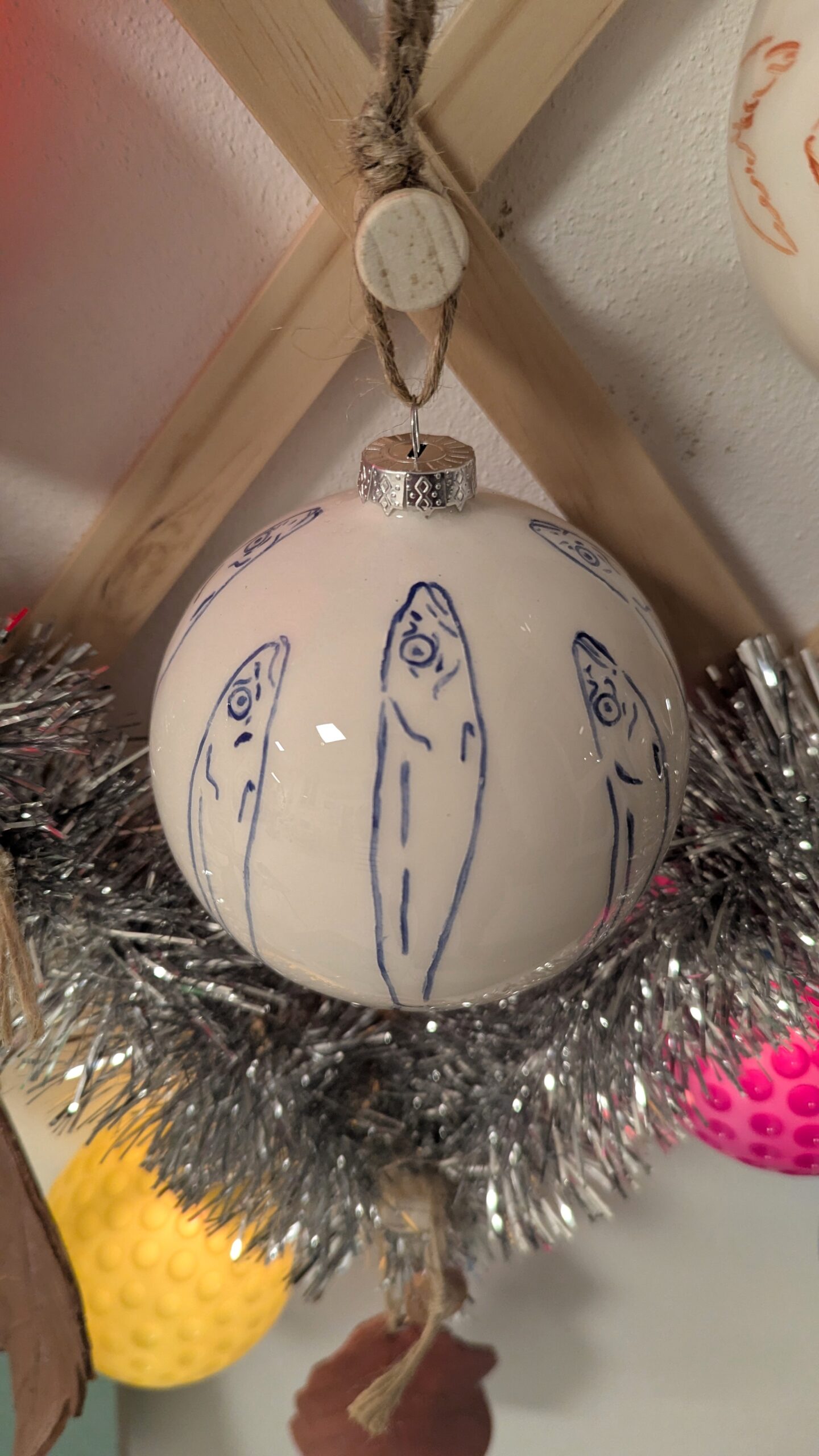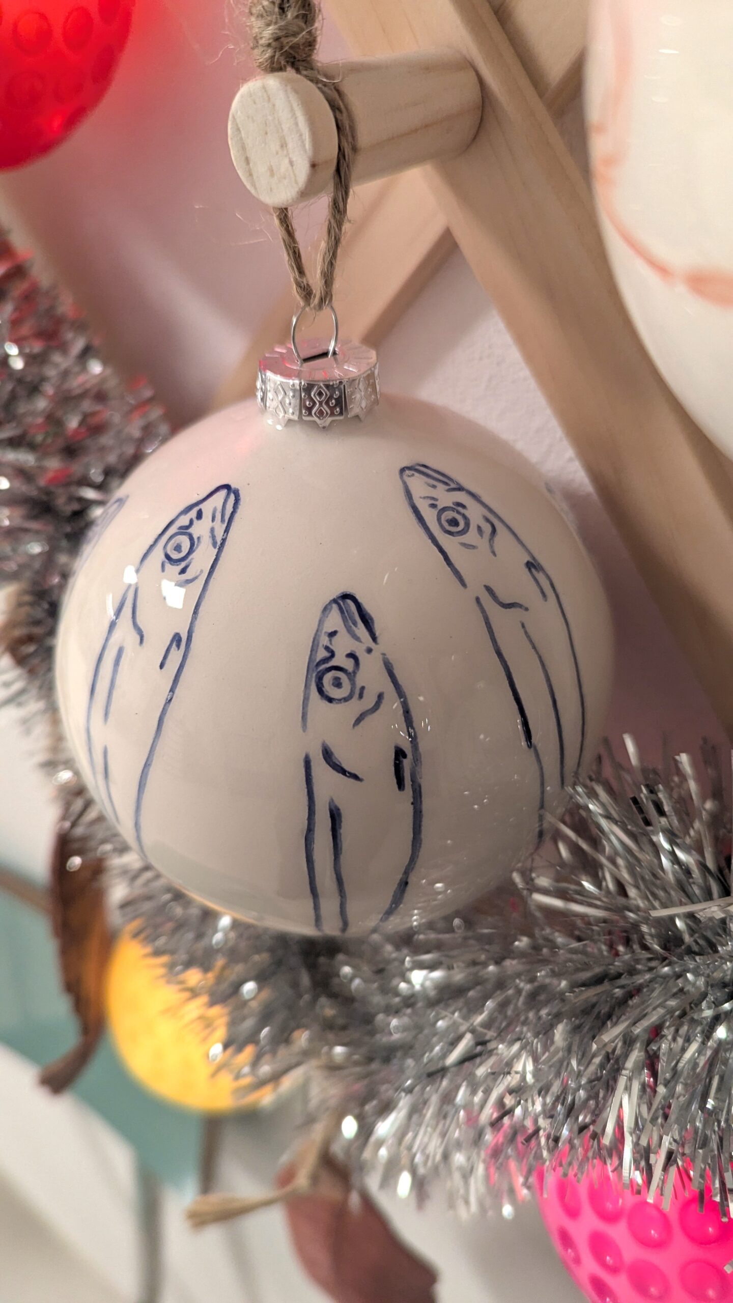 La sfera è stata realizzata incidendo la terra e nel solco creato è stato messo in un secondo momento il colore. Sono frammenti, la stessa immagine ripetuta, un attimo, un ricordo che resta indelebile. Sono paesaggi lontani, luoghi ormai offuscati dal tempo che lentamente li cancella. Il loro ricordo viene riportato alla luce grazie ad alcuni personaggi, delle piccole creature. Si accende un ricordo appeso, si dirada la nebbia, riaffiora il paesaggio, ricompare quel luogo che si credeva di aver perso. Ogni disegno è stato realizzato a mano, si compone di sei pesci incisi su una superficie di dodici centimetri di diametro. “Paesaggio Sfere” è un pezzo unico, non esiste una copia identica per forma, dimensione e colore dell’originale.