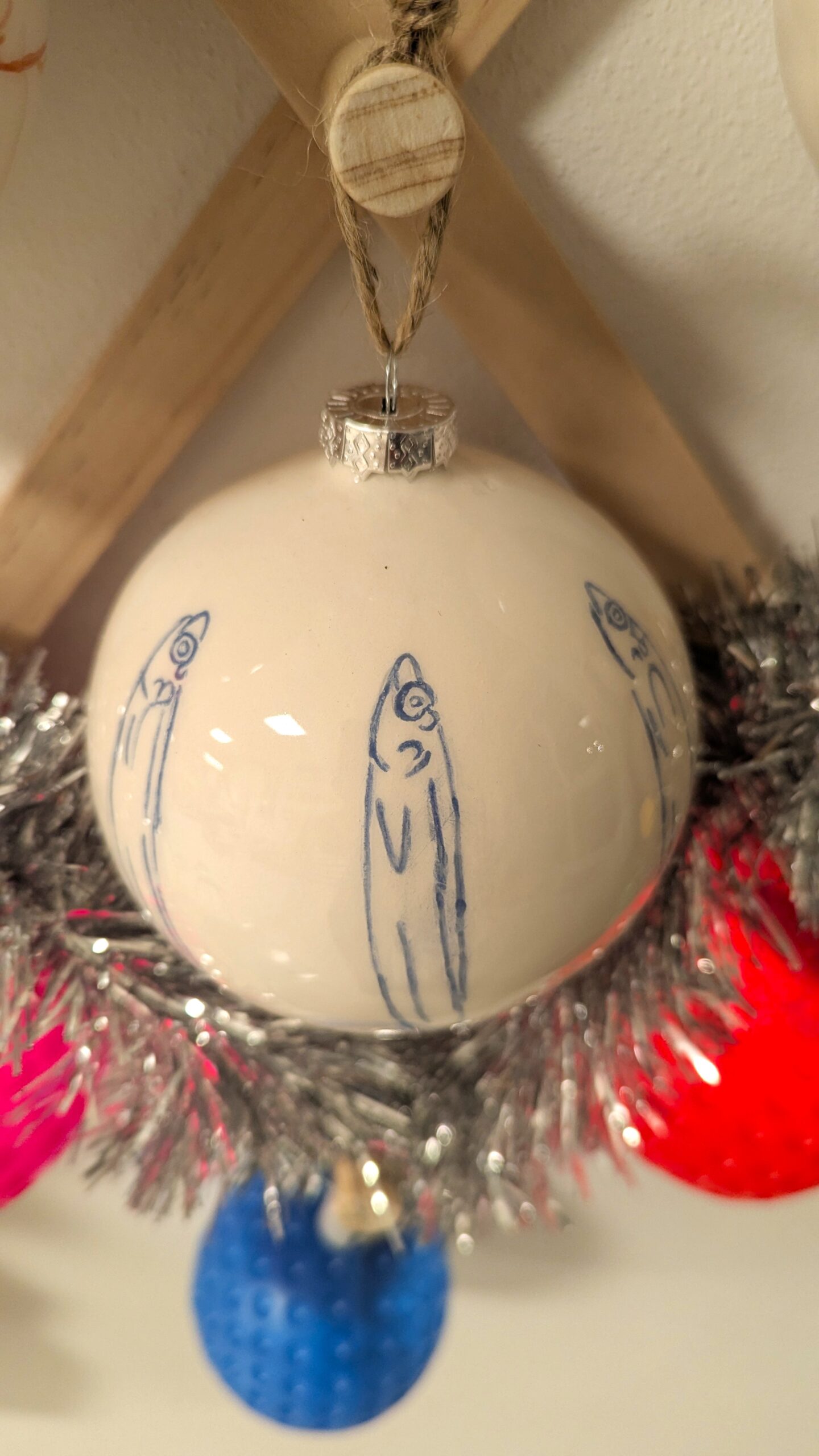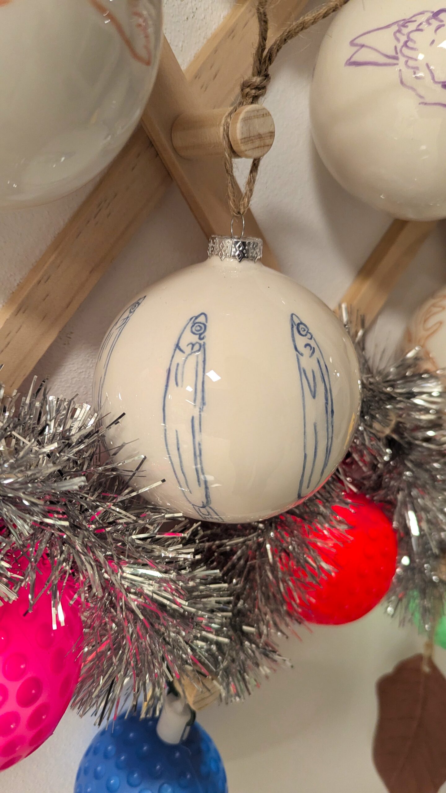 La sfera è stata realizzata incidendo la terra e nel solco creato è stato messo in un secondo momento il colore. Sono frammenti, la stessa immagine ripetuta, un attimo, un ricordo che resta indelebile. Sono paesaggi lontani, luoghi ormai offuscati dal tempo che lentamente li cancella. Il loro ricordo viene riportato alla luce grazie ad alcuni personaggi, delle piccole creature. Si accende un ricordo appeso, si dirada la nebbia, riaffiora il paesaggio, ricompare quel luogo che si credeva di aver perso. Ogni disegno è stato realizzato a mano, si compone di sei pesci incisi su una superficie di dodici centimetri di diametro. “Paesaggio Sfere” è un pezzo unico, non esiste una copia identica per forma, dimensione e colore dell’originale.
