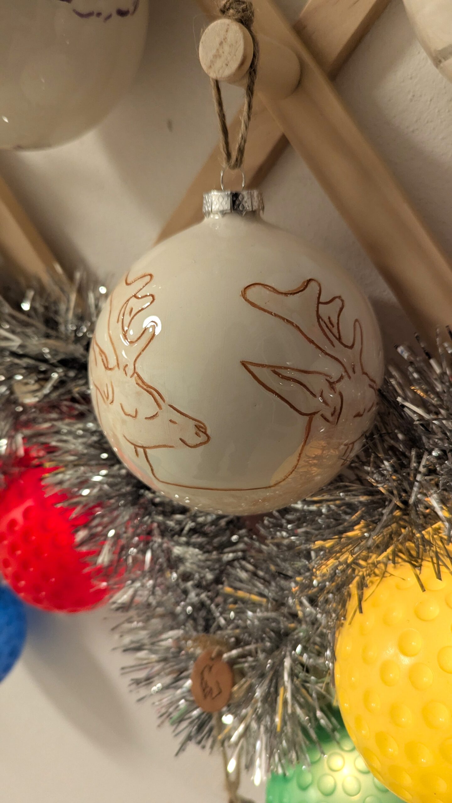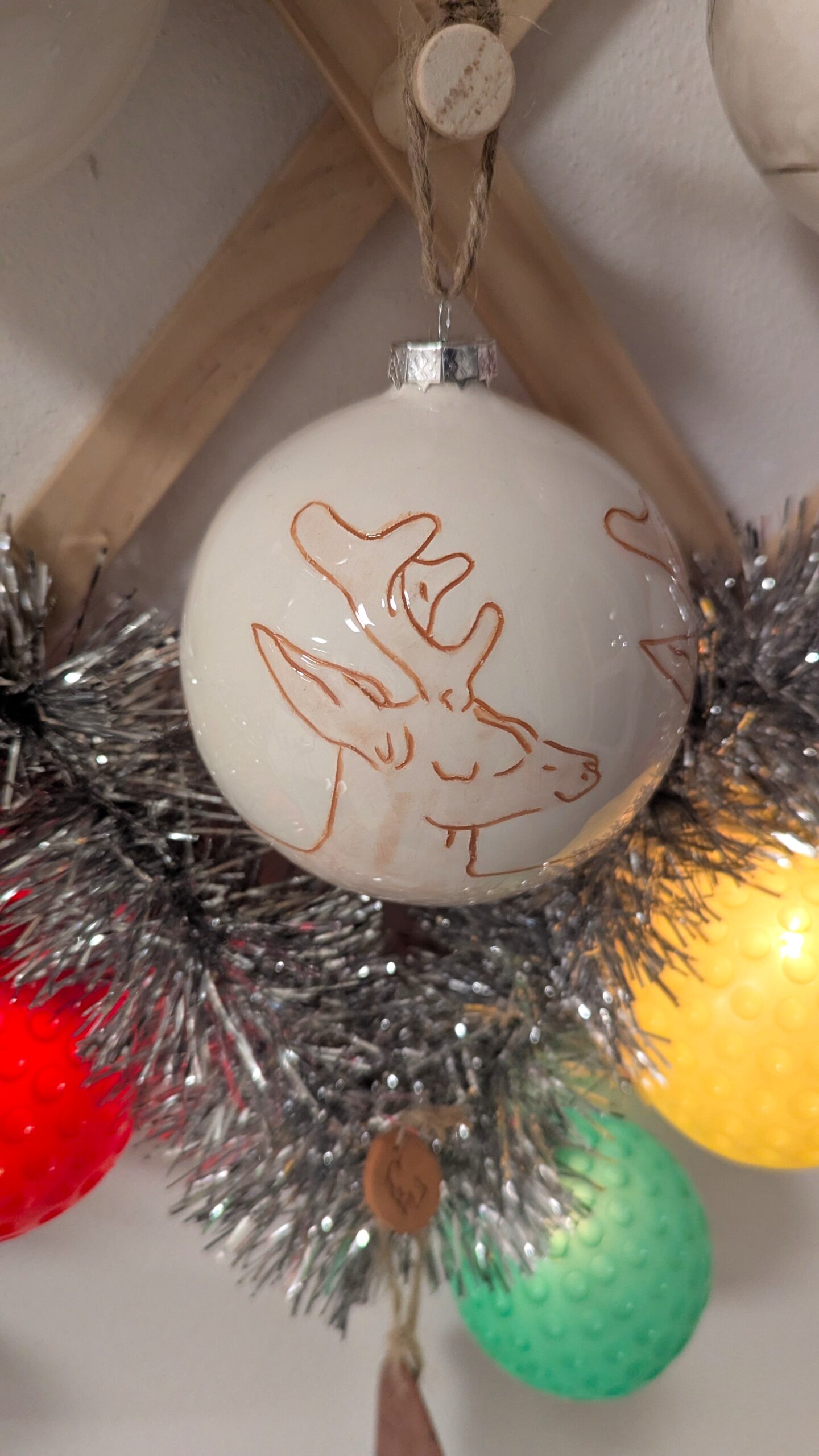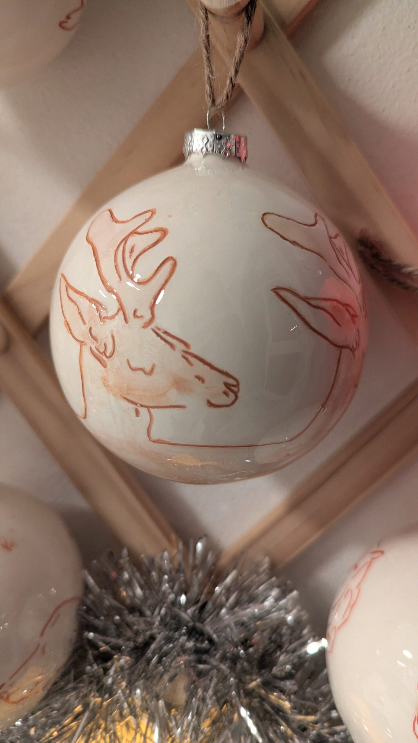 La sfera è stata realizzata incidendo la terra e nel solco creato è stato messo in un secondo momento il colore. Sono frammenti, la stessa immagine ripetuta, un attimo, un ricordo che resta indelebile. Sono paesaggi lontani, luoghi ormai offuscati dal tempo che lentamente li cancella. Il loro ricordo viene riportato alla luce grazie ad alcuni personaggi, delle piccole creature. Si accende un ricordo appeso, si dirada la nebbia, riaffiora il paesaggio, ricompare quel luogo che si credeva di aver perso. Ogni disegno è stato realizzato a mano, si compone di quattro cervi incisi su una superficie di dodici centimetri di diametro. “Paesaggio Sfere” è un pezzo unico, non esiste una copia identica per forma, dimensione e colore dell’originale.