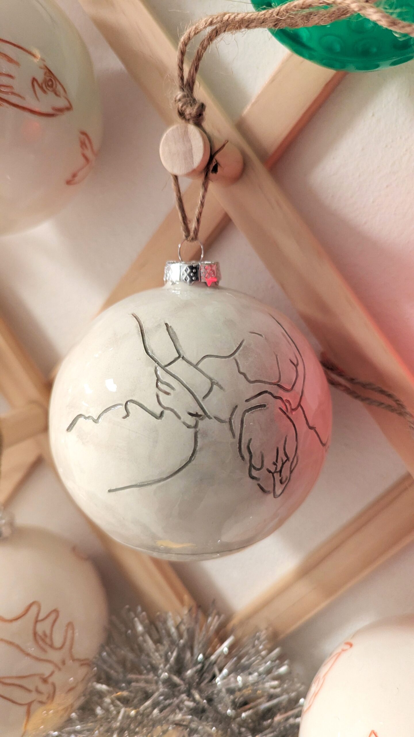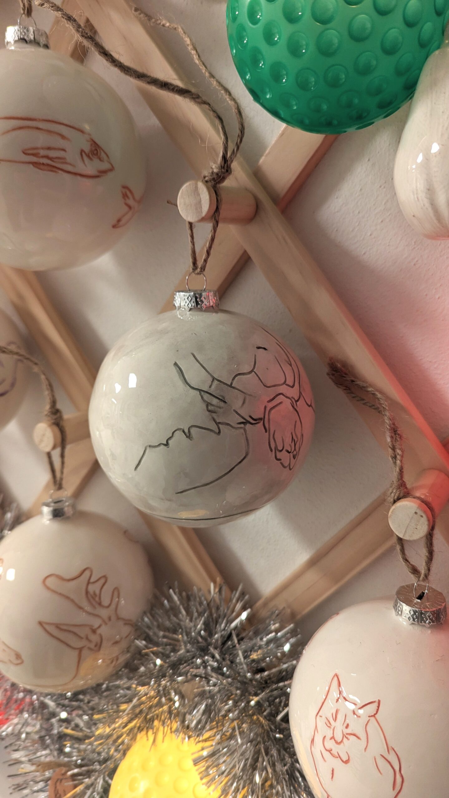 La sfera è stata realizzata incidendo la terra e nel solco creato è stato messo in un secondo momento il colore. Sono frammenti, la stessa immagine ripetuta, un attimo, un ricordo che resta indelebile. Sono paesaggi lontani, luoghi ormai offuscati dal tempo che lentamente li cancella. Il loro ricordo viene riportato alla luce grazie ad alcuni personaggi, delle piccole creature. Si accende un ricordo appeso, si dirada la nebbia, riaffiora il paesaggio, ricompare quel luogo che si credeva di aver perso. Ogni disegno è stato realizzato a mano, si compone di due tartarughe incise su una superficie di dodici centimetri di diametro. “Paesaggio Sfere” è un pezzo unico, non esiste una copia identica per forma, dimensione e colore dell’originale.
