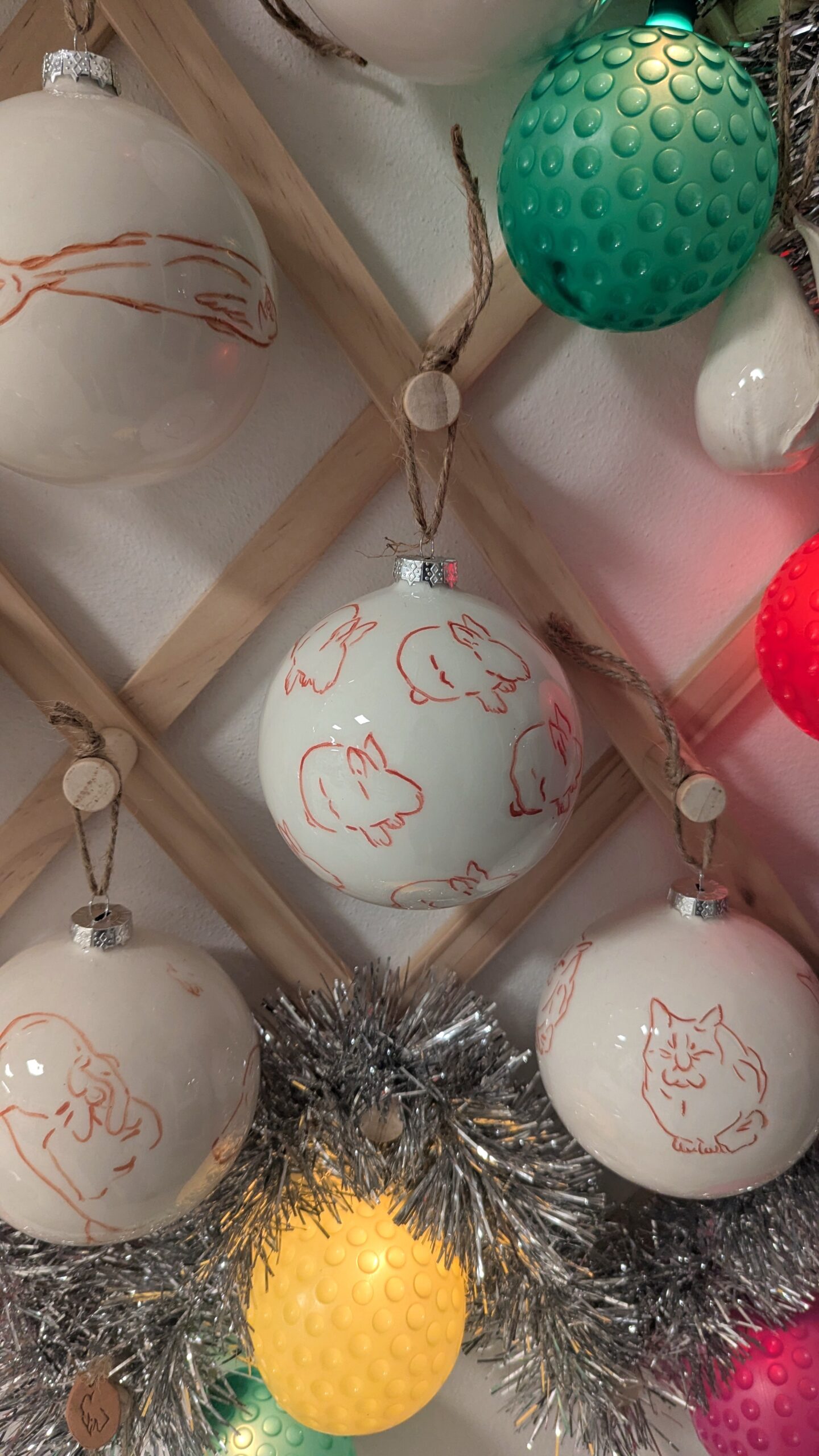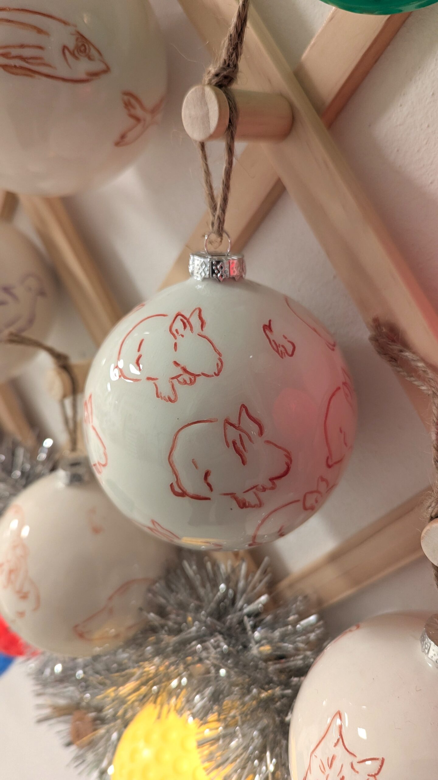 La sfera è stata realizzata incidendo la terra e nel solco creato è stato messo in un secondo momento il colore. Sono frammenti, la stessa immagine ripetuta, un attimo, un ricordo che resta indelebile. Sono paesaggi lontani, luoghi ormai offuscati dal tempo che lentamente li cancella. Il loro ricordo viene riportato alla luce grazie ad alcuni personaggi, delle piccole creature. Si accende un ricordo appeso, si dirada la nebbia, riaffiora il paesaggio, ricompare quel luogo che si credeva di aver perso. Ogni disegno è stato realizzato a mano, si compone di cinque conigli incisi su una superficie di dodici centimetri di diametro. “Paesaggio Sfere” è un pezzo unico, non esiste una copia identica per forma, dimensione e colore dell’originale.