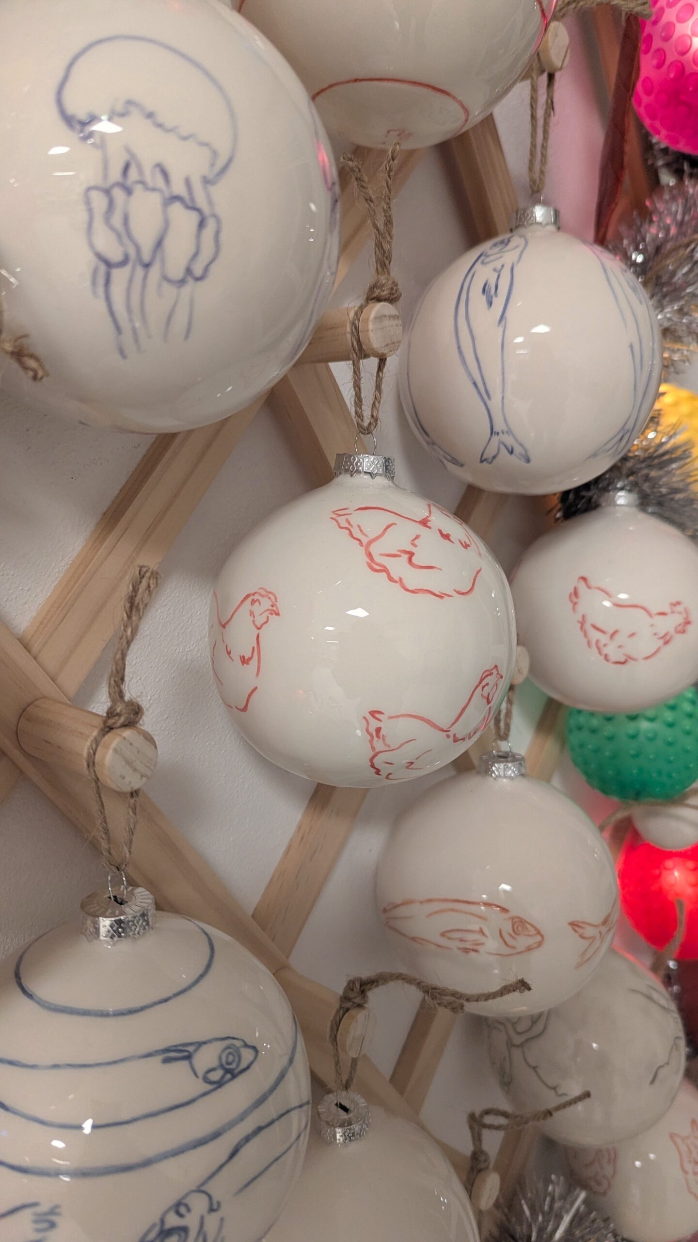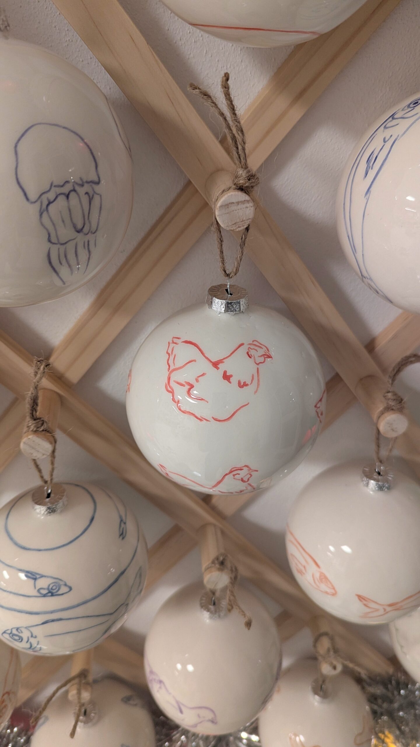 La sfera è stata realizzata incidendo la terra e nel solco creato è stato messo in un secondo momento il colore. Sono frammenti, la stessa immagine ripetuta, un attimo, un ricordo che resta indelebile. Sono paesaggi lontani, luoghi ormai offuscati dal tempo che lentamente li cancella. Il loro ricordo viene riportato alla luce grazie ad alcuni personaggi, delle piccole creature. Si accende un ricordo appeso, si dirada la nebbia, riaffiora il paesaggio, ricompare quel luogo che si credeva di aver perso. Ogni disegno è stato realizzato a mano, si compone di sei galline incise su una superficie di dodici centimetri di diametro. “Paesaggio Sfere” è un pezzo unico, non esiste una copia identica per forma, dimensione e colore dell’originale.