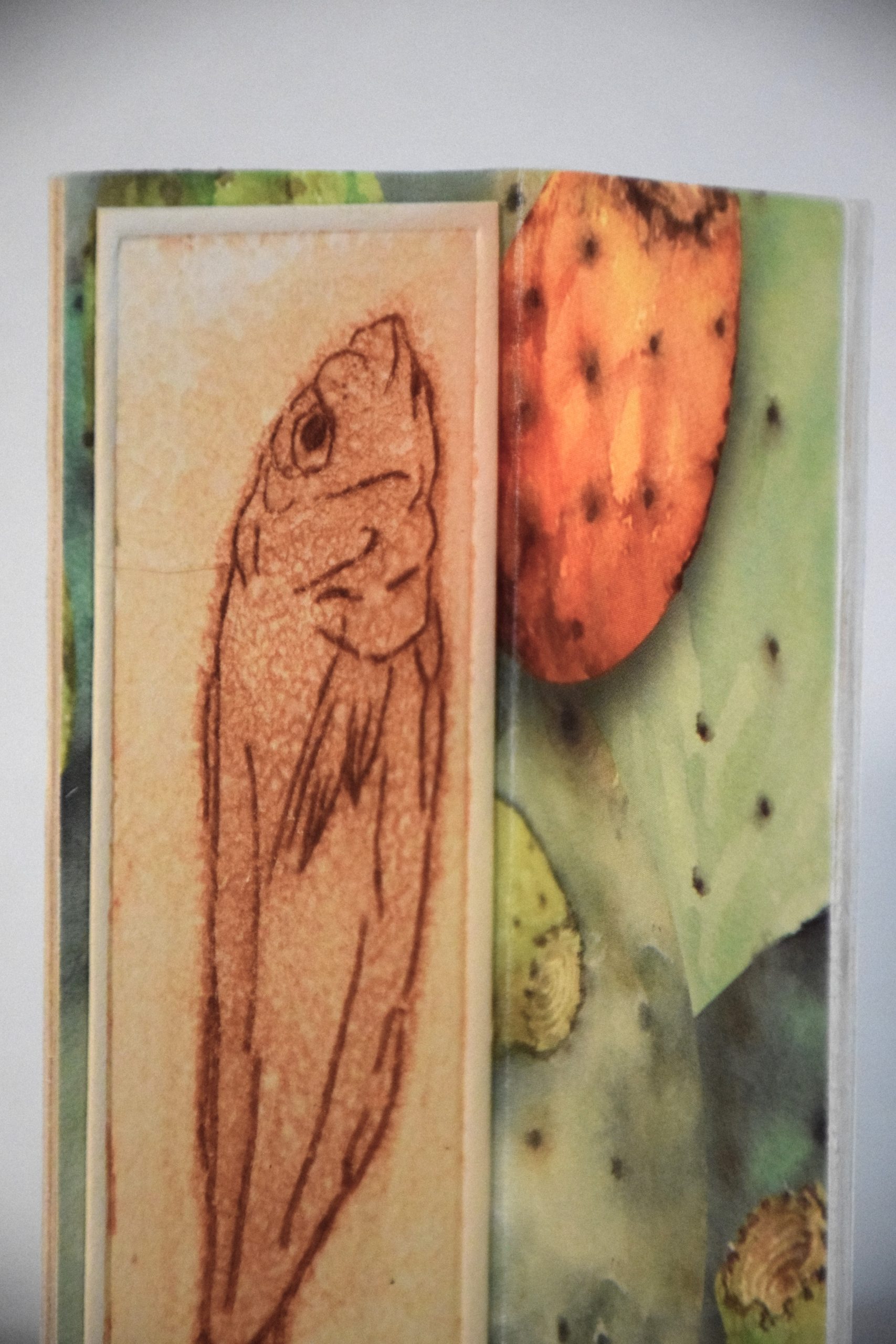 Sono opere libere di potersi muovere nell’ambiente, di essere manipolate, possono restare chiuse, aperte, possono essere spostate in diversi luoghi, viaggiare nelle tasche. L’idea del quadro da tasca è nata per liberare il quadro dal vincolo della parete e avvicinarlo alle persone, creando qualcosa di piccolo che può essere tenuto in mano. È stato realizzato con carta decorata, legno e come protagonista un’incisione a puntasecca che raffigura una triglia. È un pezzo unico, non esiste una copia identica per forma, dimensione e colore all’originale.