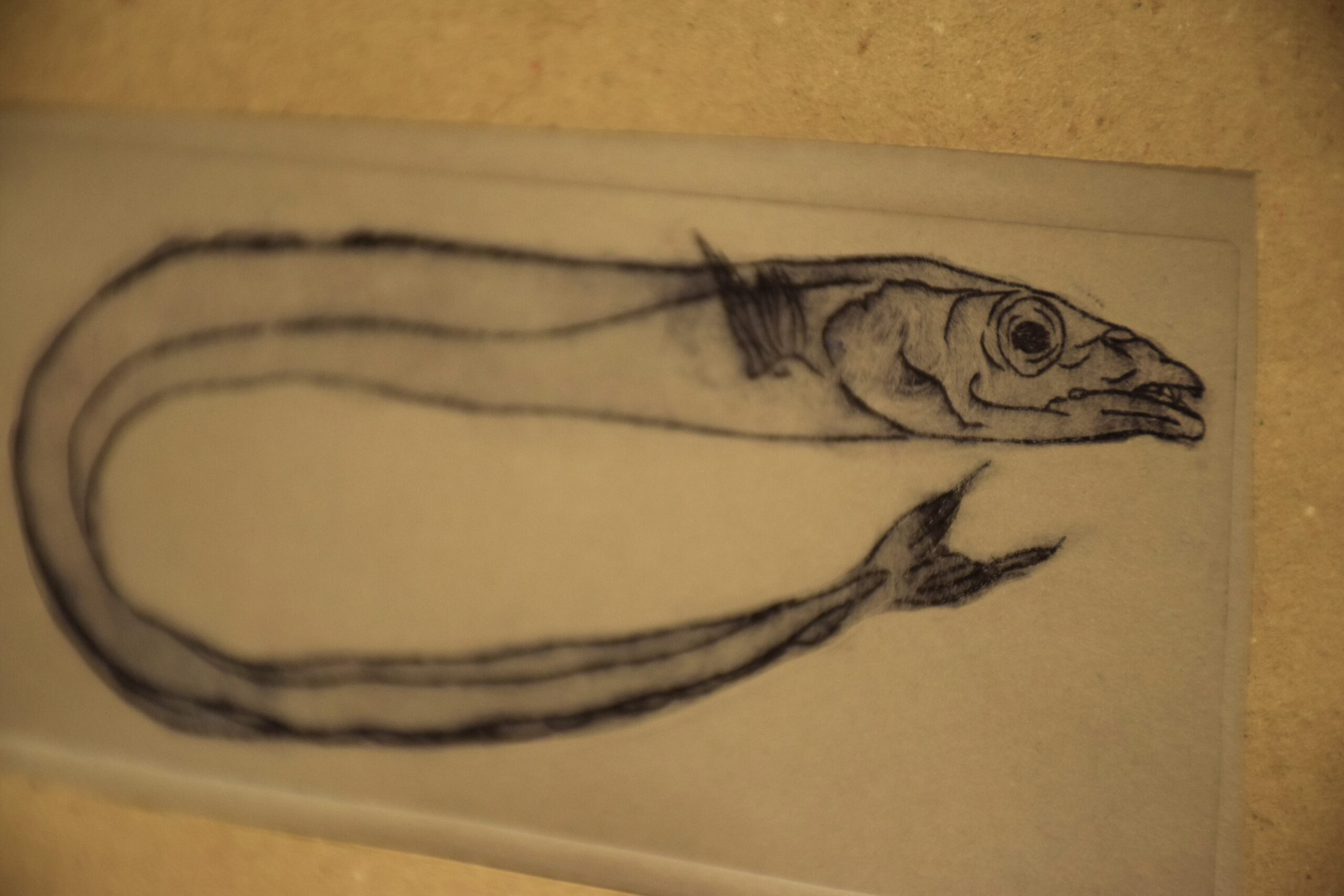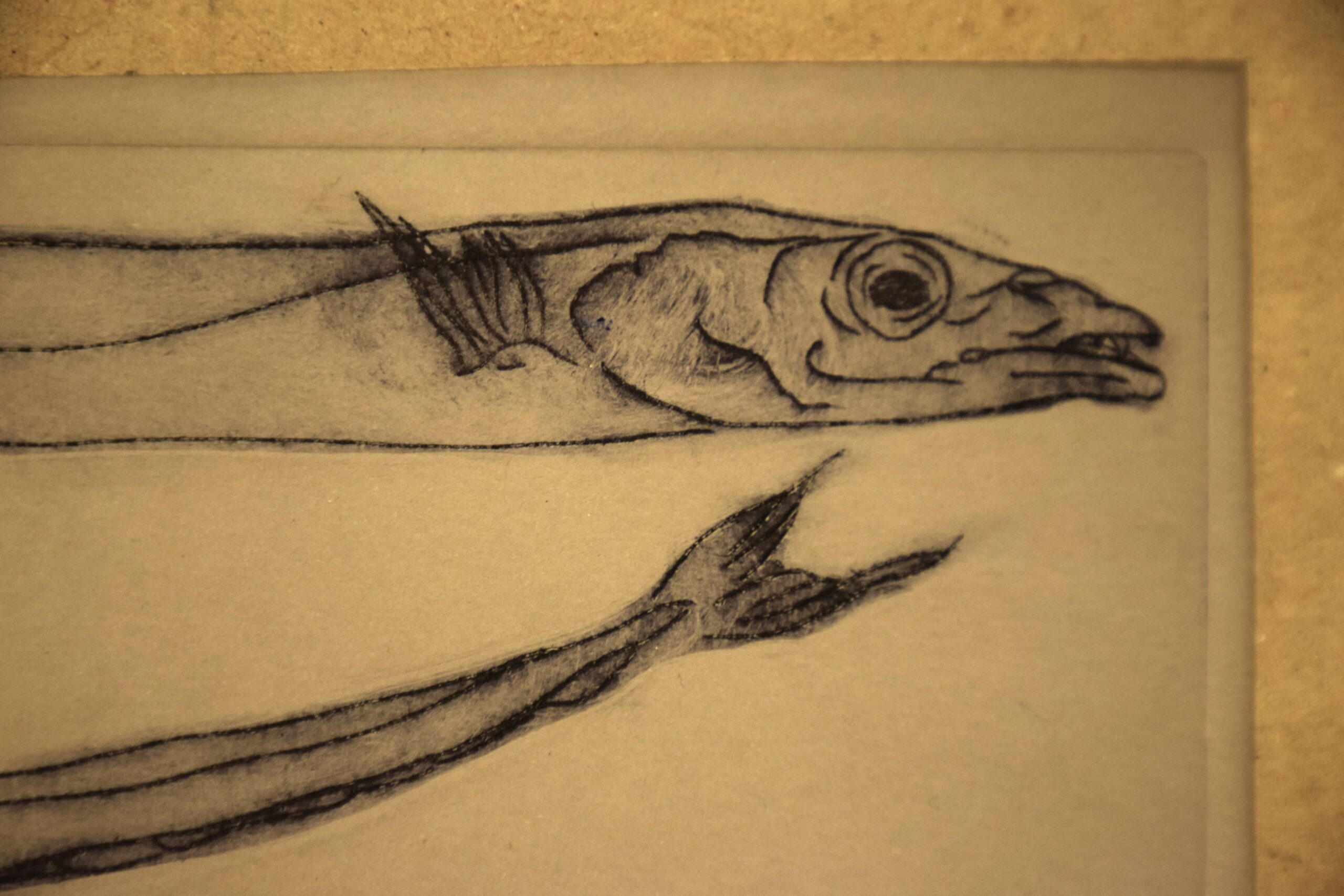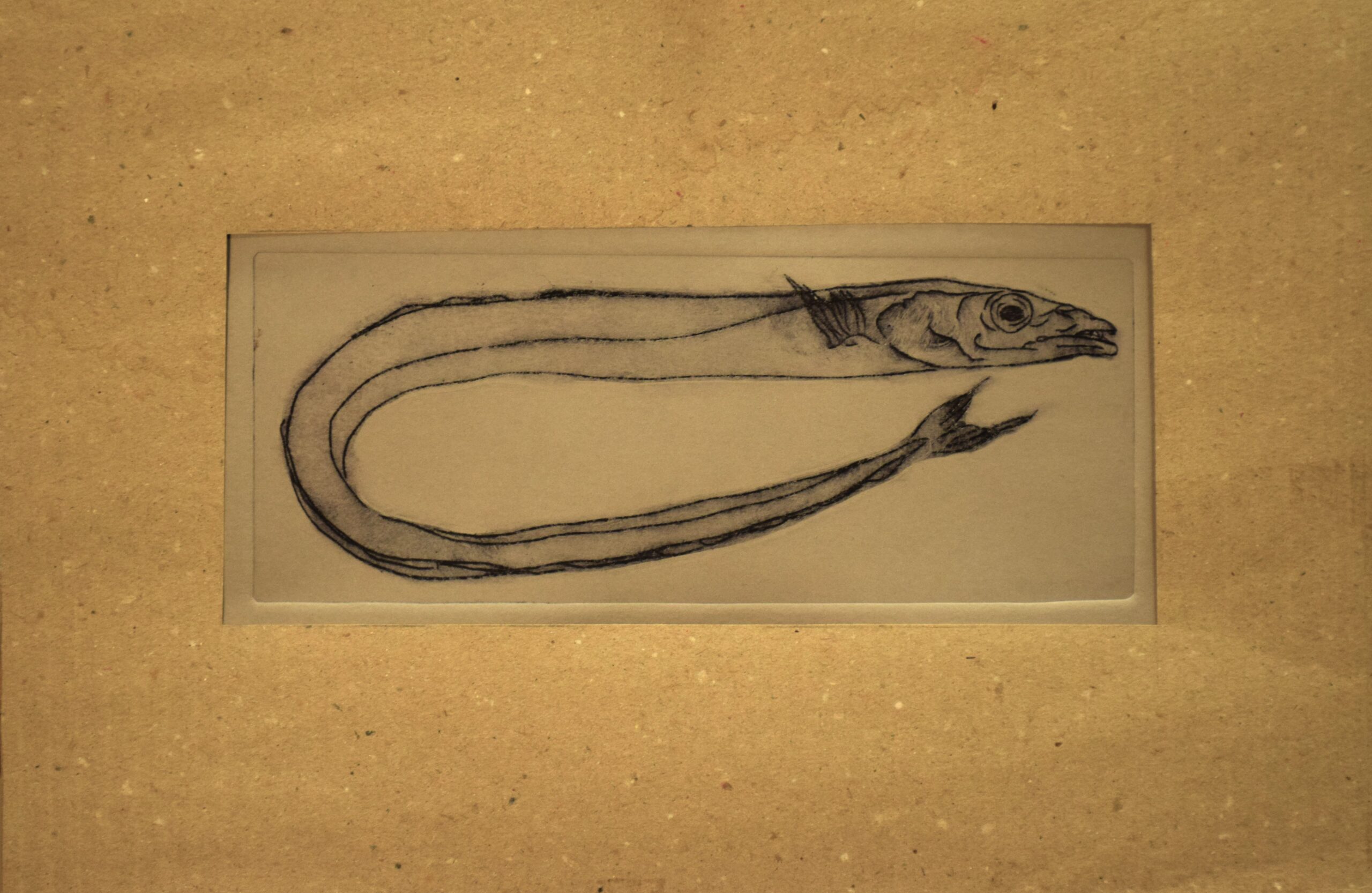 L’incisione a puntasecca è una tecnica grafica che consiste nel graffiare con una punta affilata un supporto morbido come ad esempio il rame, il plexiglas o lo zinco. Una volta disegnata, o meglio graffiata, la tavoletta può essere inchiostrata e stampata sulla carta con l’aiuto di un torchio. Questa tecnica permette di riprodurre la stessa immagine incisa un certo numero di volte che vengono riportate dall’artista in fondo alla stampa ad esempio 1/50 ovvero stampa prima su cinquanta copie. “Paesaggio, pesci” non ha un numero di tiratura perché ogni esemplare è unico in quanto si è intervenuti sulla matrice, prima della stampa, lasciando in alcuni punti dei residui d’inchiostro creando delle stampe simili alla pittura, che non si possono riprodurre.