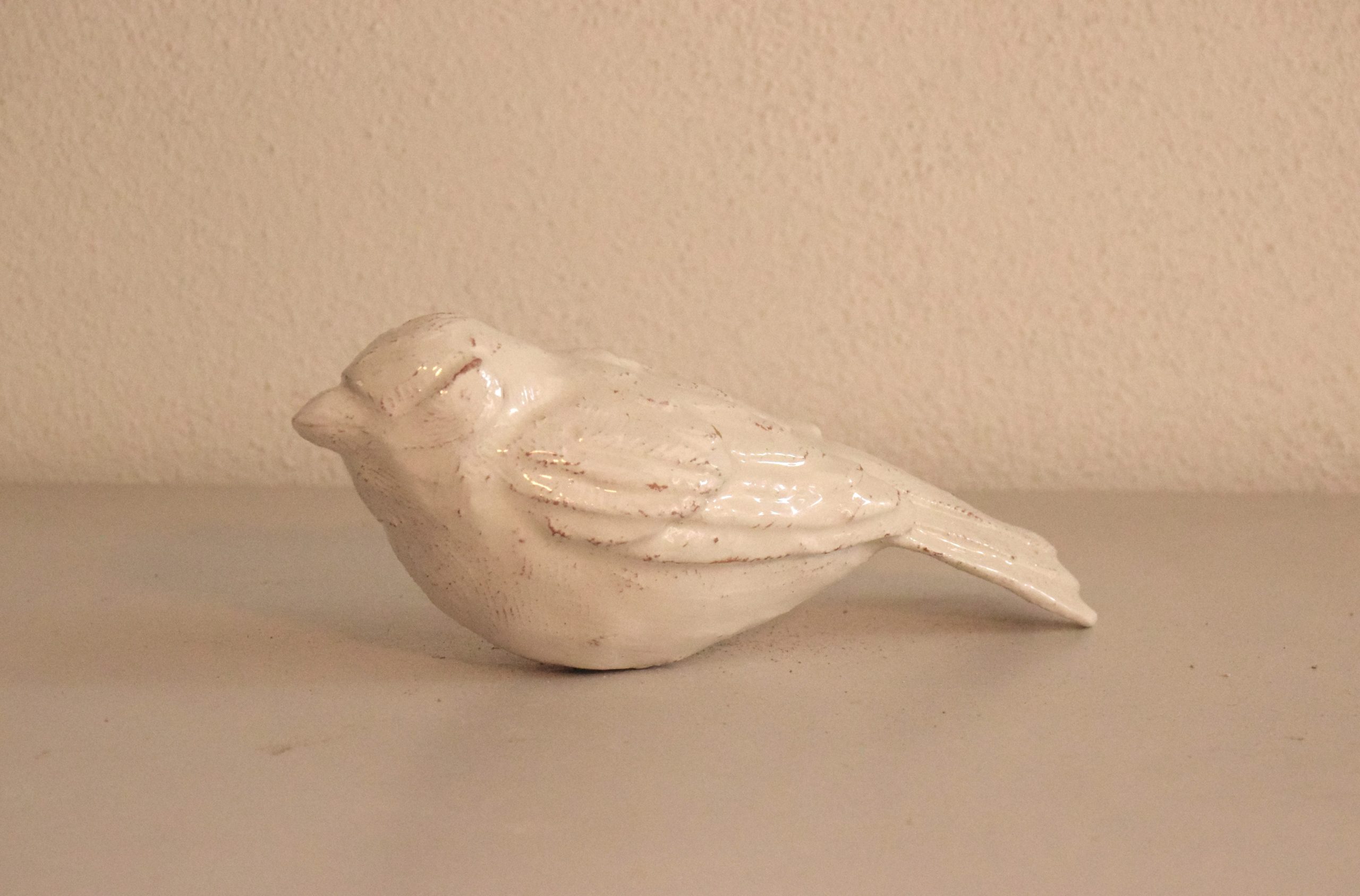 Sono piccoli, volano rapidi, si appoggiano sui rami, sulle sedie in cerca di cibo per poi scomparire, riapparire. Sono buffi con le loro forme paffute portano allegria quando li si sorprende vicini. Sono presenti in ogni luogo e si accorgono dei cambiamenti della natura ne portano il suo messaggio. Questa scultura fa parte di uno studio più grande che vede spesso gli uccellini accostati ad alcune parole, pensieri o frammenti di alcuni luoghi da cui provengono. È stato realizzato con argilla rossa e occupa uno spazio di quindici centimetri di lunghezza, cinque di larghezza e sei di altezza. Il “Passero bianco” è un pezzo unico, non esiste una copia identica per forma, dimensione e colore all’originale.