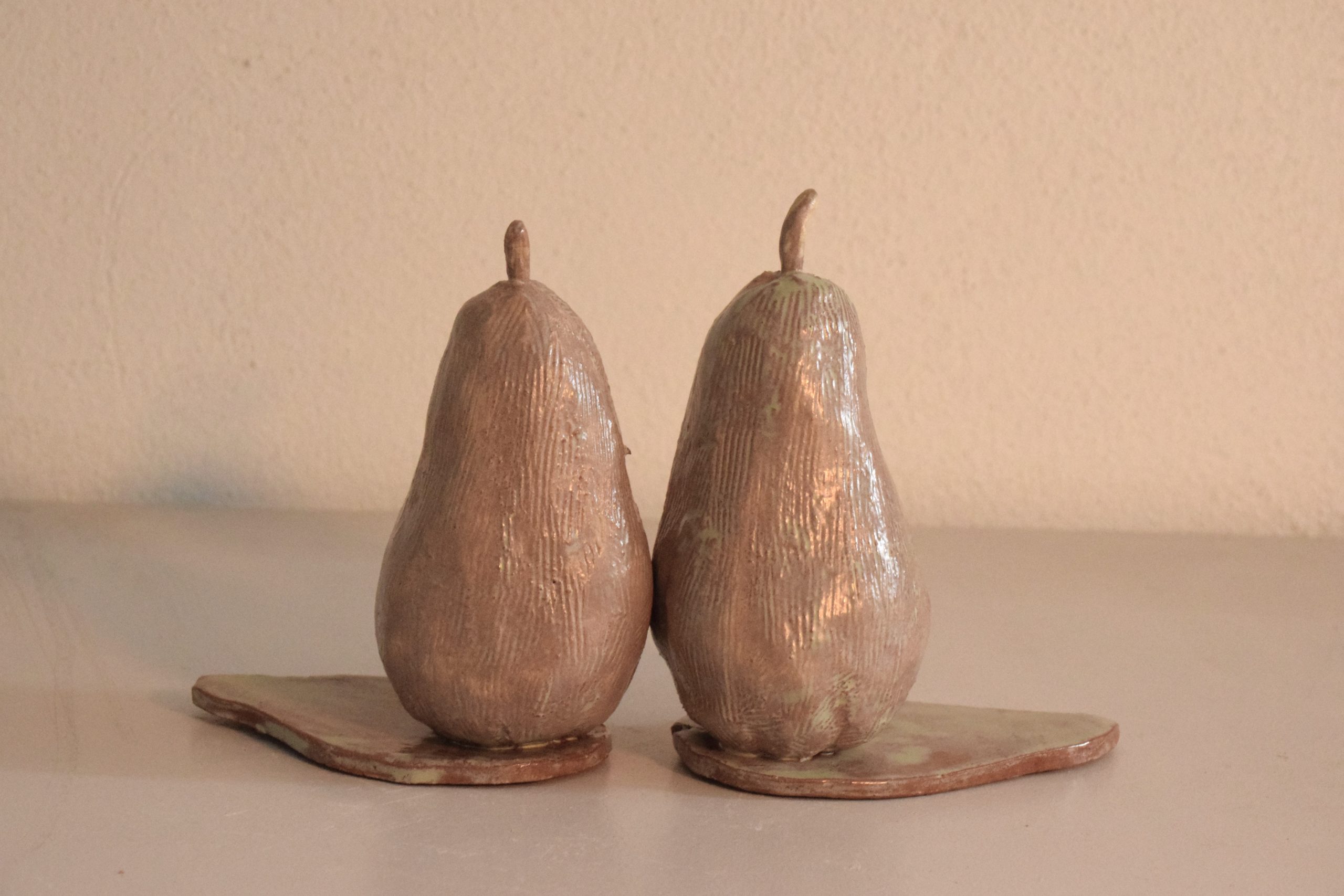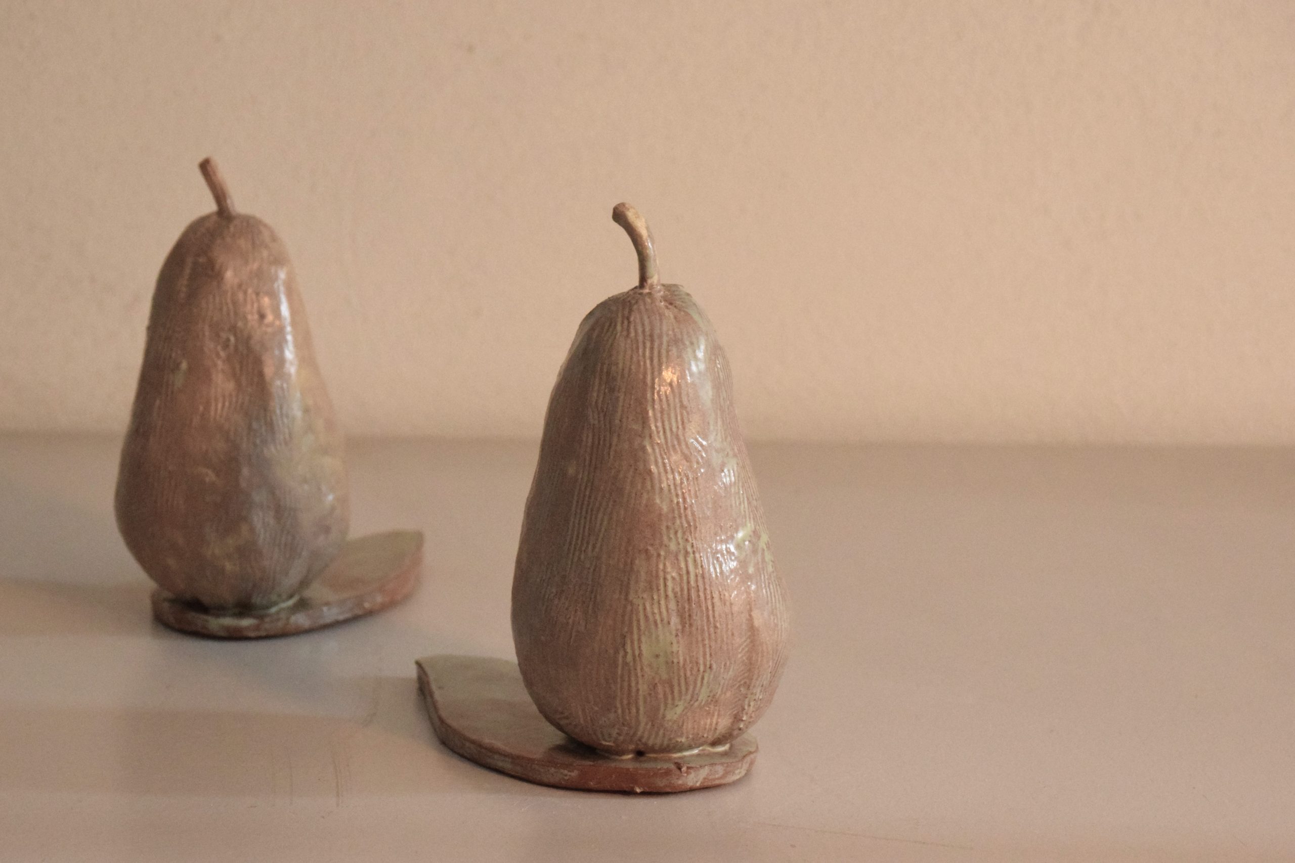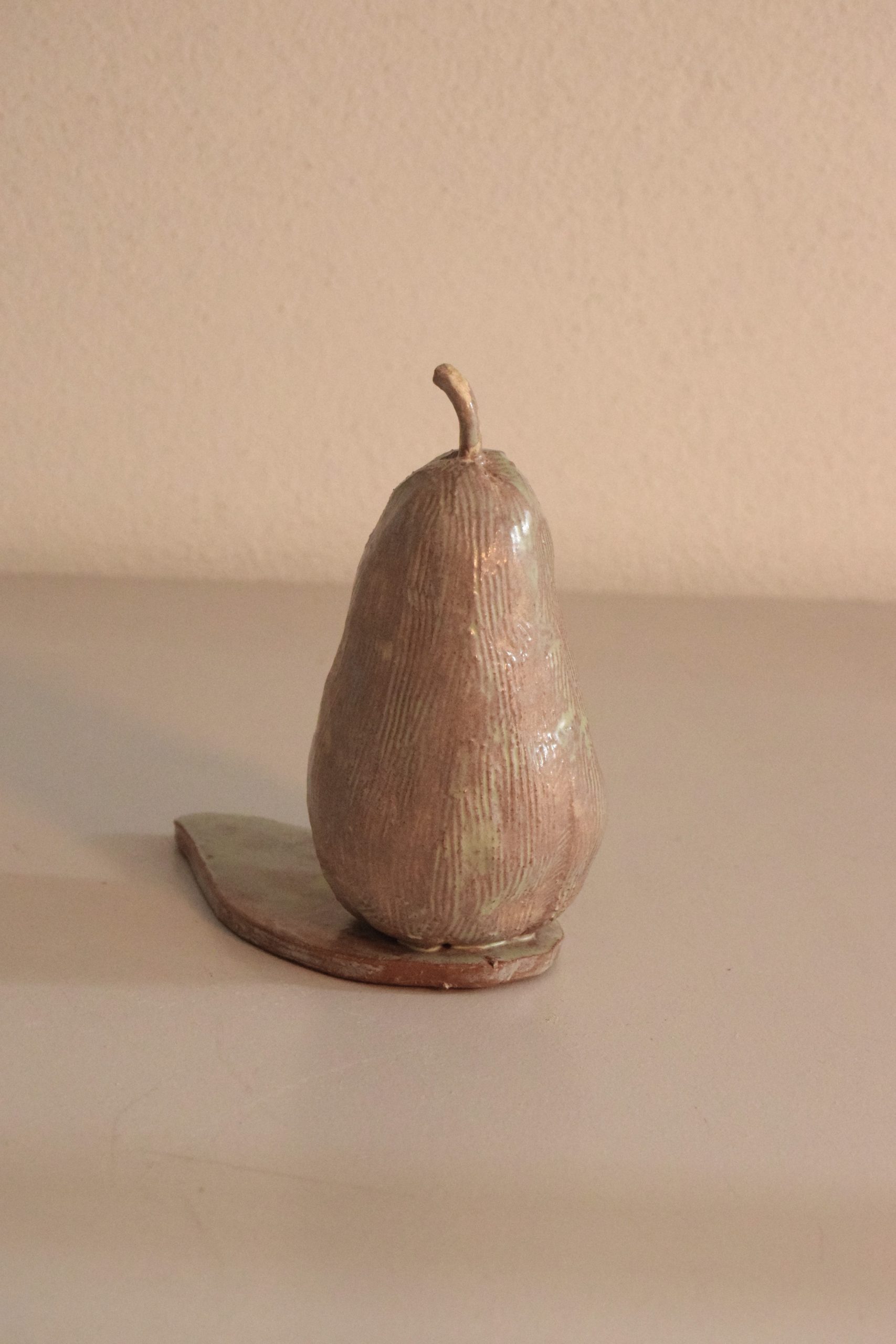 La pera è stata realizzata in argilla rossa e smalto. Si vuole ricreare effetto dell’ombra che quando è molto forte prende corpo e sembra sorreggere il frutto. La pera e la sua ombra sono stati realizzati interamente a mano per una larghezza di dieci per sei centimetri e un’altezza di undici. La “Pera verde” è un pezzo unico, non esiste una copia identica per forma, dimensione e colore all’originale.