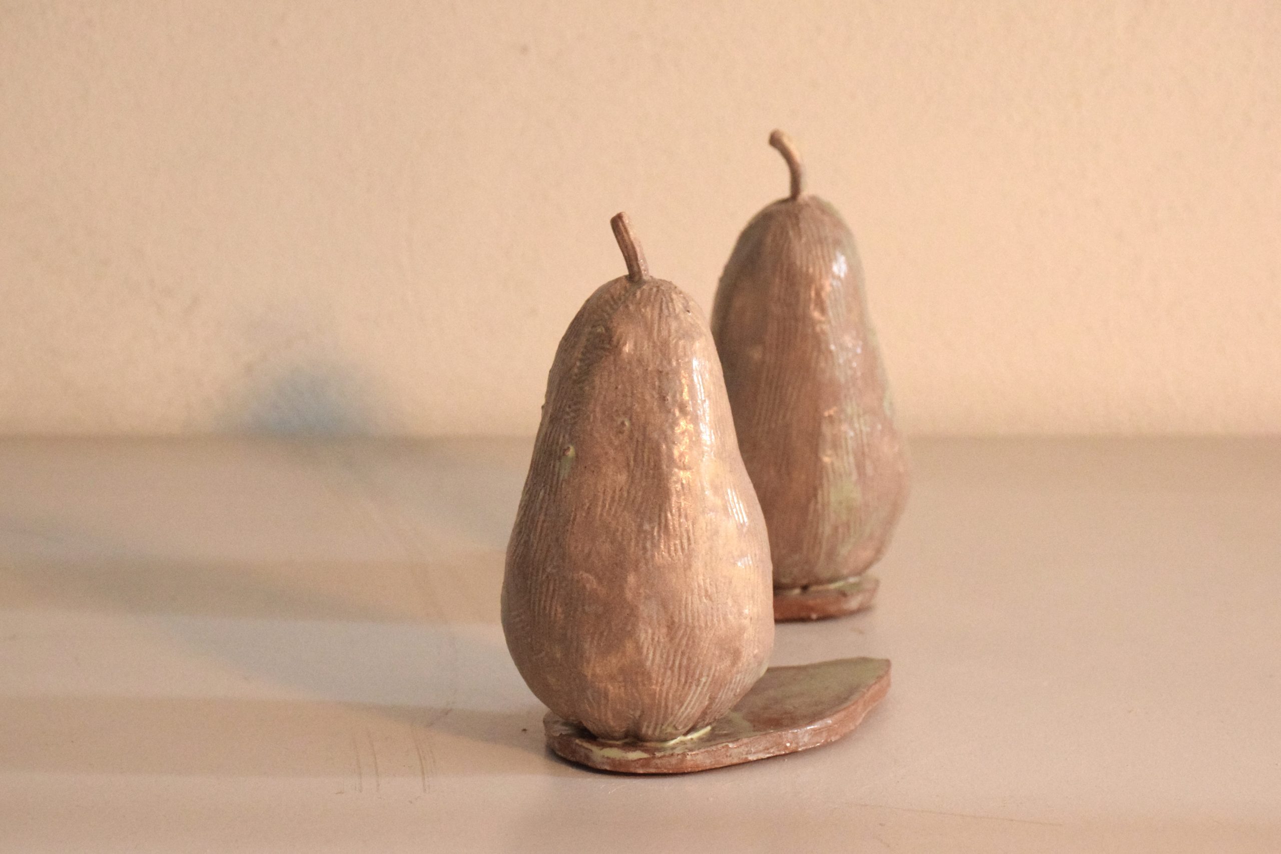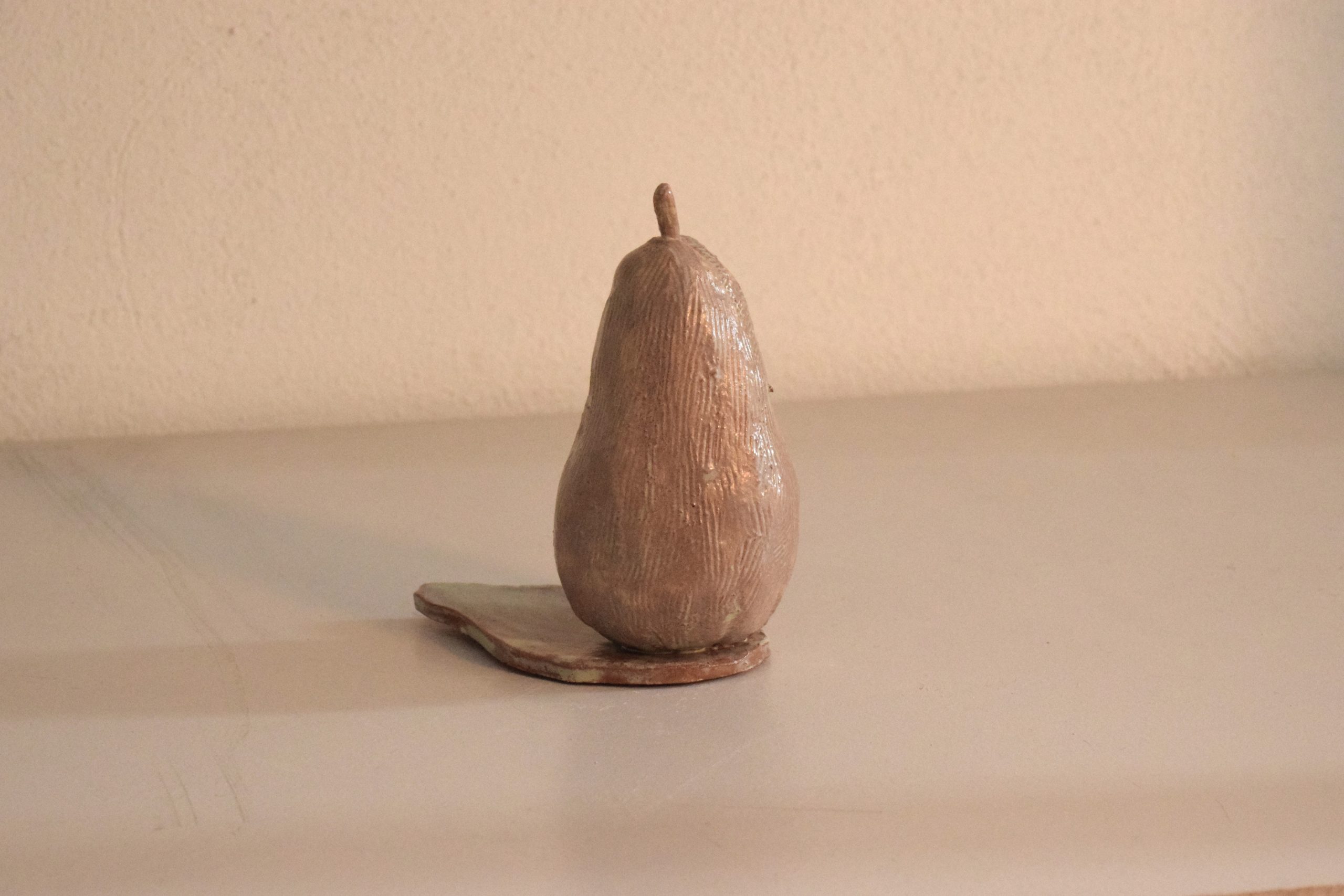 La pera è stata realizzata in argilla rossa e smalto. Si vuole ricreare effetto dell’ombra che quando è molto forte prende corpo e sembra sorreggere il frutto. La pera e la sua ombra sono stati realizzati interamente a mano per una larghezza di nove per cinque centimetri e un’altezza di undici. La “Pera verde” è un pezzo unico, non esiste una copia identica per forma, dimensione e colore all’originale.