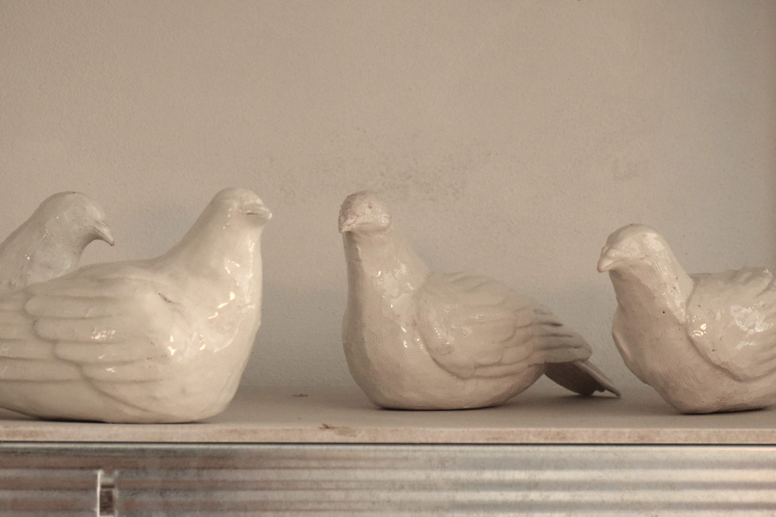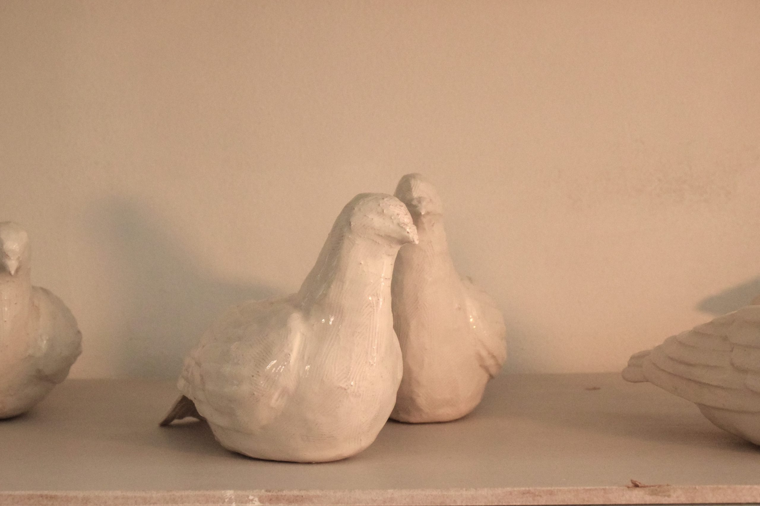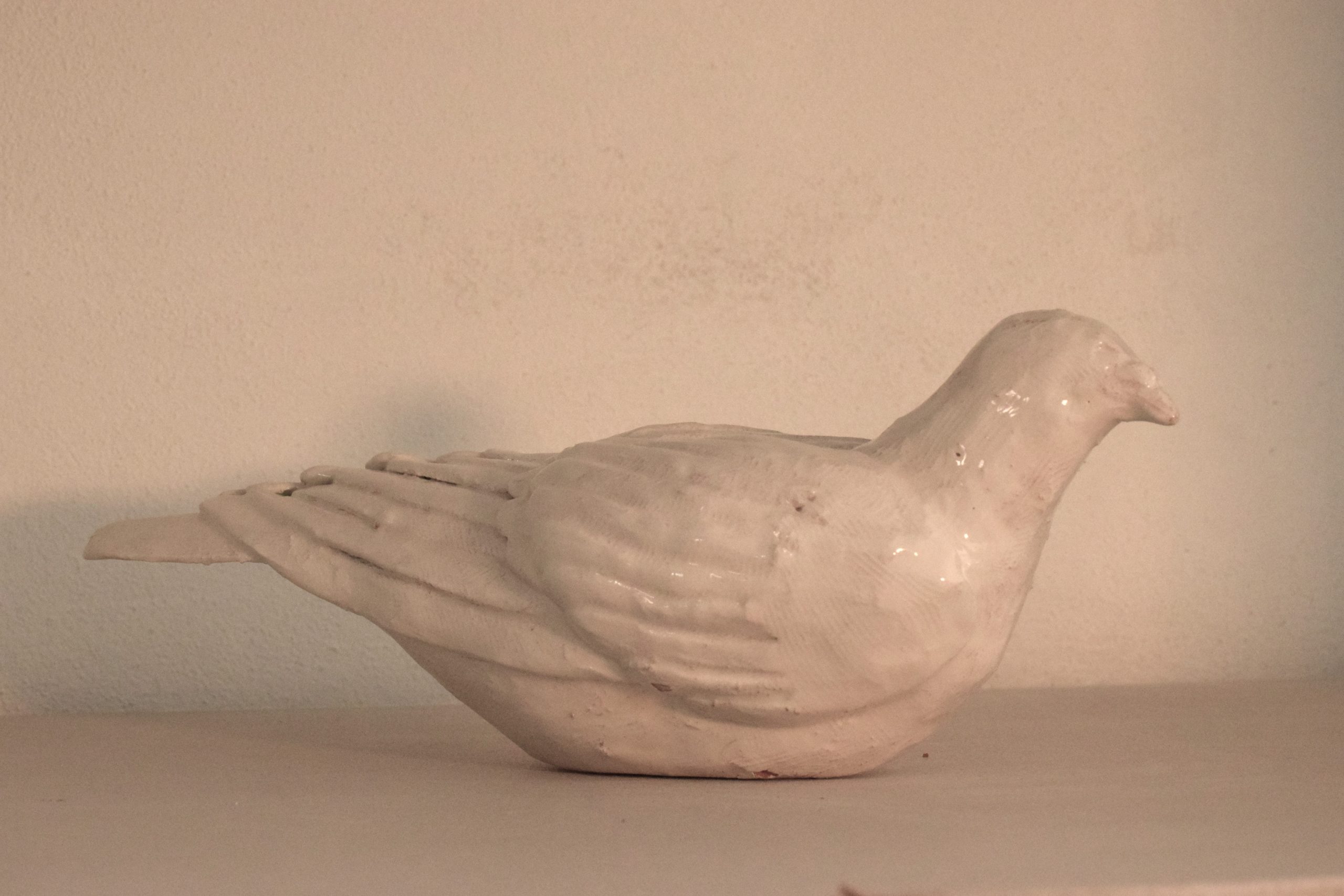 Questo piccione appartiene ad una serie di sculture realizzate per un’installazione. Sono invadenti, fastidiosi, entrano nei locali, salgono sulle statue, gli edifici, i davanzali, ovunque sentano un po' di tepore o dove ci sia un po' di cibo. Siamo abituati a vedere il piccione come qualcosa di sporco, di polveroso, da cacciare e tenere lontano dalle case. In questa scultura l’immagine del piccione è ribaltata, non siamo noi vittime degli sfacciati piccioni ma sono loro le vittime del cambiamento che ha prodotto l’uomo sull’ambiente. Allontanati dalla terra sono ora bianchi simbolo di un equilibrio che è stato modificato e che resta indelebile. Il piccione è stato realizzato in argilla rossa, argilla bianca e cristallina trasparente, occupa una superficie di ventisette centimetri di lunghezza per nove di larghezza e dieci di altezza. Il “Piccione” è un pezzo unico, non esiste una copia identica per forma, dimensione e colore all’originale.