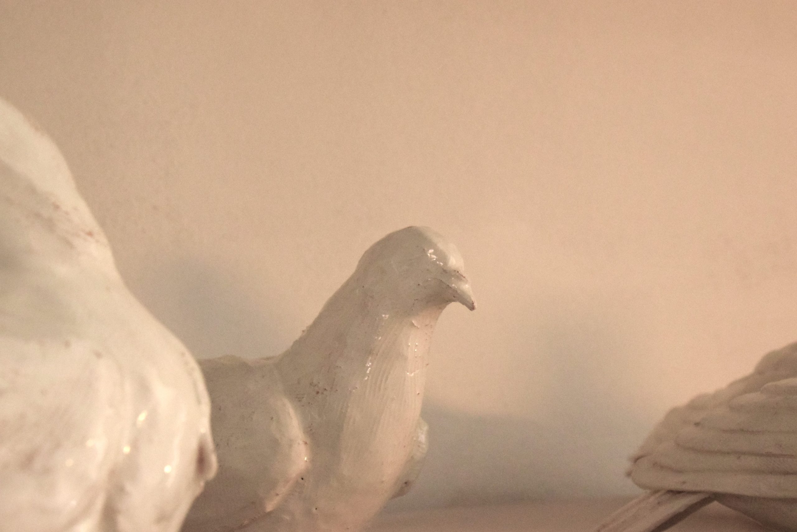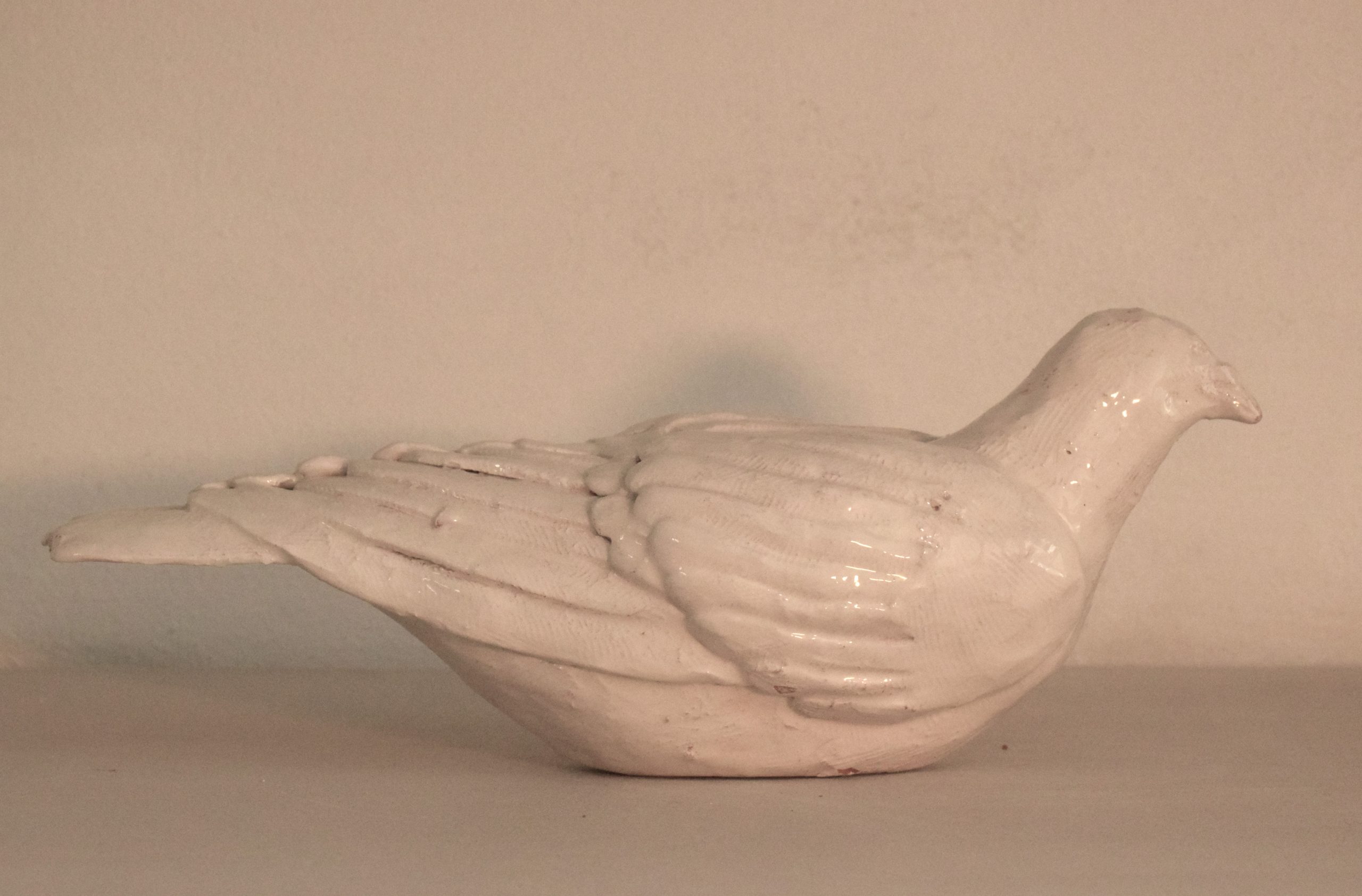 Questo piccione appartiene ad una serie di sculture realizzate per un’installazione. Sono invadenti, fastidiosi, entrano nei locali, salgono sulle statue, gli edifici, i davanzali, ovunque sentano un po' di tepore o dove ci sia un po' di cibo. Siamo abituati a vedere il piccione come qualcosa di sporco, di polveroso, da cacciare e tenere lontano dalle case. In questa scultura l’immagine del piccione è ribaltata, non siamo noi vittime degli sfacciati piccioni ma sono loro le vittime del cambiamento che ha prodotto l’uomo sull’ambiente. Allontanati dalla terra sono ora bianchi simbolo di un equilibrio che è stato modificato e che resta indelebile. Il piccione è stato realizzato in argilla rossa, argilla bianca e cristallina trasparente, occupa una superficie di ventinove centimetri di lunghezza per nove di larghezza e undici di altezza. Il “Piccione” è un pezzo unico, non esiste una copia identica per forma, dimensione e colore all’originale.
