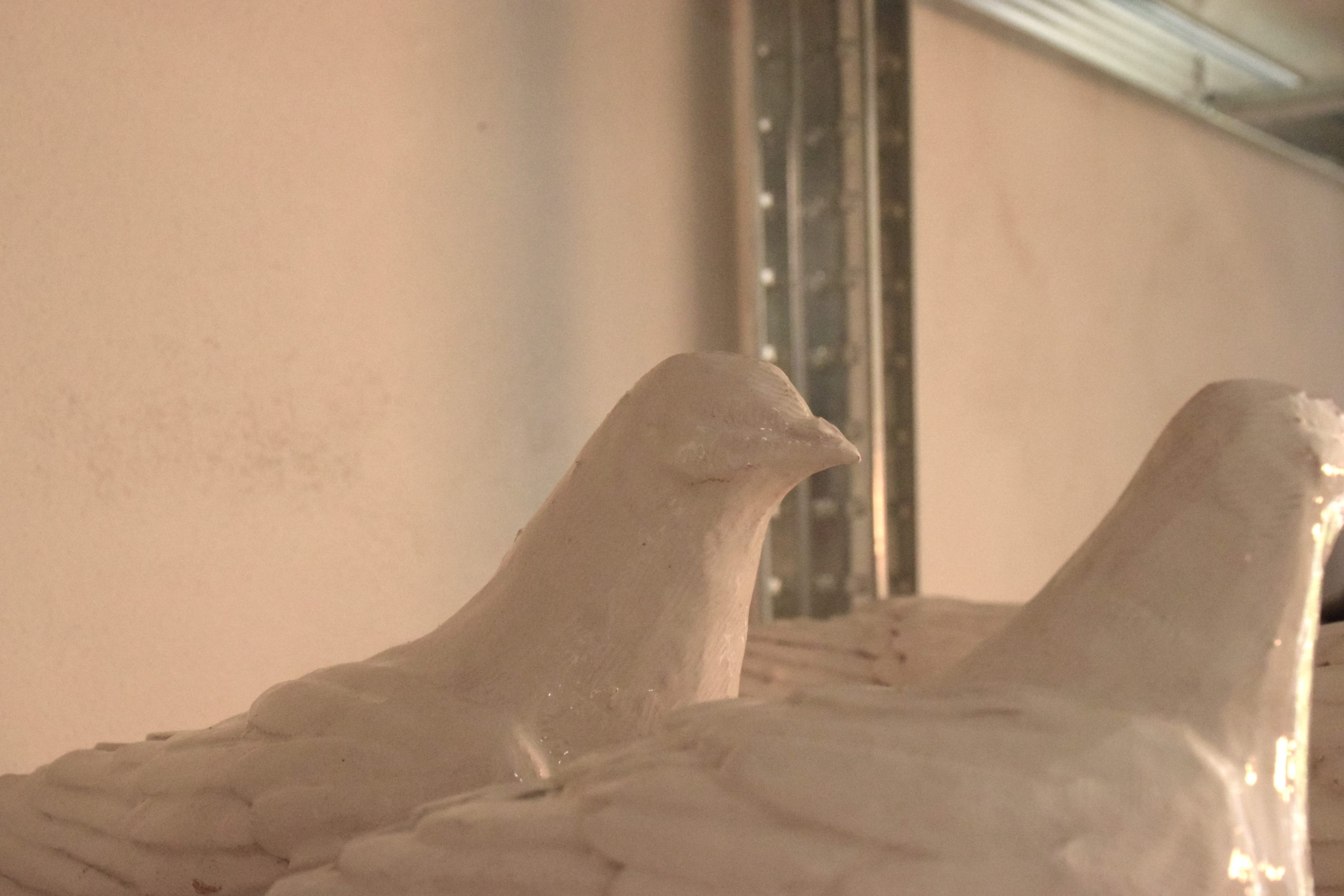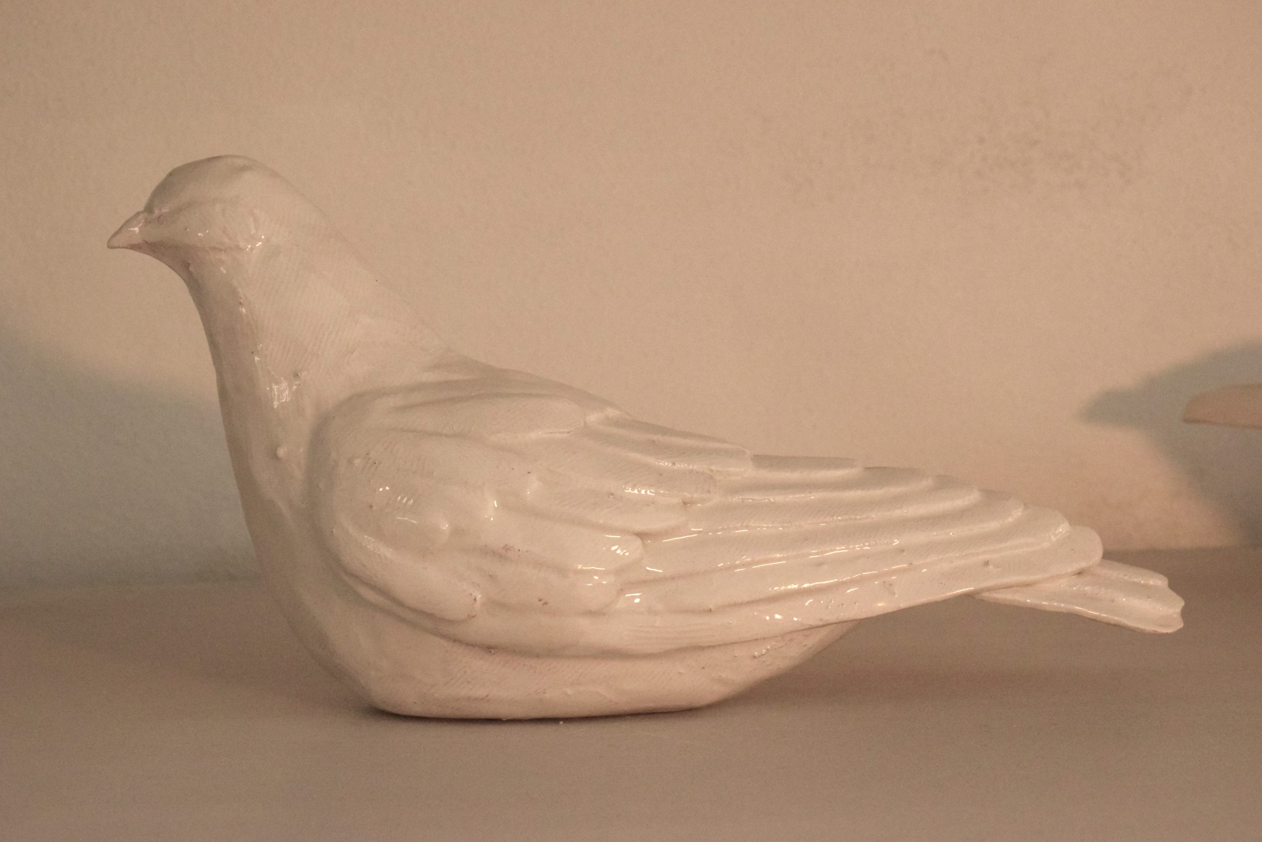 Questo piccione appartiene ad una serie di sculture realizzate per un’installazione. Sono invadenti, fastidiosi, entrano nei locali, salgono sulle statue, gli edifici, i davanzali, ovunque sentano un po' di tepore o dove ci sia un po' di cibo. Siamo abituati a vedere il piccione come qualcosa di sporco, di polveroso, da cacciare e tenere lontano dalle case. In questa scultura l’immagine del piccione è ribaltata, non siamo noi vittime degli sfacciati piccioni ma sono loro le vittime del cambiamento che ha prodotto l’uomo sull’ambiente. Allontanati dalla terra sono ora bianchi simbolo di un equilibrio che è stato modificato e che resta indelebile. Il piccione è stato realizzato in argilla rossa, argilla bianca e cristallina trasparente, occupa una superficie di ventotto centimetri di lunghezza per nove di larghezza e tredici di altezza. Il “Piccione” è un pezzo unico, non esiste una copia identica per forma, dimensione e colore all’originale.