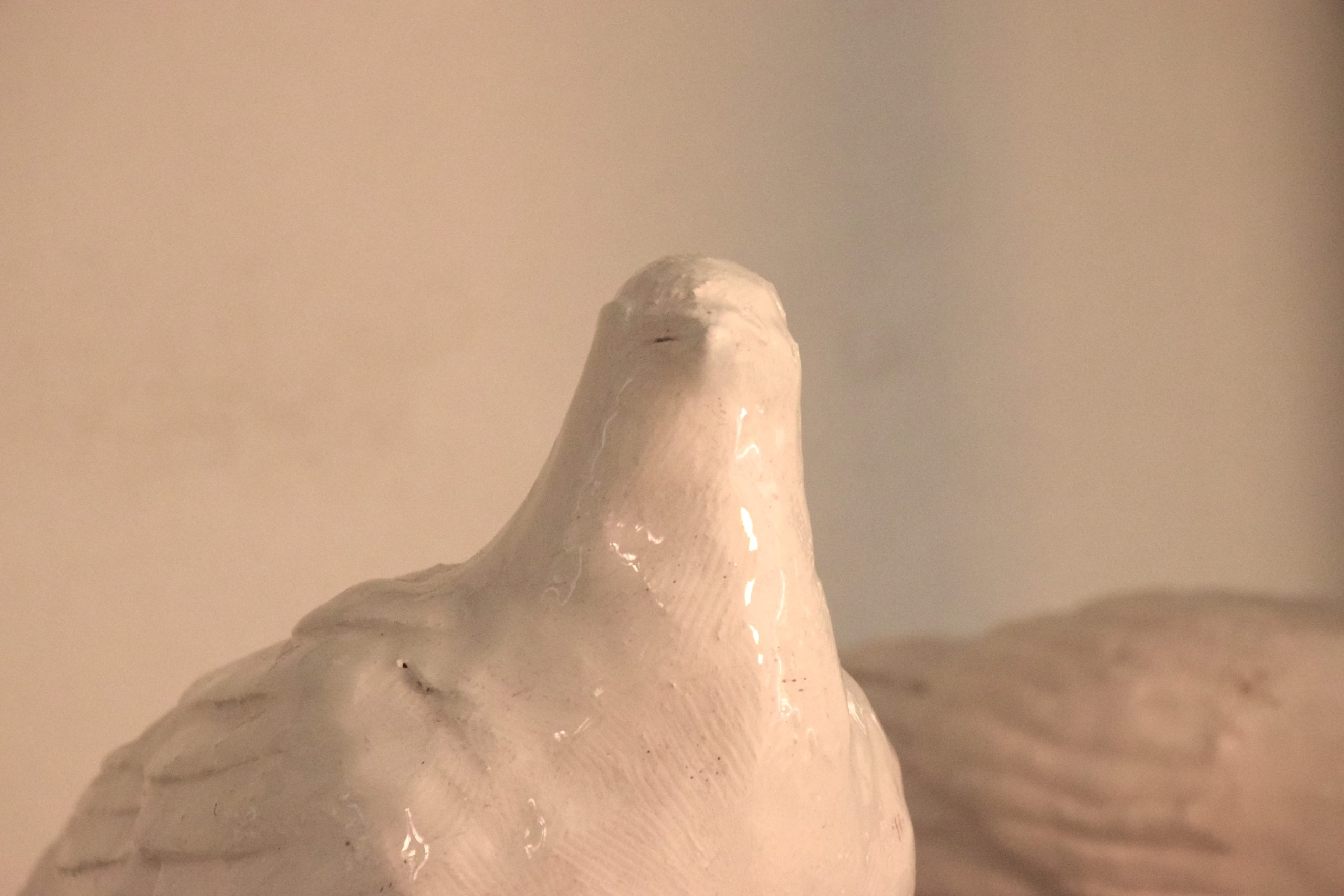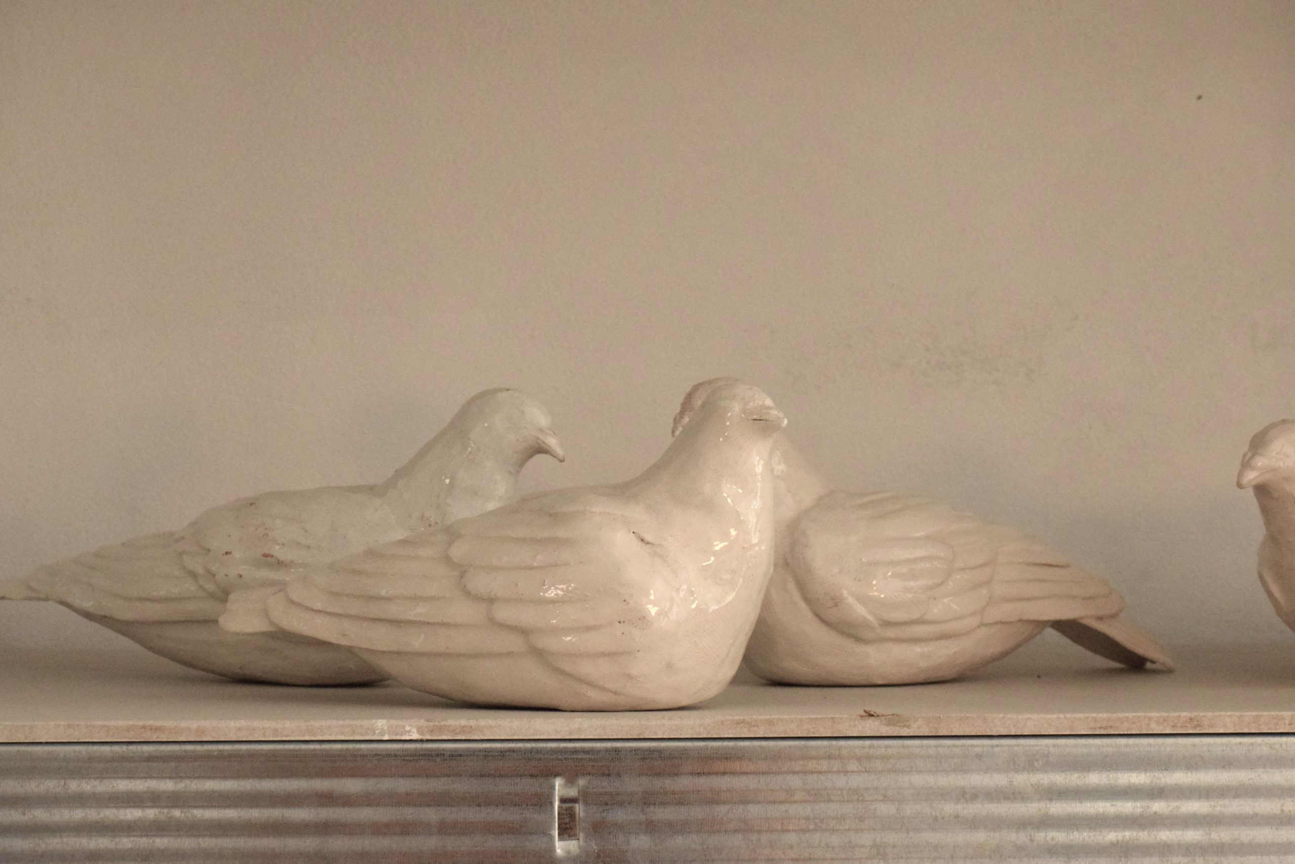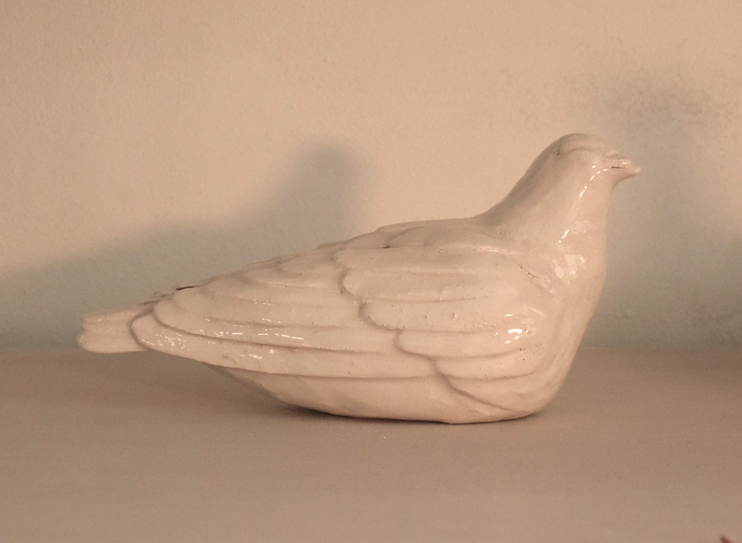 Questo piccione appartiene ad una serie di sculture realizzate per un’installazione. Sono invadenti, fastidiosi, entrano nei locali, salgono sulle statue, gli edifici, i davanzali, ovunque sentano un po' di tepore o dove ci sia un po' di cibo. Siamo abituati a vedere il piccione come qualcosa di sporco, di polveroso, da cacciare e tenere lontano dalle case. In questa scultura l’immagine del piccione è ribaltata, non siamo noi vittime degli sfacciati piccioni ma sono loro le vittime del cambiamento che ha prodotto l’uomo sull’ambiente. Allontanati dalla terra sono ora bianchi simbolo di un equilibrio che è stato modificato e che resta indelebile. Il piccione è stato realizzato in argilla rossa, argilla bianca e cristallina trasparente, occupa una superficie di venticinque centimetri di lunghezza per nove di larghezza e dieci di altezza. Il “Piccione” è un pezzo unico, non esiste una copia identica per forma, dimensione e colore all’originale.