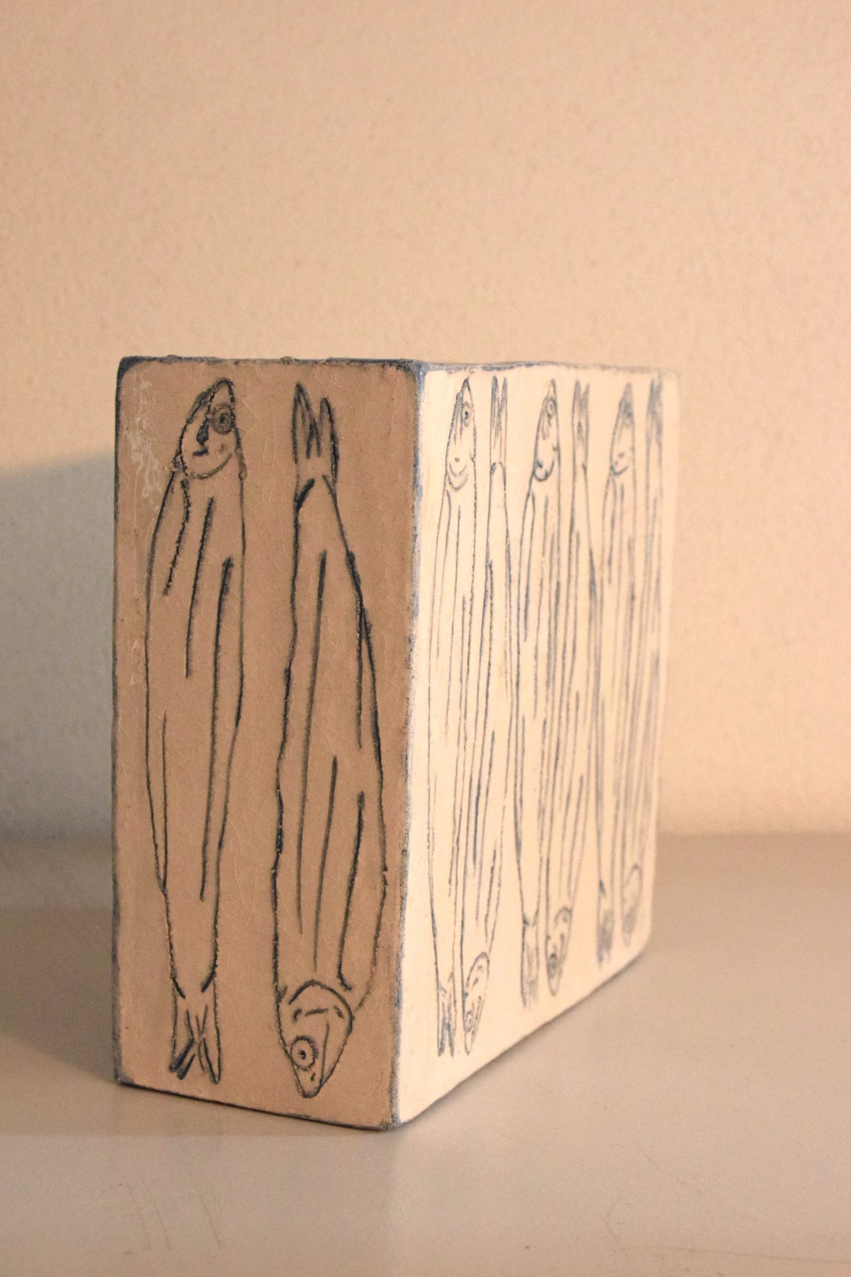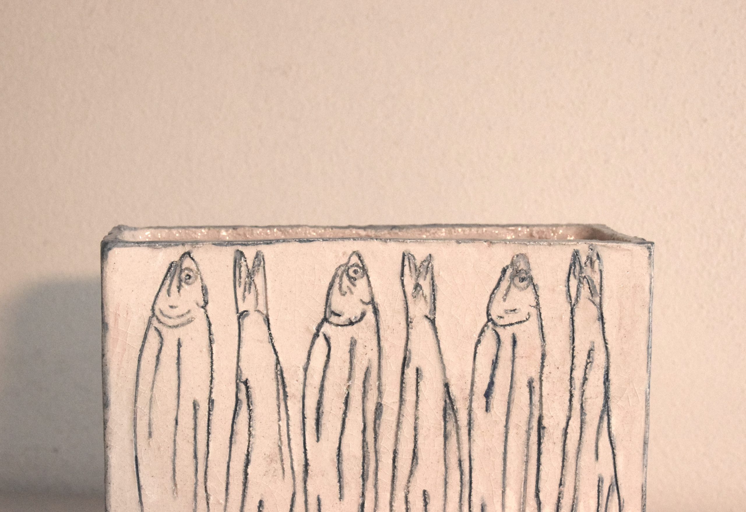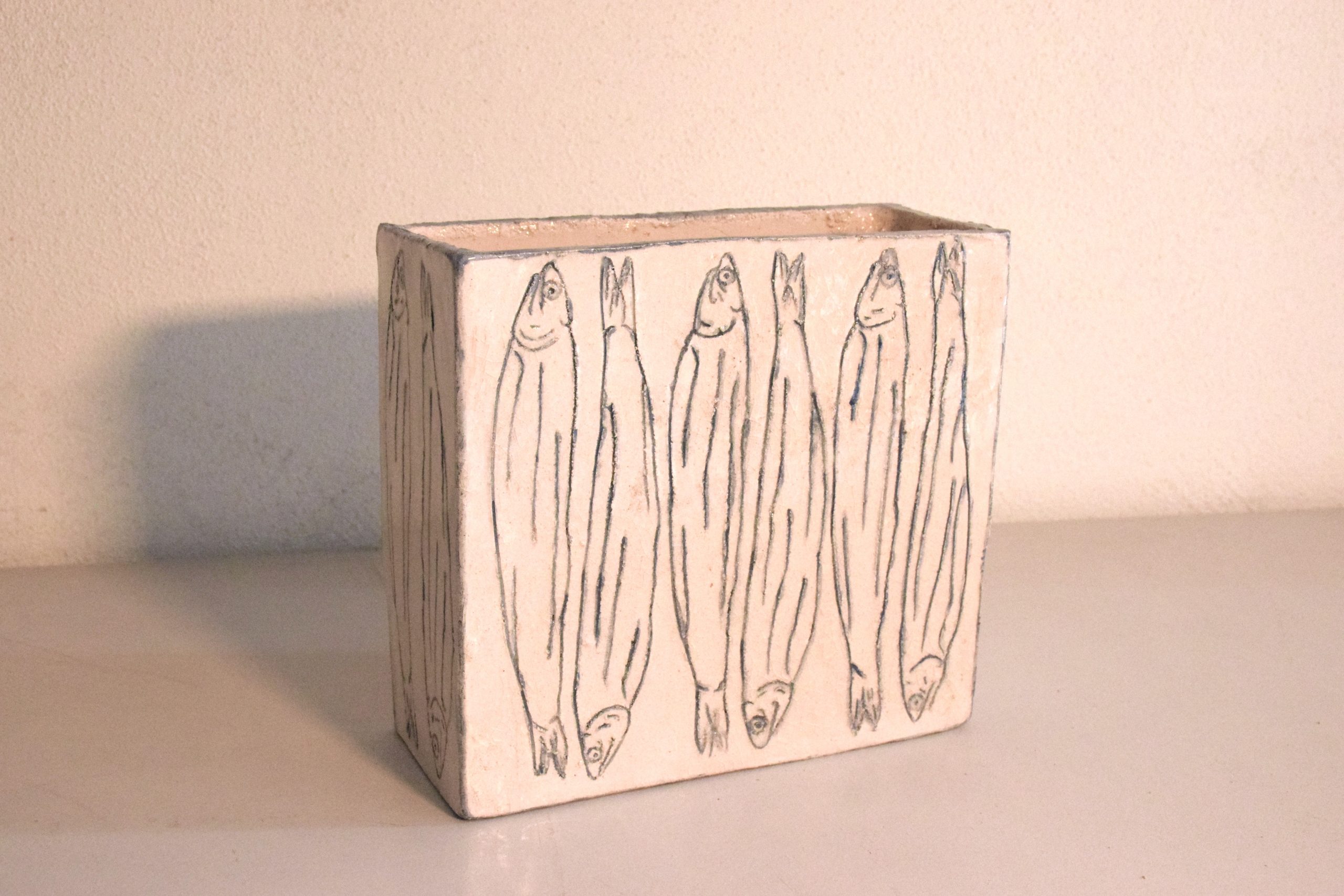 Il vaso è stato realizzato incidendo la terra e nel solco creato è stato messo in un secondo momento il colore. Sono frammenti, la stessa immagine ripetuta, un attimo che resta indelebile. Ogni disegno è stato inciso a mano, sono sedici acciughe una larghezza di ventiquattro per sette centimetri e un’altezza di venti centimetri. Il “Vaso con acciughe” è un pezzo unico, non esiste una copia identica per forma, dimensione e colore all’originale.