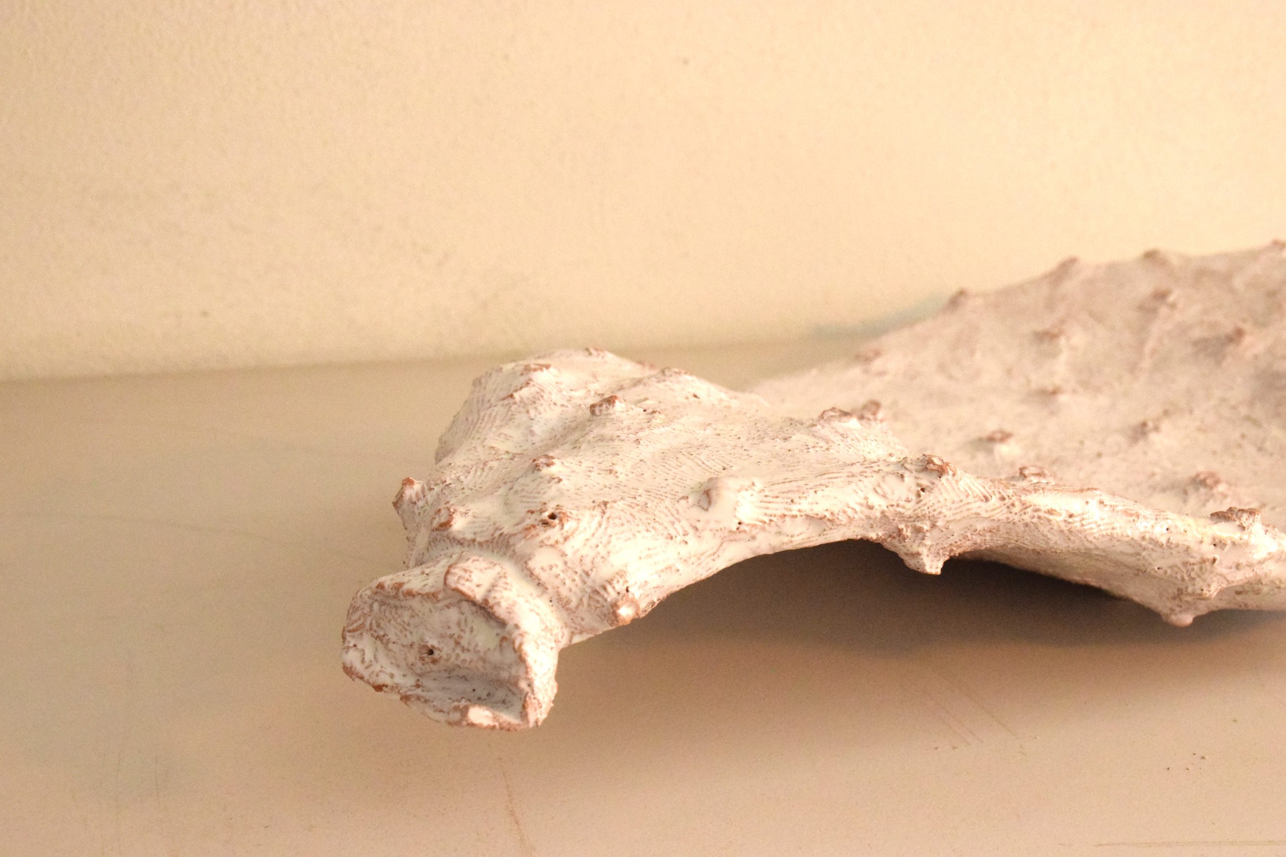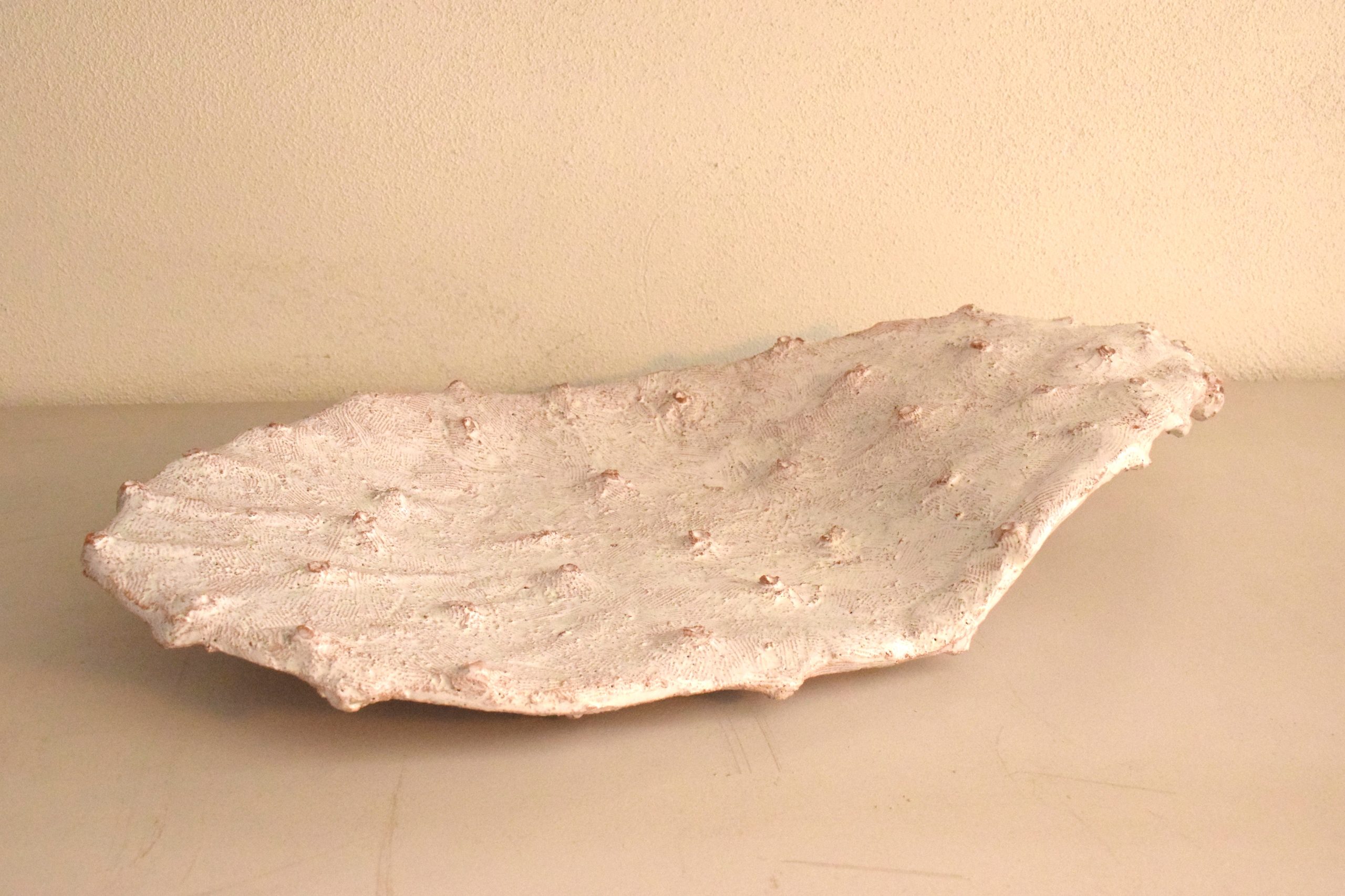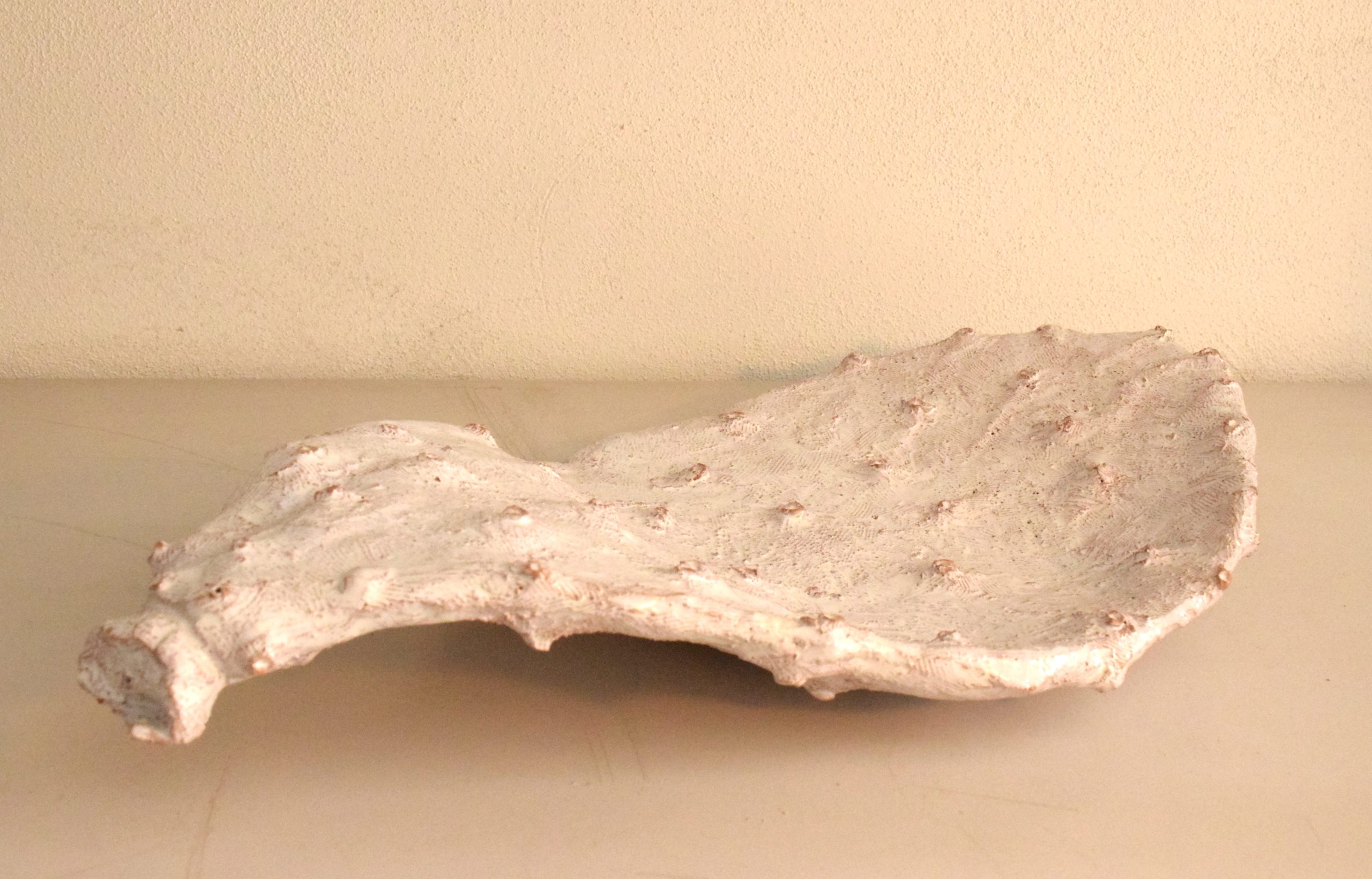 Queste enormi foglie a volte a causa del peso o semplicemente di un urto o del vento si staccano e cadono a terra. Non muoiono, è l’inizio di una nuova vita, da lì si genera un’altra pianta. Questa foglia è l’inizio di un progetto, di un’idea che vede come protagonista questa splendida pianta. La “pala” è stata realizzata completamente a mano con argilla rossa e smalto, ha una larghezza di trentasei per ventuno centimetri e un’altezza di sedici centimetri. La “Pala di fico d’india” è un pezzo unico, non esiste una copia identica per forma, dimensione e colore all’originale.