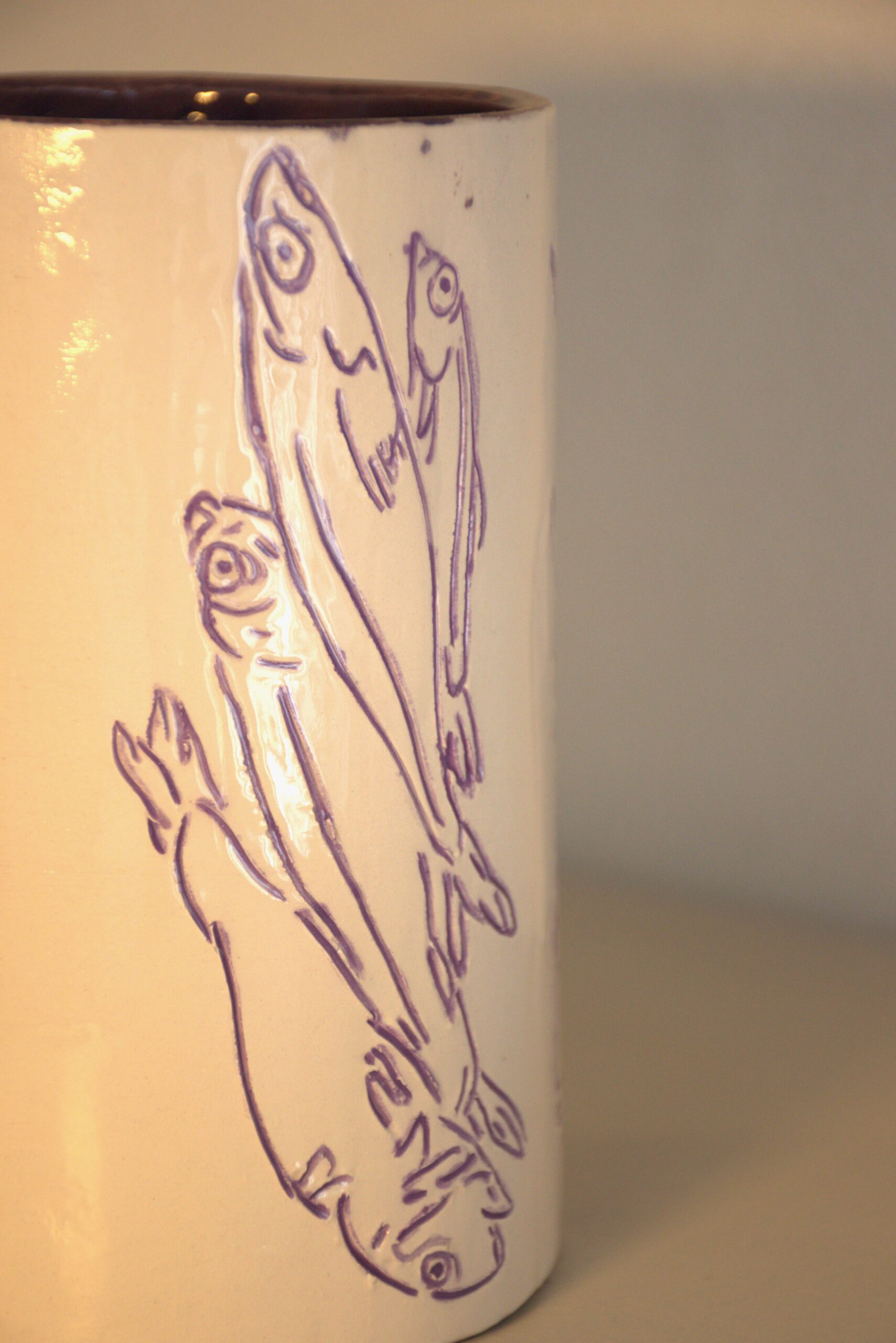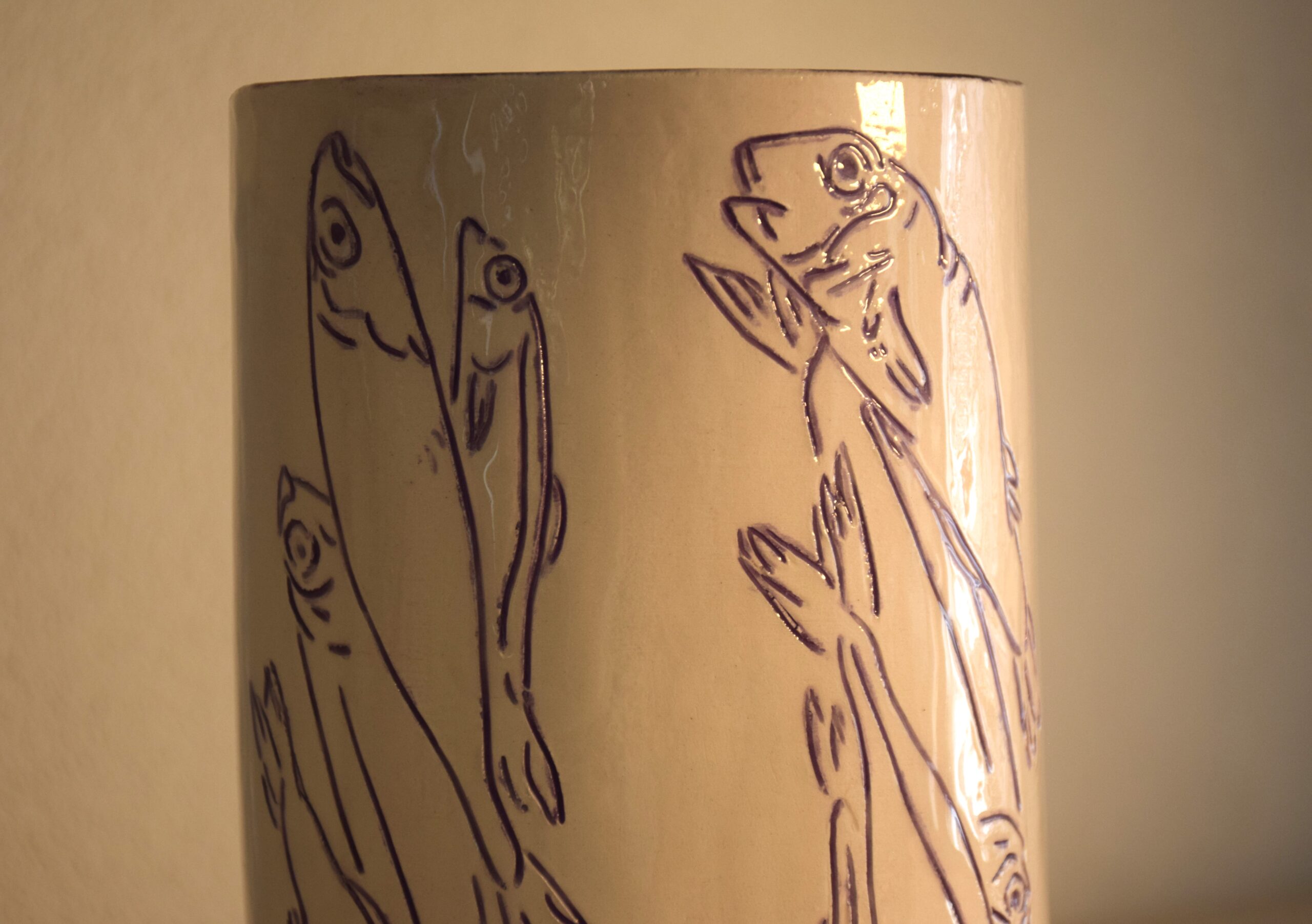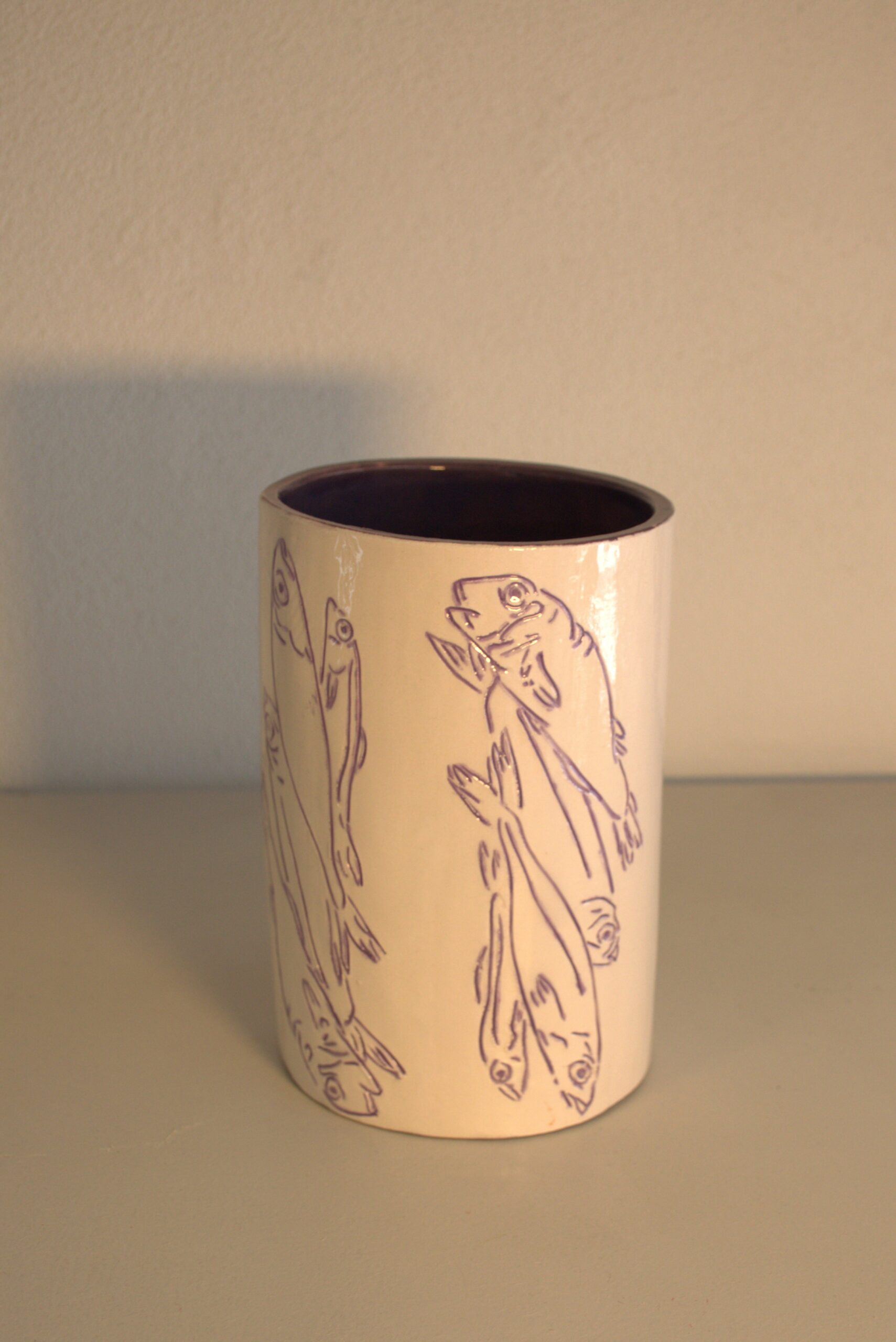 Il vaso è stato realizzato incidendo la terra e nel solco creato è stato messo in un secondo momento il colore. Sono frammenti, la stessa immagine ripetuta, un attimo, un ricordo che resta indelebile. Dei pesci fotografati all’interno di un piatto poco prima di essere cucinati sono pronti per accogliere al loro interno dei fiori, ma quale fiore porta il profumo dei pesci e del mare? Si capovolge il ruolo dei pesci che, solitamente contenuti all’interno di scatolette, diventano contenitori. Ogni disegno è stato realizzato a mano, si compone sedici pesci incisi su una superficie di sedici centimetri di altezza, dieci centimetri di larghezza e dieci centimetri di profondità. Il “Vasetto con pesci” è un pezzo unico, non esiste una copia identica per forma, dimensione e colore dell’originale.