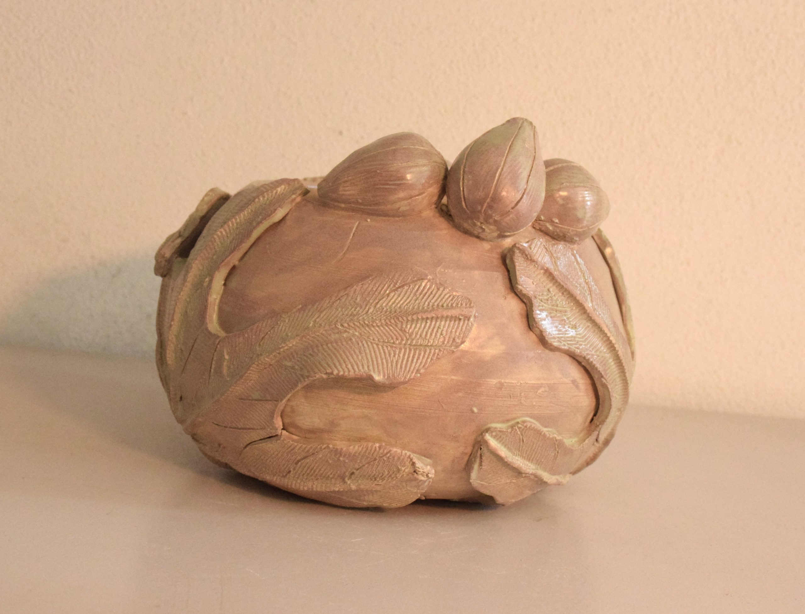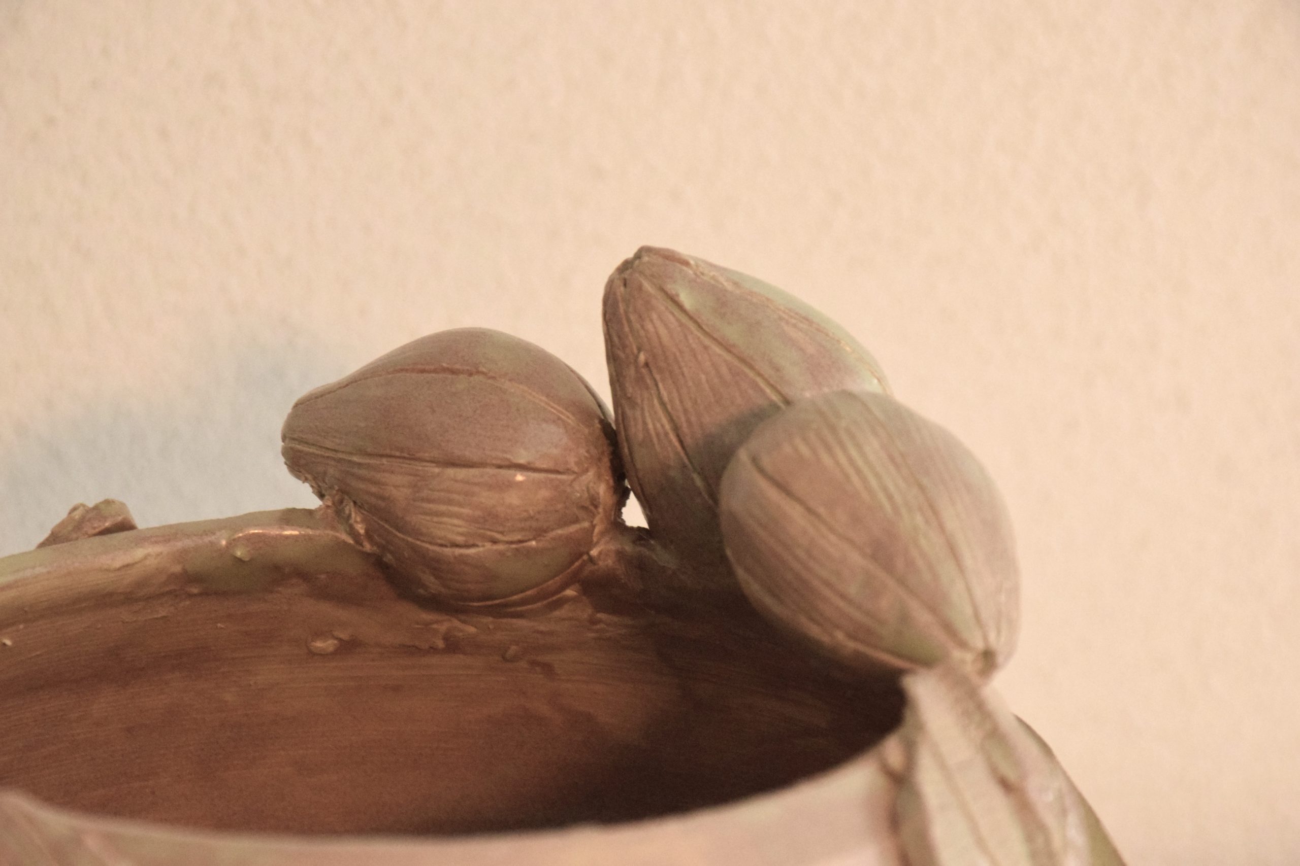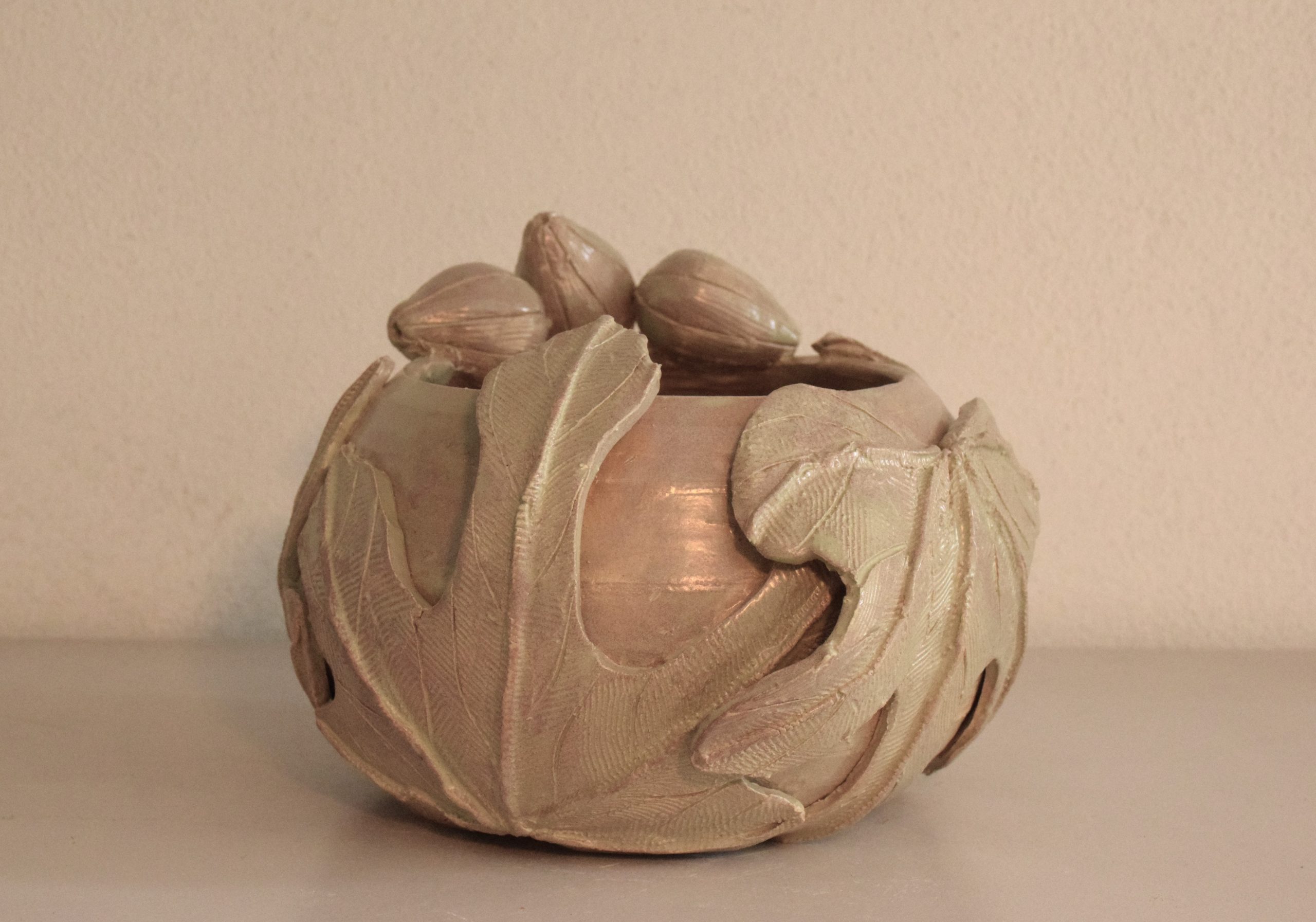Ogni foglia e fico sono stati realizzati a mano a creare una natura morta che vuole essere memoria di una passeggiata in campagna. Un fico dai frutti zuccherini che attraggono le api. Il caldo estivo che va man mano esaurendosi nell’autunno, le foglie ruvide e la frutta che incolla le mani. Il vaso è stato realizzato in argilla bianca e smalto, si compone di quattro foglie e nove fichi per un diametro di venti centimetri e un’altezza di tredici centimetri. Il “Vaso con fichi e foglie” è un pezzo unico, non esiste una copia identica per forma, dimensione e colore all’originale.