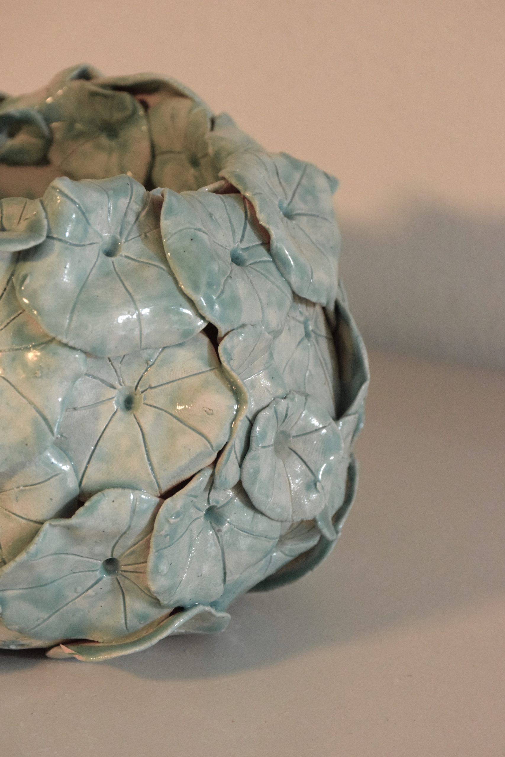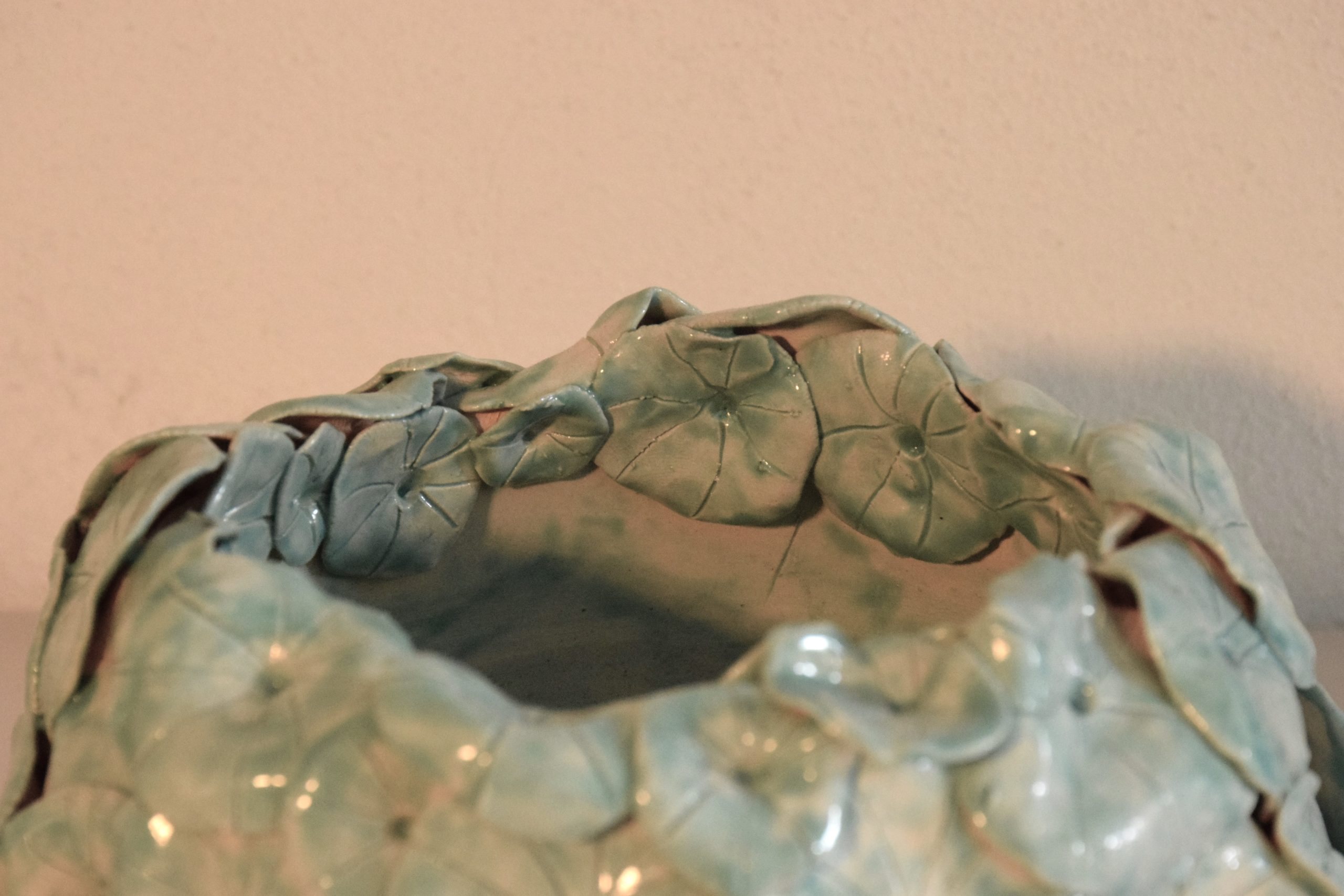 Ogni foglia sono stati realizzati a mano e composta a creare una forma che ricordasse un cespuglio di nasturzio. Con questo vaso dalla forma irregolare si vuole ricreare il movimento delle foglie di nasturzio quando le muove il vento e sembrano danzare appese a sottili steli. È stato realizzato in argilla bianca e smalto, si compone di più di cinquanta foglie per un diametro di diciassette centimetri e un’altezza di dieci centimetri. Il “Vaso con foglie di nasturzio” è un pezzo unico, non esiste una copia identica per forma, dimensione e colore all’originale.